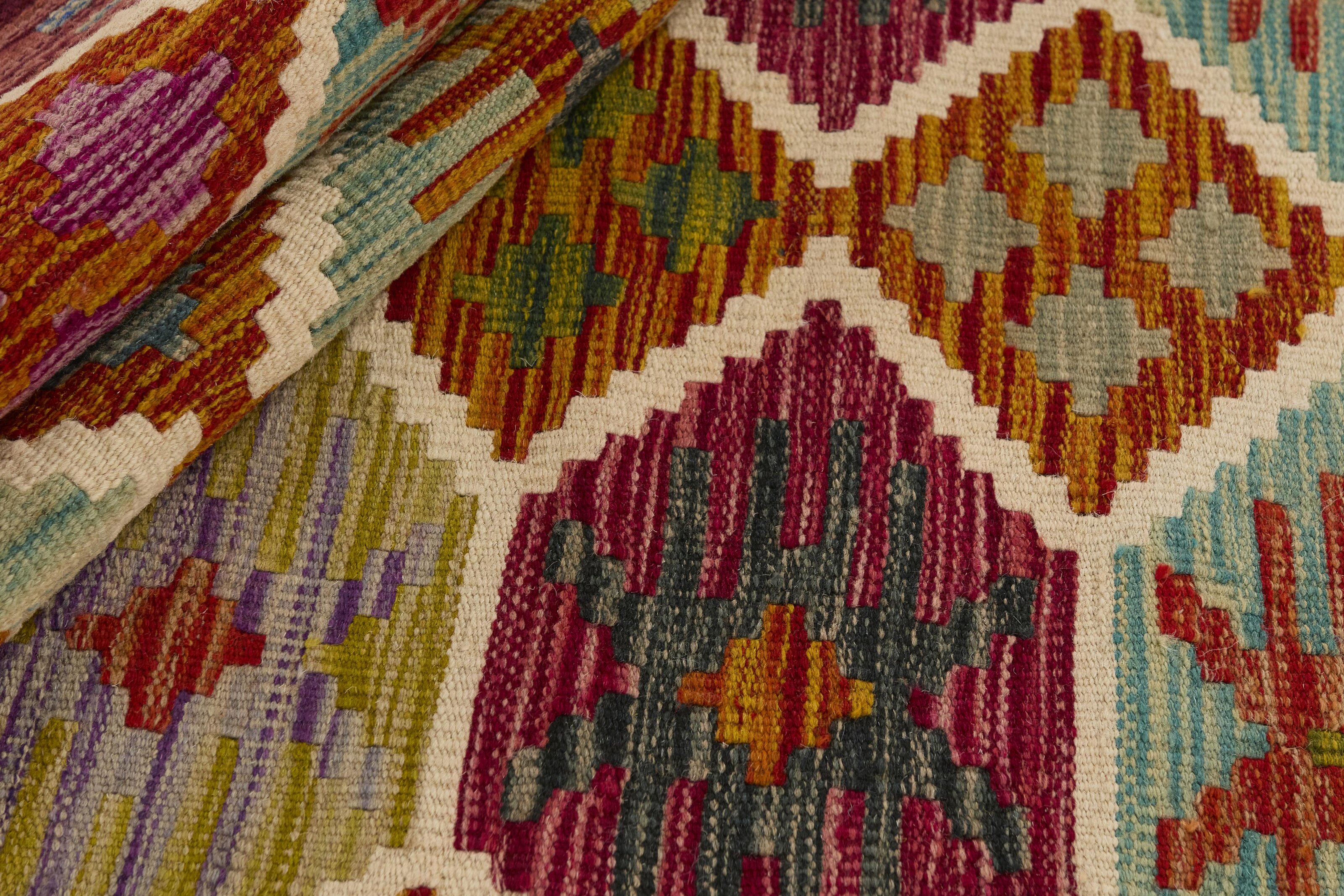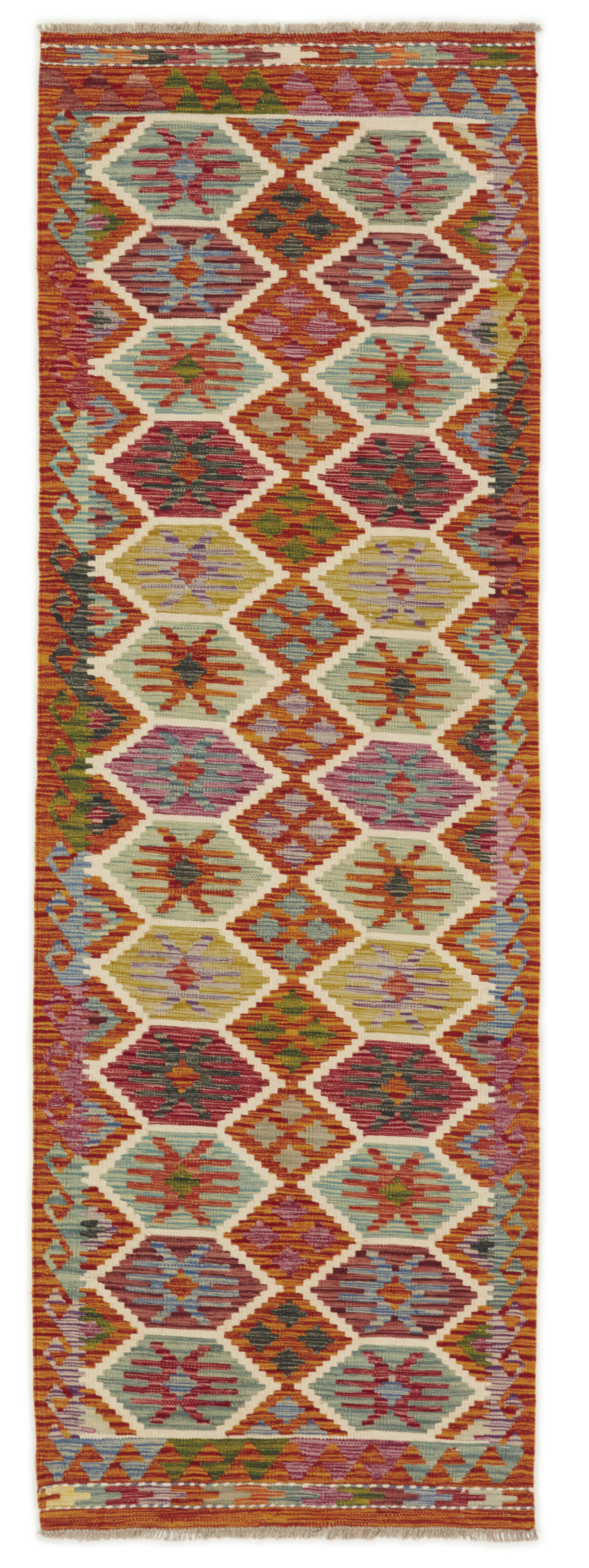 Afghan KelimItem no.: 1520959 Size: 84 cm x 249 cmAfghan Kelim rugs are hand woven by Turkmens in northern Afghanistan. Kelim is the name of a common Persian weave, but also of the technology used in the production. Kelims are primarily produced by nomads and are pile-less rugs, which are also used for bags, as wall decoration, or as curtains for tents. A natural colour scale with geometrical symbols and octagons is used.