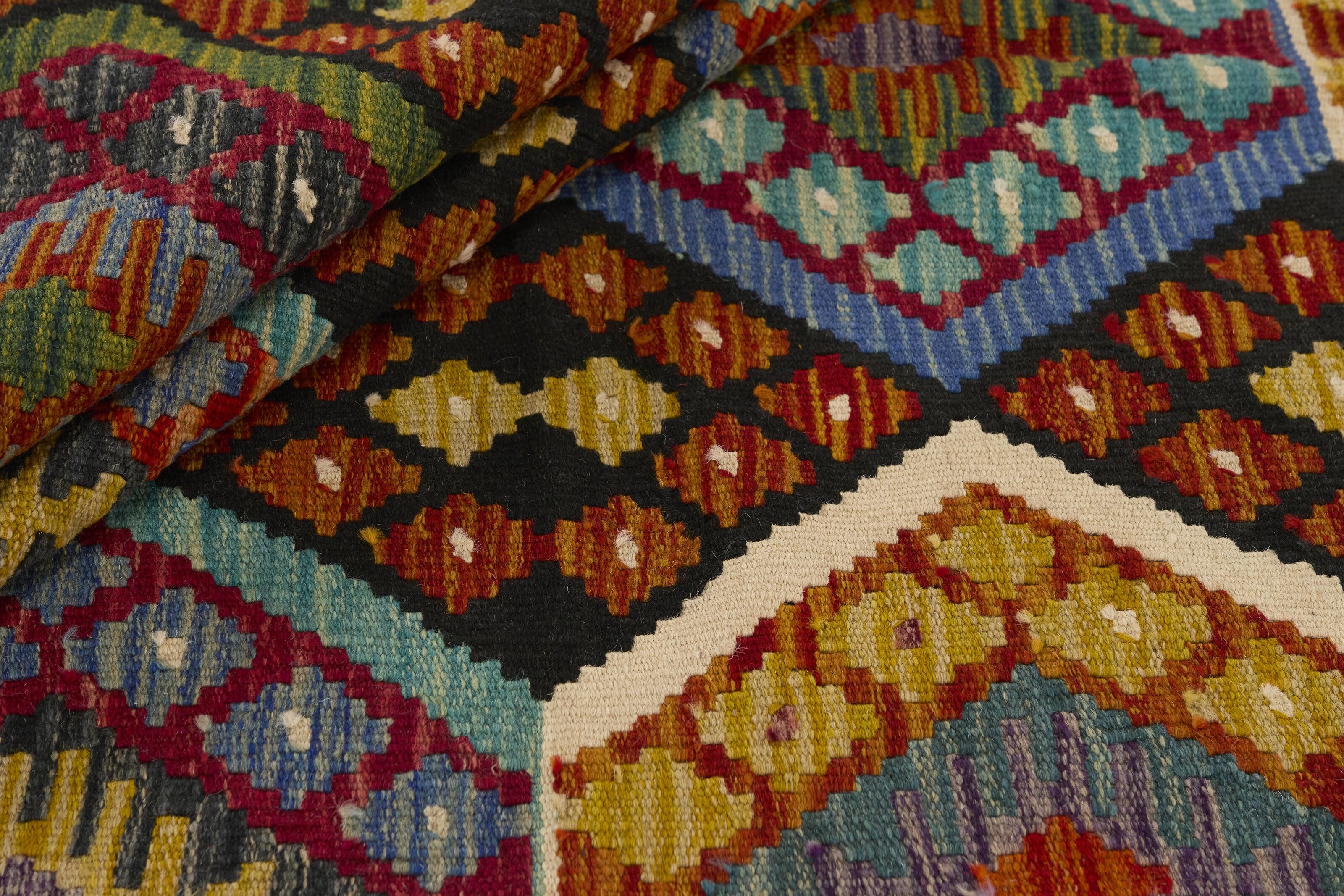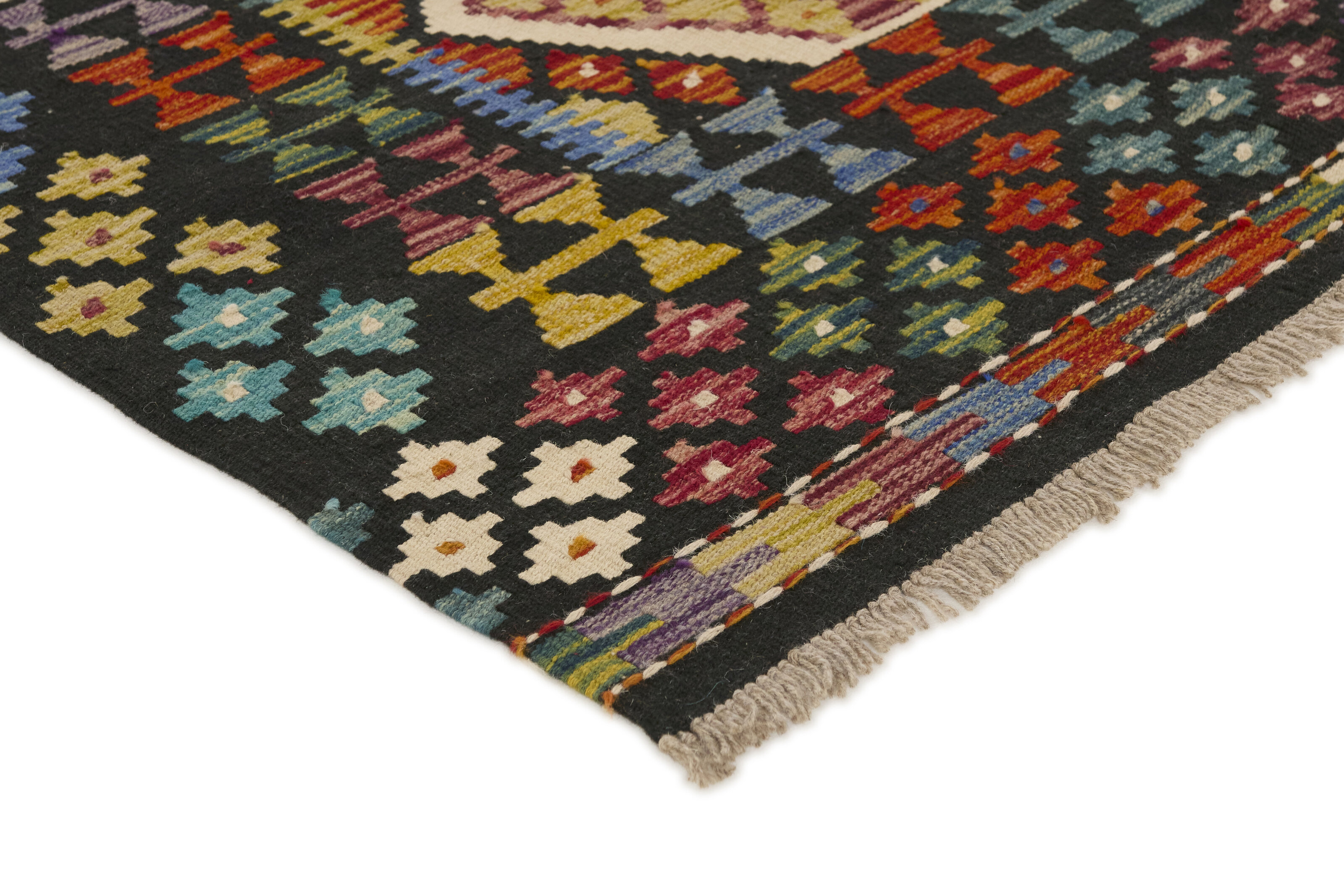 Afghan KelimItem no.: 1520961 Size: 175 cm x 249 cmAfghan Kelim rugs are hand woven by Turkmens in northern Afghanistan. Kelim is the name of a common Persian weave, but also of the technology used in the production. Kelims are primarily produced by nomads and are pile-less rugs, which are also used for bags, as wall decoration, or as curtains for tents. A natural colour scale with geometrical symbols and octagons is used.
