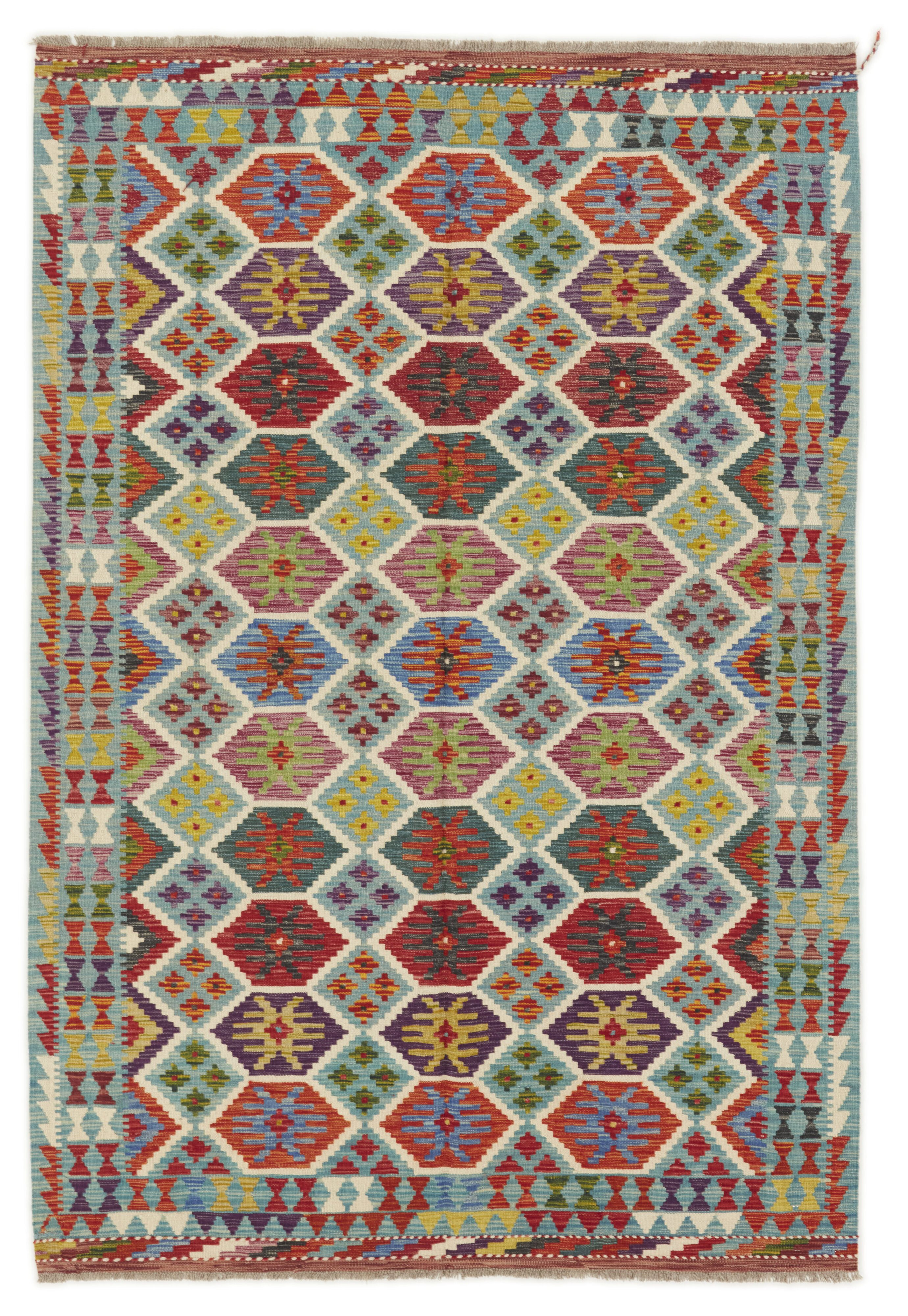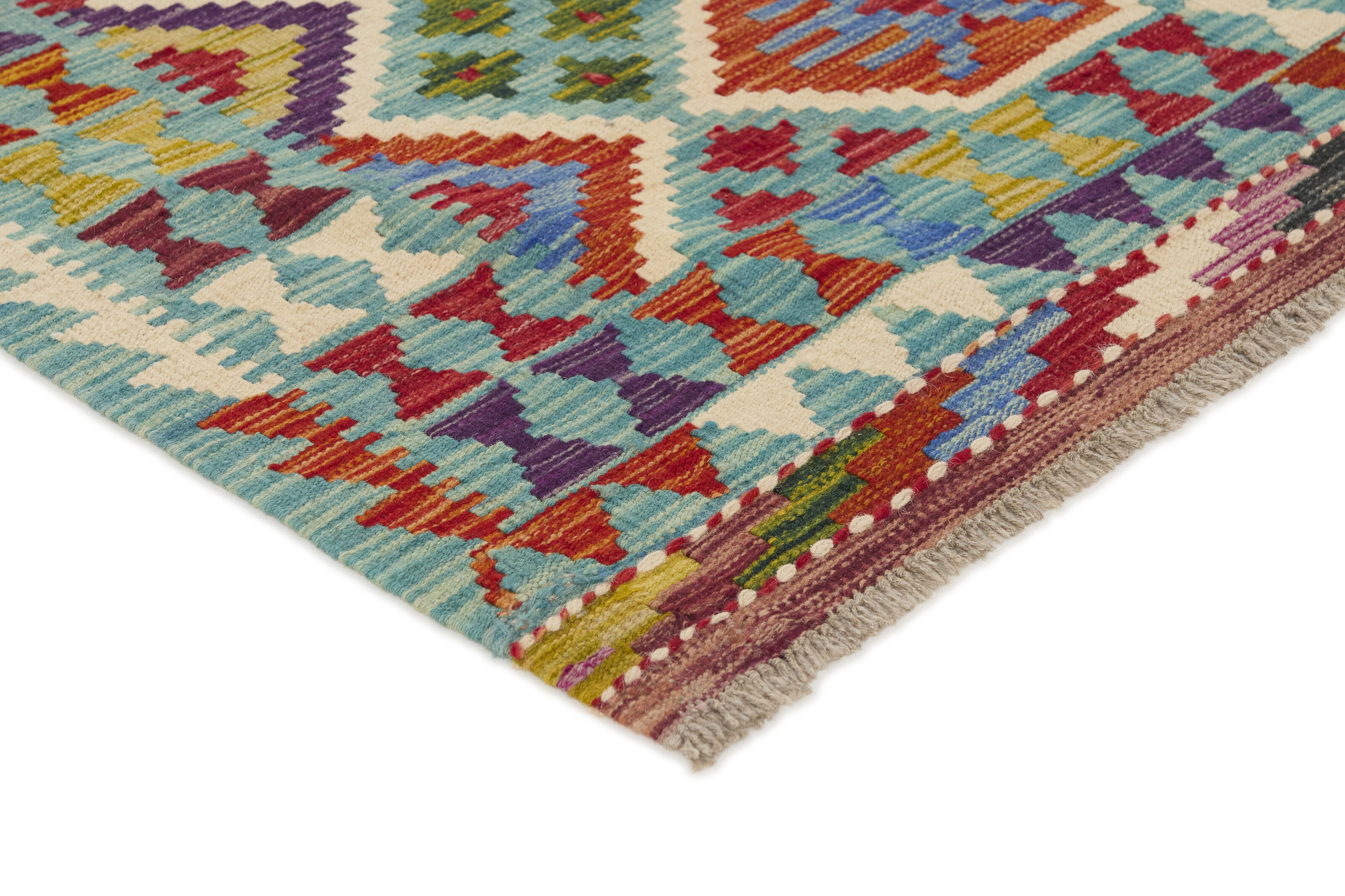 Afghan KelimItem no.: 1520963 Size: 169 cm x 250 cmAfghan Kelim rugs are hand woven by Turkmens in northern Afghanistan. Kelim is the name of a common Persian weave, but also of the technology used in the production. Kelims are primarily produced by nomads and are pile-less rugs, which are also used for bags, as wall decoration, or as curtains for tents. A natural colour scale with geometrical symbols and octagons is used.