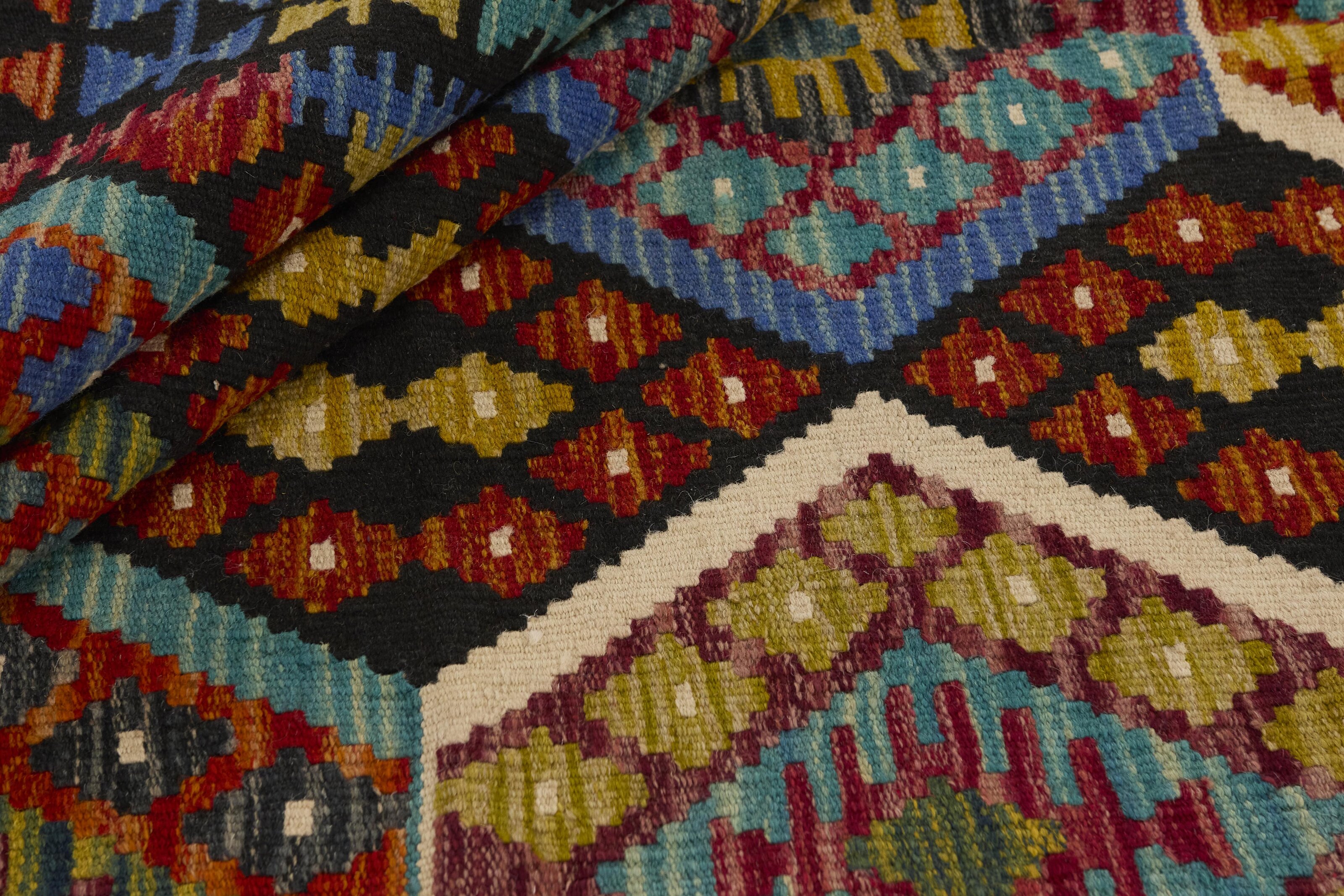 Afghan KelimItem no.: 1520966 Size: 176 cm x 252 cmAfghan Kelim rugs are hand woven by Turkmens in northern Afghanistan. Kelim is the name of a common Persian weave, but also of the technology used in the production. Kelims are primarily produced by nomads and are pile-less rugs, which are also used for bags, as wall decoration, or as curtains for tents. A natural colour scale with geometrical symbols and octagons is used.