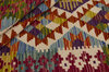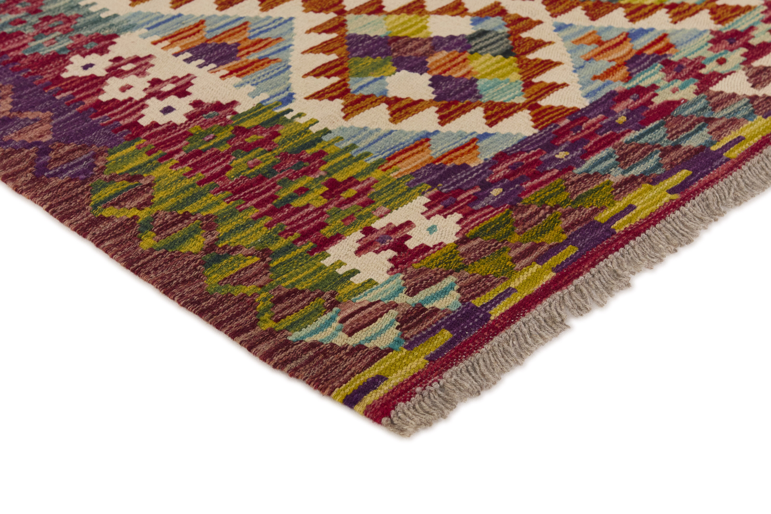 Afghan KelimItem no.: 1521369 Size: 98 cm x 151 cmAfghan Kelim rugs are hand woven by Turkmens in northern Afghanistan. Kelim is the name of a common Persian weave, but also of the technology used in the production. Kelims are primarily produced by nomads and are pile-less rugs, which are also used for bags, as wall decoration, or as curtains for tents. A natural colour scale with geometrical symbols and octagons is used.