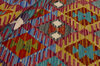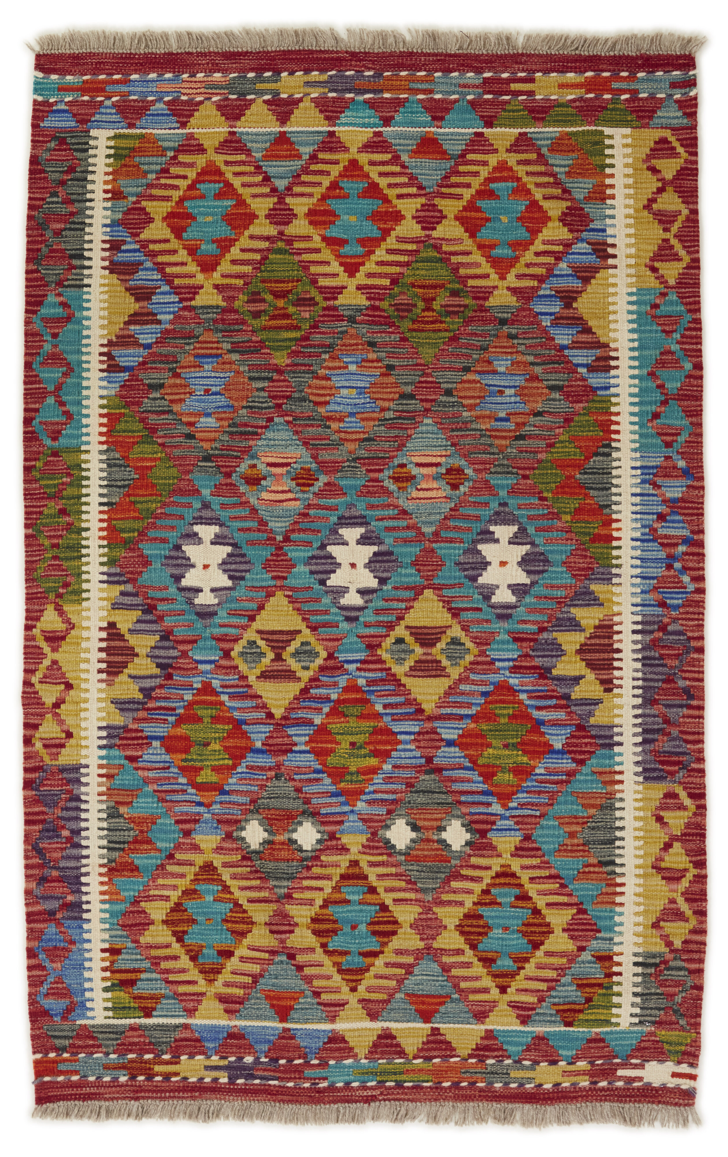 Afghan KelimItem no.: 1521371 Size: 99 cm x 152 cmAfghan Kelim rugs are hand woven by Turkmens in northern Afghanistan. Kelim is the name of a common Persian weave, but also of the technology used in the production. Kelims are primarily produced by nomads and are pile-less rugs, which are also used for bags, as wall decoration, or as curtains for tents. A natural colour scale with geometrical symbols and octagons is used.