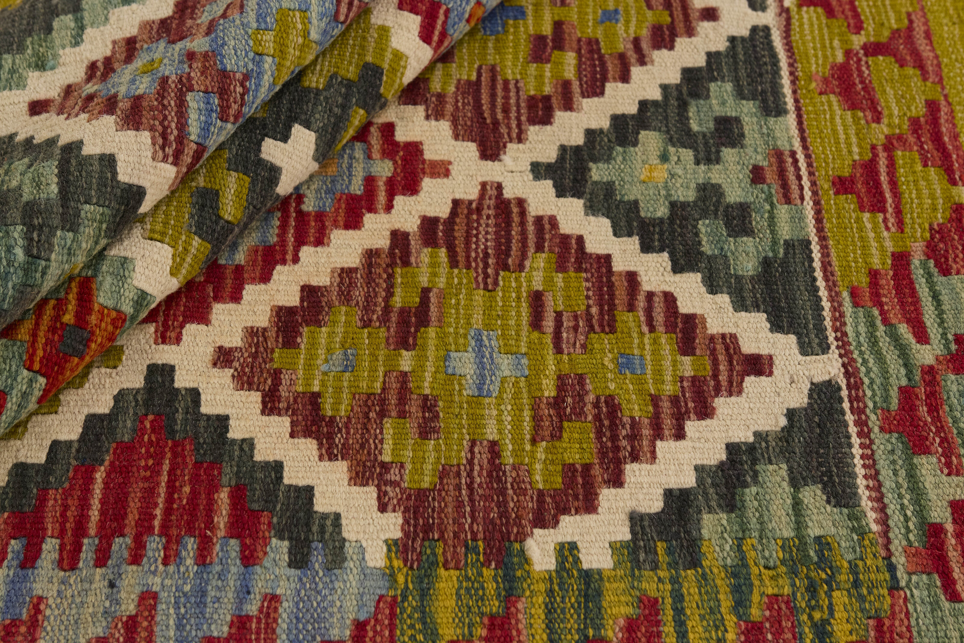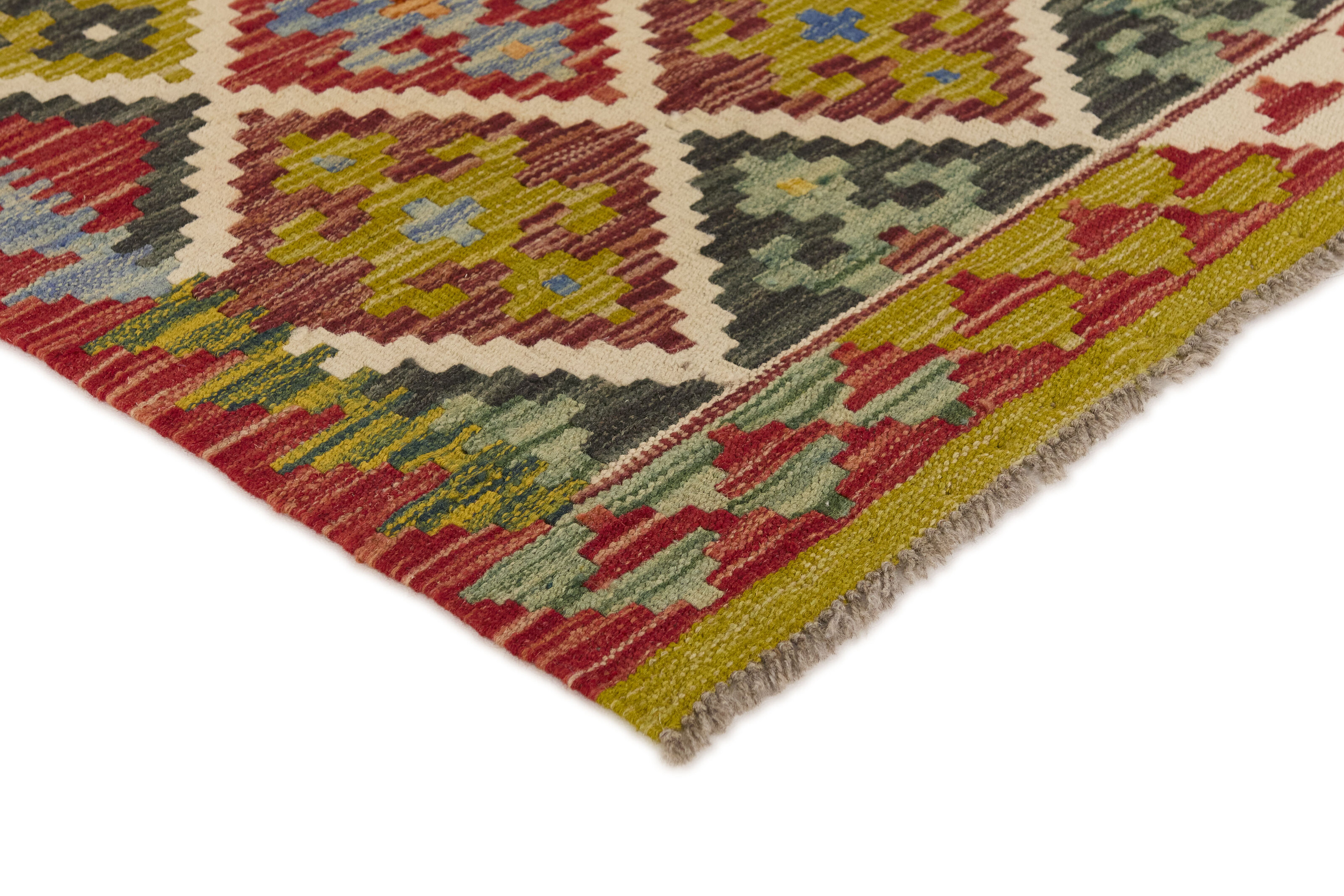 Afghan KelimItem no.: 1521390 Size: 84 cm x 119 cmAfghan Kelim rugs are hand woven by Turkmens in northern Afghanistan. Kelim is the name of a common Persian weave, but also of the technology used in the production. Kelims are primarily produced by nomads and are pile-less rugs, which are also used for bags, as wall decoration, or as curtains for tents. A natural colour scale with geometrical symbols and octagons is used.