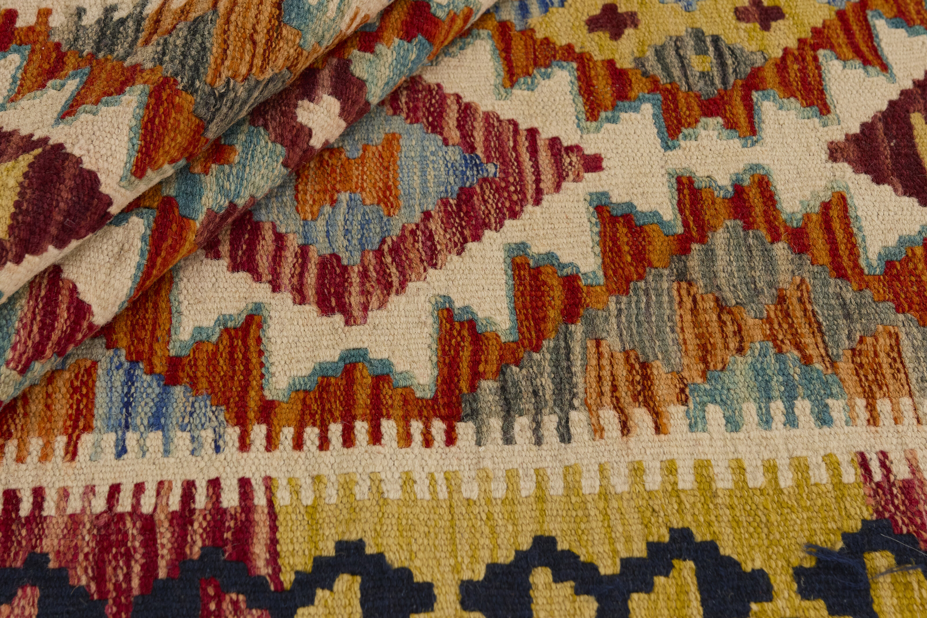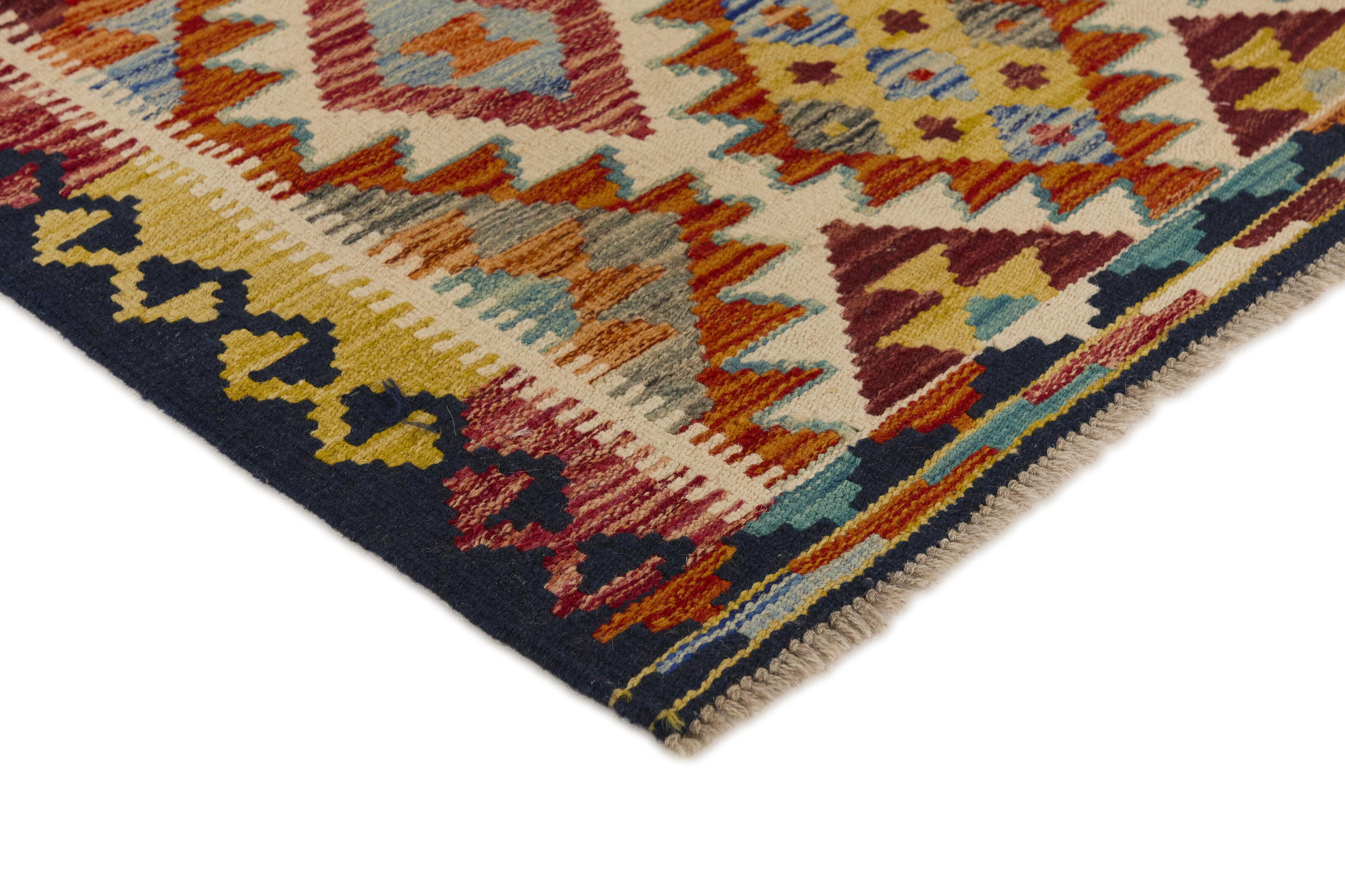 Afghan KelimItem no.: 1521392 Size: 84 cm x 124 cmAfghan Kelim rugs are hand woven by Turkmens in northern Afghanistan. Kelim is the name of a common Persian weave, but also of the technology used in the production. Kelims are primarily produced by nomads and are pile-less rugs, which are also used for bags, as wall decoration, or as curtains for tents. A natural colour scale with geometrical symbols and octagons is used.