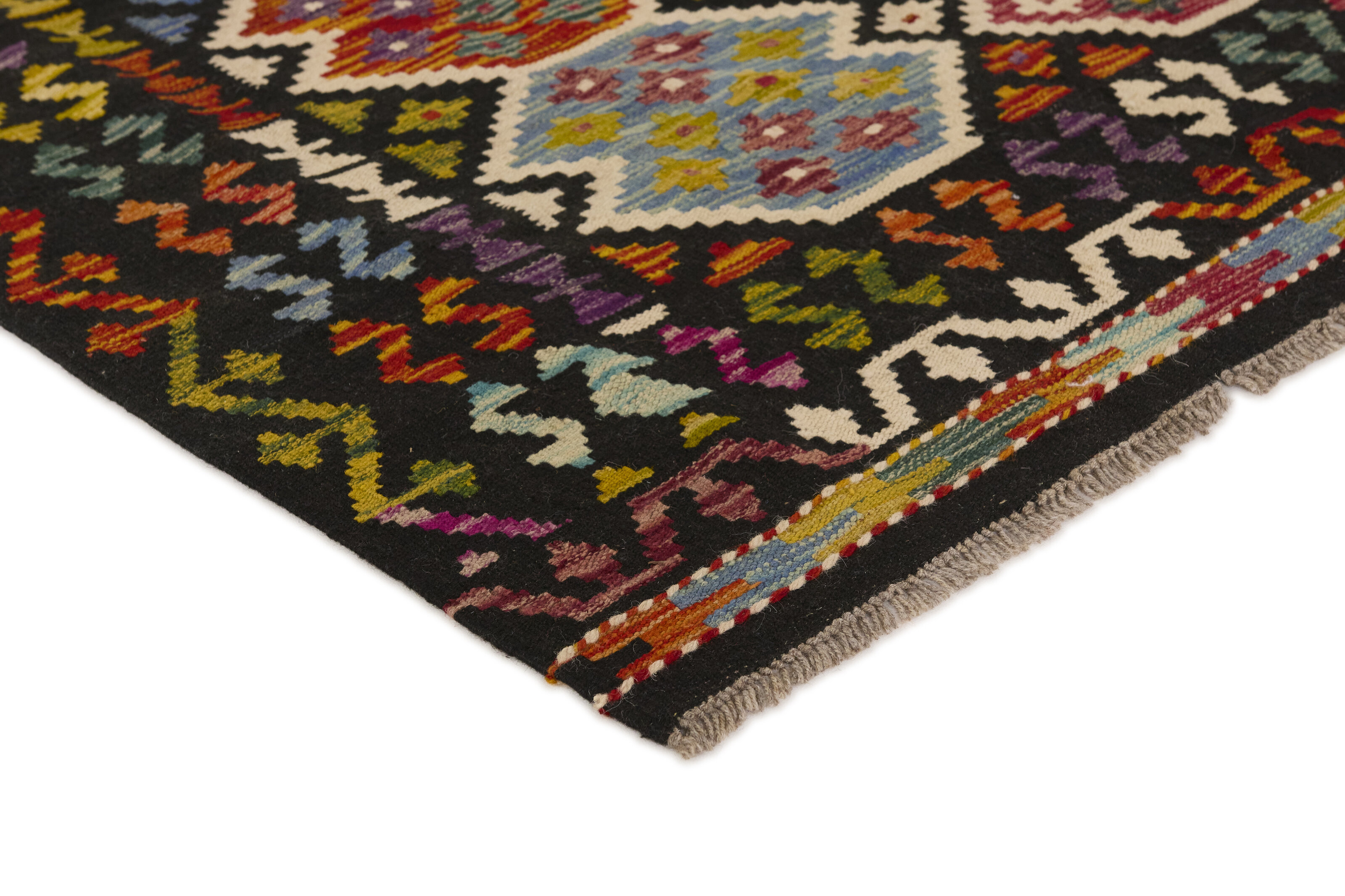 Afghan KelimItem no.: 1521400 Size: 122 cm x 178 cmAfghan Kelim rugs are hand woven by Turkmens in northern Afghanistan. Kelim is the name of a common Persian weave, but also of the technology used in the production. Kelims are primarily produced by nomads and are pile-less rugs, which are also used for bags, as wall decoration, or as curtains for tents. A natural colour scale with geometrical symbols and octagons is used.