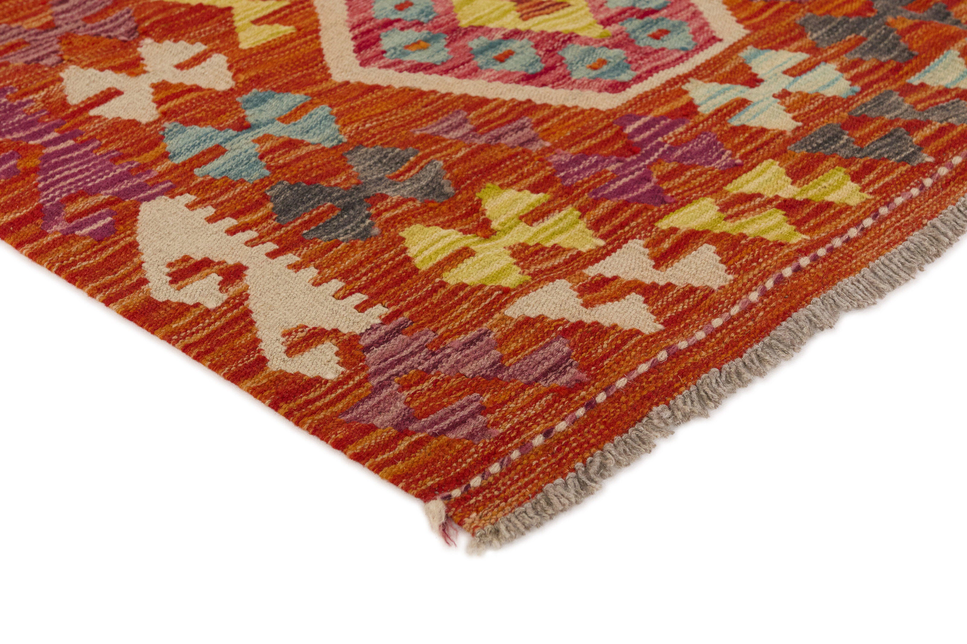 Afghan KelimItem no.: 1521401 Size: 122 cm x 180 cmAfghan Kelim rugs are hand woven by Turkmens in northern Afghanistan. Kelim is the name of a common Persian weave, but also of the technology used in the production. Kelims are primarily produced by nomads and are pile-less rugs, which are also used for bags, as wall decoration, or as curtains for tents. A natural colour scale with geometrical symbols and octagons is used.
