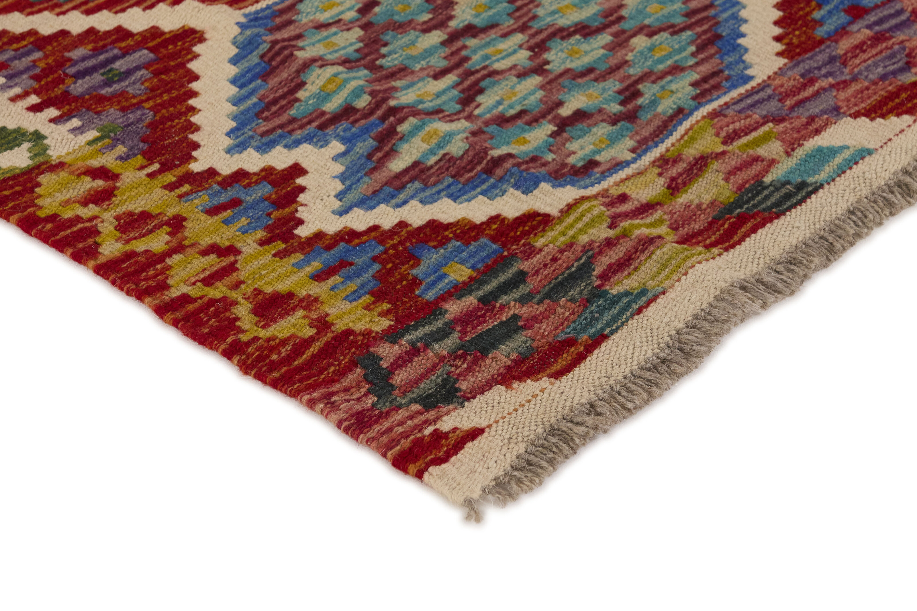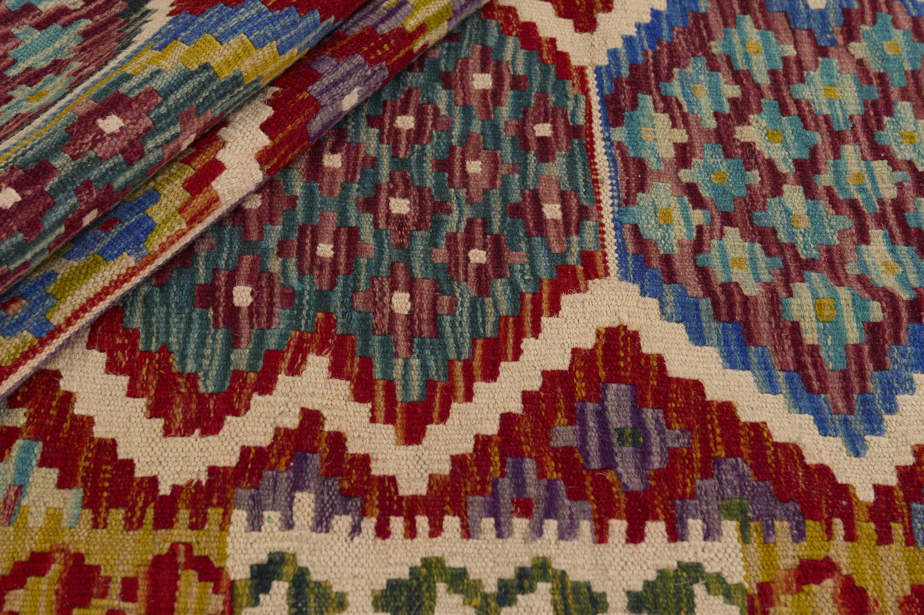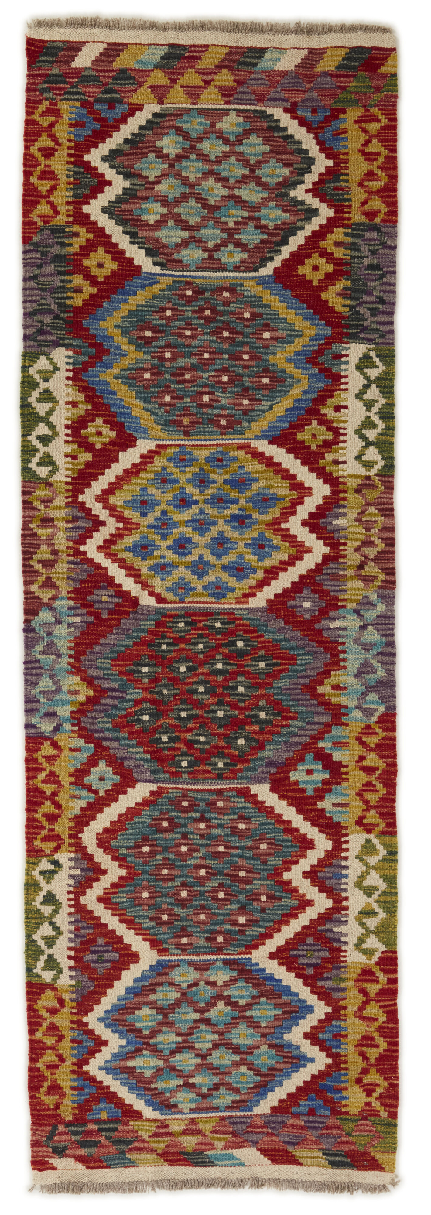 Afghan KelimItem no.: 1521413 Size: 63 cm x 193 cmAfghan Kelim rugs are hand woven by Turkmens in northern Afghanistan. Kelim is the name of a common Persian weave, but also of the technology used in the production. Kelims are primarily produced by nomads and are pile-less rugs, which are also used for bags, as wall decoration, or as curtains for tents. A natural colour scale with geometrical symbols and octagons is used.