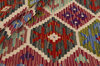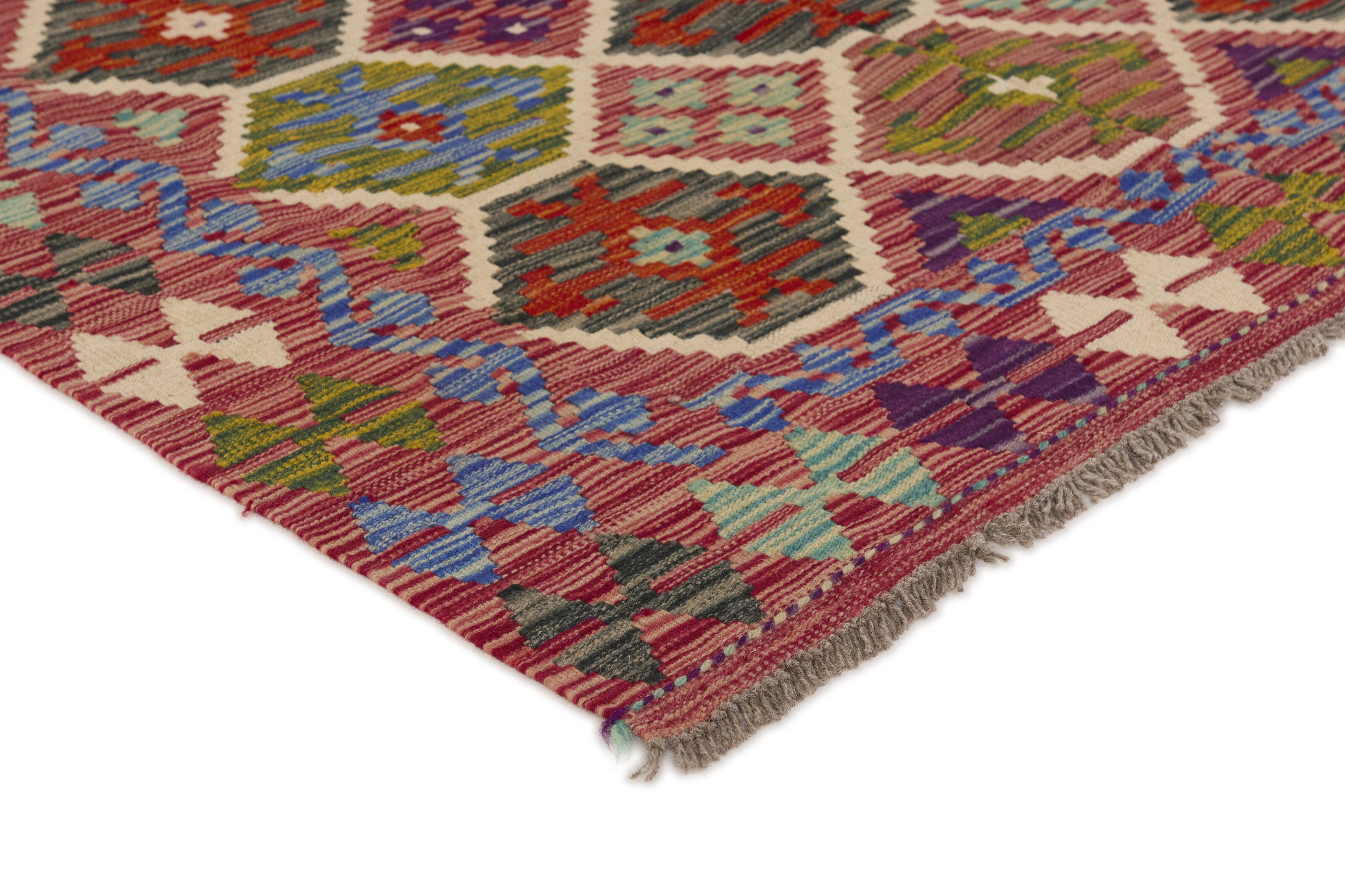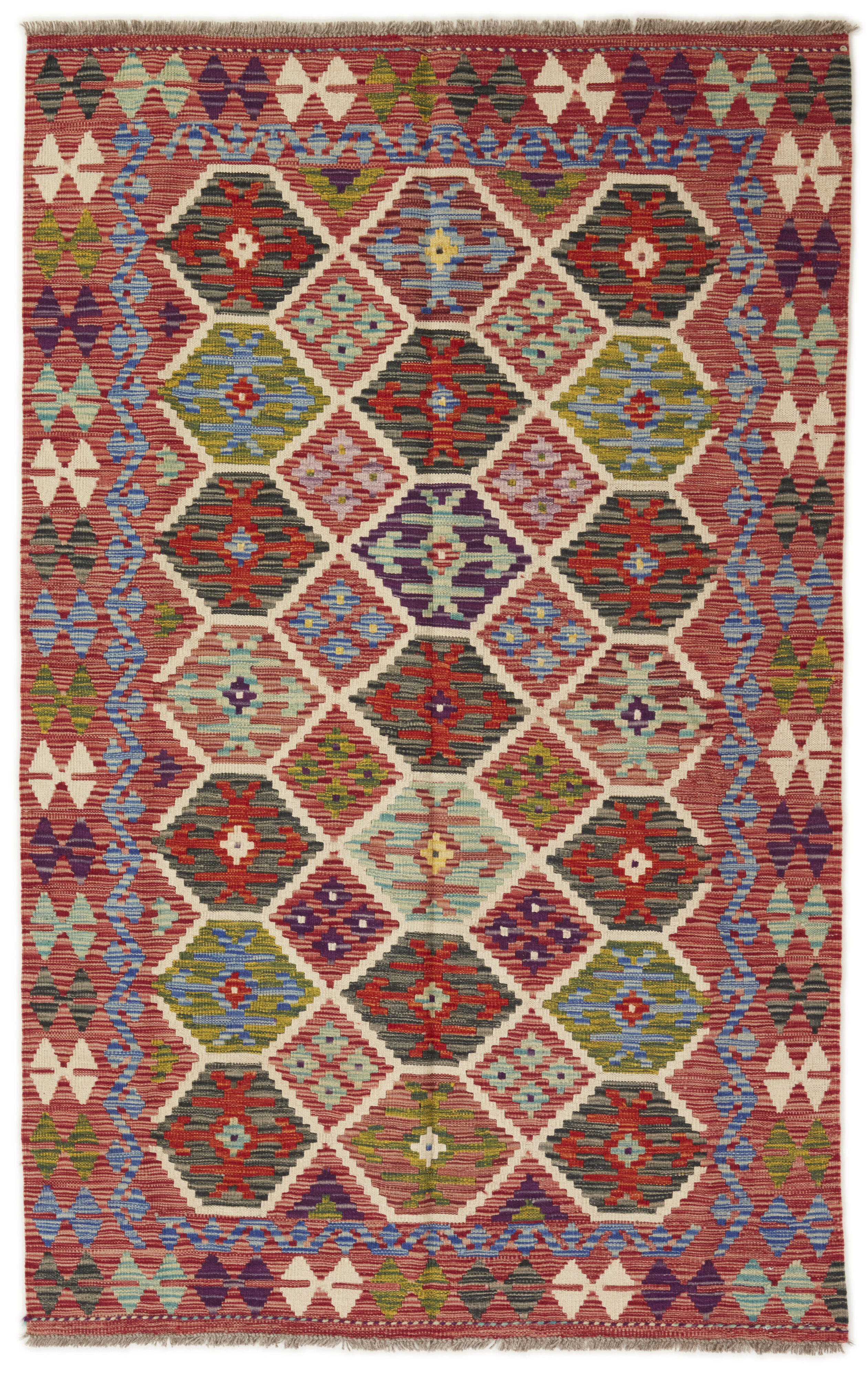 Afghan KelimItem no.: 1521414 Size: 122 cm x 193 cmAfghan Kelim rugs are hand woven by Turkmens in northern Afghanistan. Kelim is the name of a common Persian weave, but also of the technology used in the production. Kelims are primarily produced by nomads and are pile-less rugs, which are also used for bags, as wall decoration, or as curtains for tents. A natural colour scale with geometrical symbols and octagons is used.