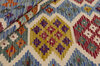 Afghan KelimItem no.: 1521415 Size: 126 cm x 194 cmAfghan Kelim rugs are hand woven by Turkmens in northern Afghanistan. Kelim is the name of a common Persian weave, but also of the technology used in the production. Kelims are primarily produced by nomads and are pile-less rugs, which are also used for bags, as wall decoration, or as curtains for tents. A natural colour scale with geometrical symbols and octagons is used.