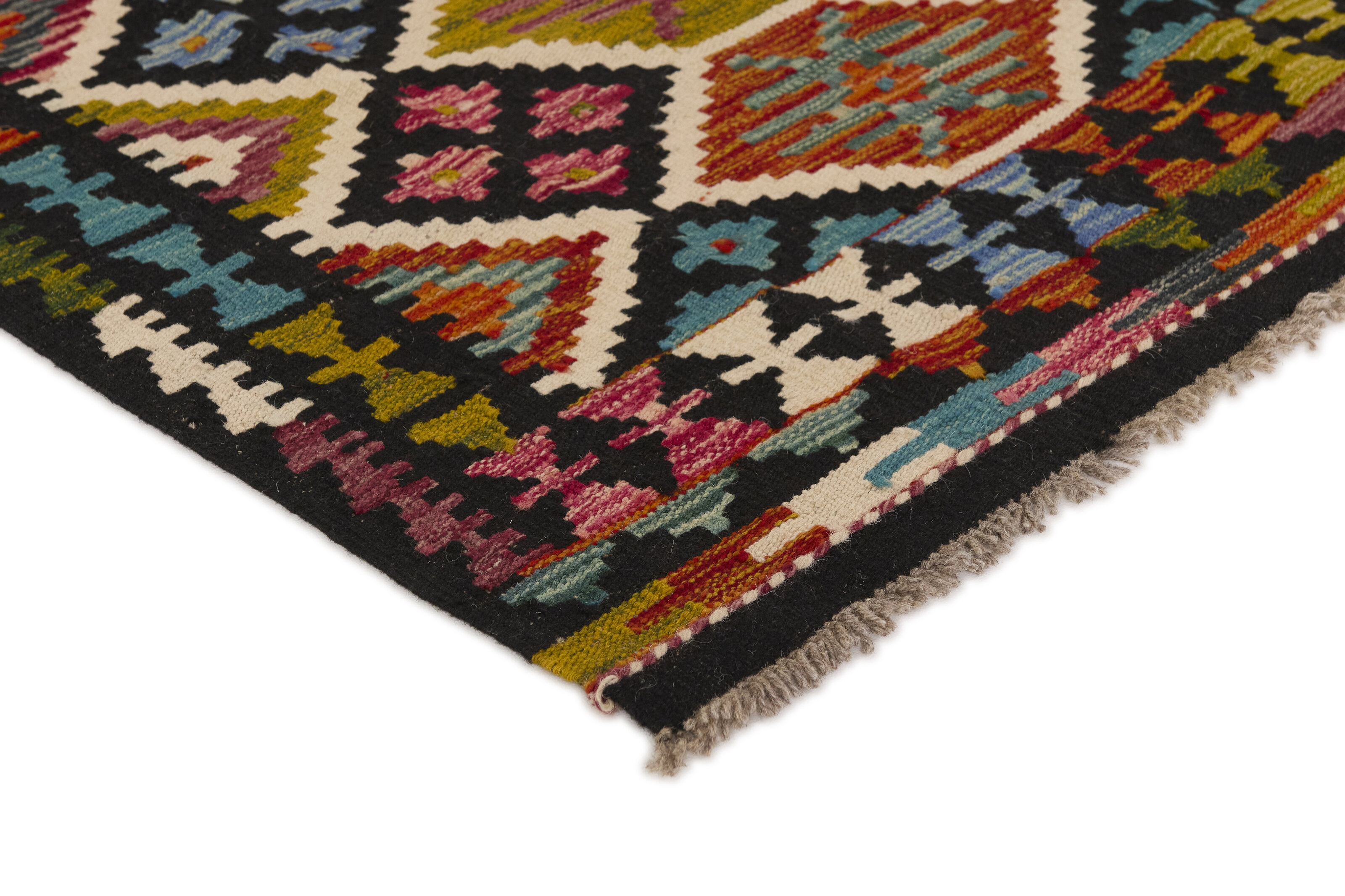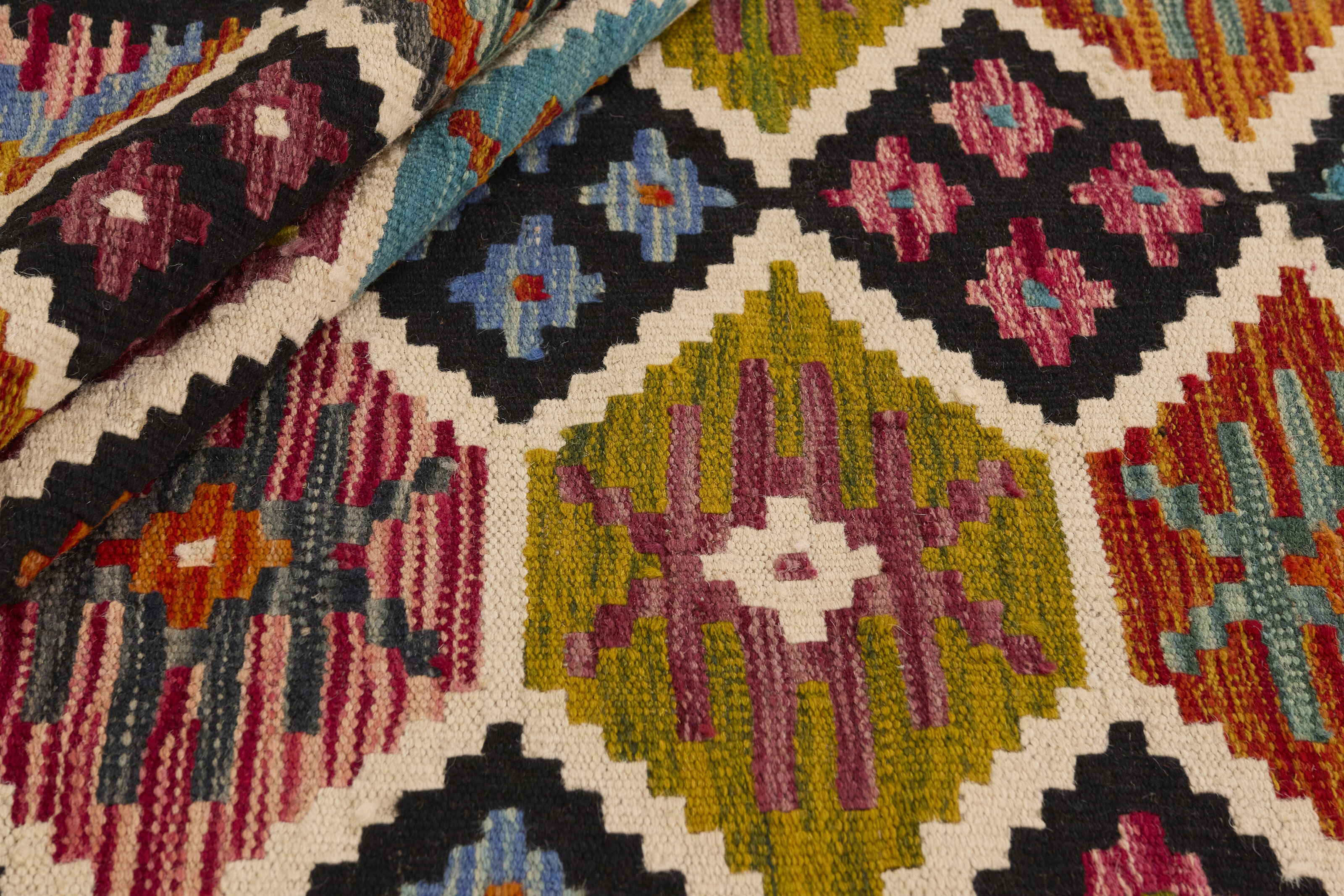 Afghan KelimItem no.: 1521417 Size: 129 cm x 195 cmAfghan Kelim rugs are hand woven by Turkmens in northern Afghanistan. Kelim is the name of a common Persian weave, but also of the technology used in the production. Kelims are primarily produced by nomads and are pile-less rugs, which are also used for bags, as wall decoration, or as curtains for tents. A natural colour scale with geometrical symbols and octagons is used.