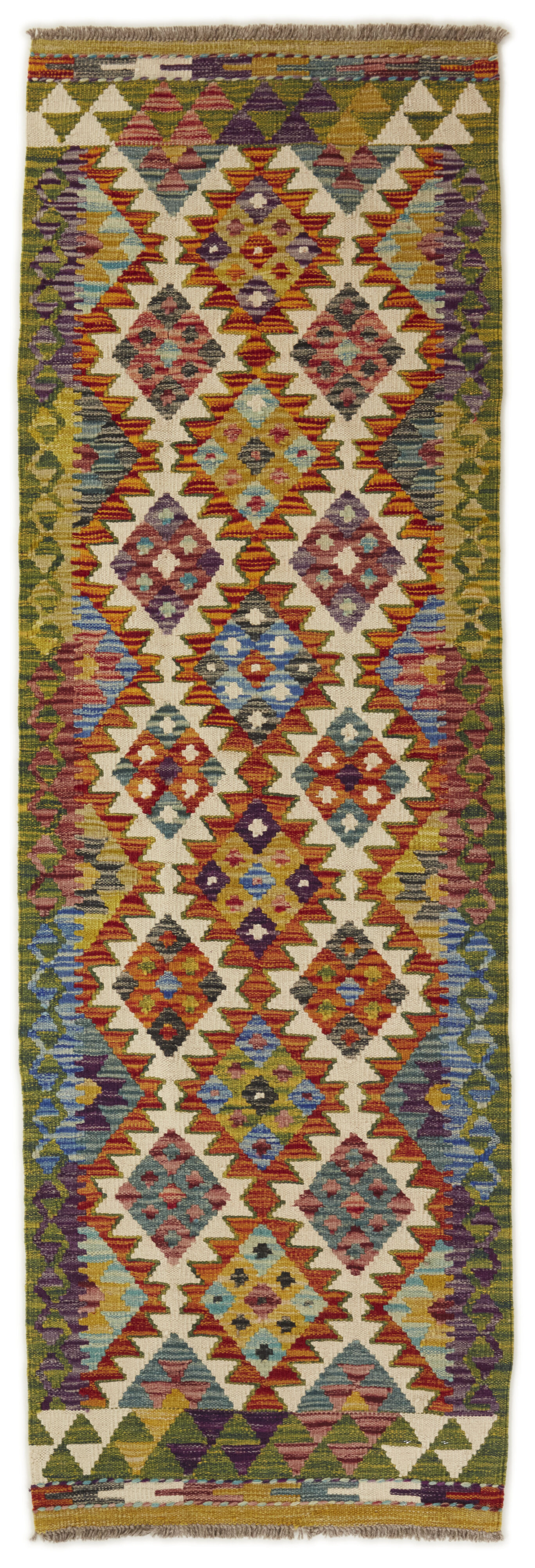Afghan KelimItem no.: 1521425 Size: 65 cm x 205 cmAfghan Kelim rugs are hand woven by Turkmens in northern Afghanistan. Kelim is the name of a common Persian weave, but also of the technology used in the production. Kelims are primarily produced by nomads and are pile-less rugs, which are also used for bags, as wall decoration, or as curtains for tents. A natural colour scale with geometrical symbols and octagons is used.