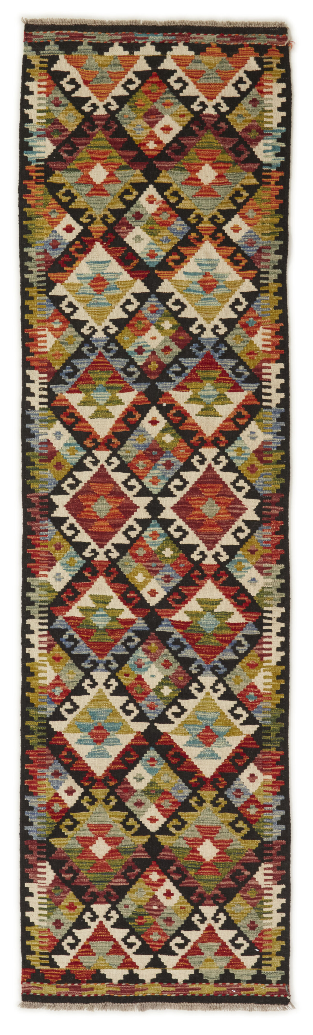 Afghan KelimItem no.: 1521426 Size: 61 cm x 229 cmAfghan Kelim rugs are hand woven by Turkmens in northern Afghanistan. Kelim is the name of a common Persian weave, but also of the technology used in the production. Kelims are primarily produced by nomads and are pile-less rugs, which are also used for bags, as wall decoration, or as curtains for tents. A natural colour scale with geometrical symbols and octagons is used.