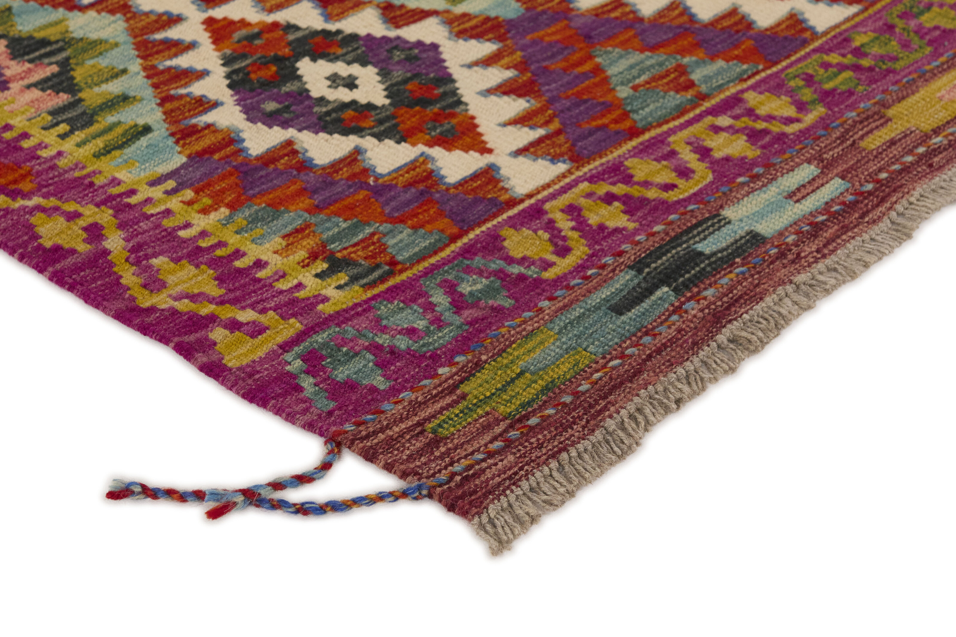 Afghan KelimItem no.: 1521428 Size: 83 cm x 238 cmAfghan Kelim rugs are hand woven by Turkmens in northern Afghanistan. Kelim is the name of a common Persian weave, but also of the technology used in the production. Kelims are primarily produced by nomads and are pile-less rugs, which are also used for bags, as wall decoration, or as curtains for tents. A natural colour scale with geometrical symbols and octagons is used.
