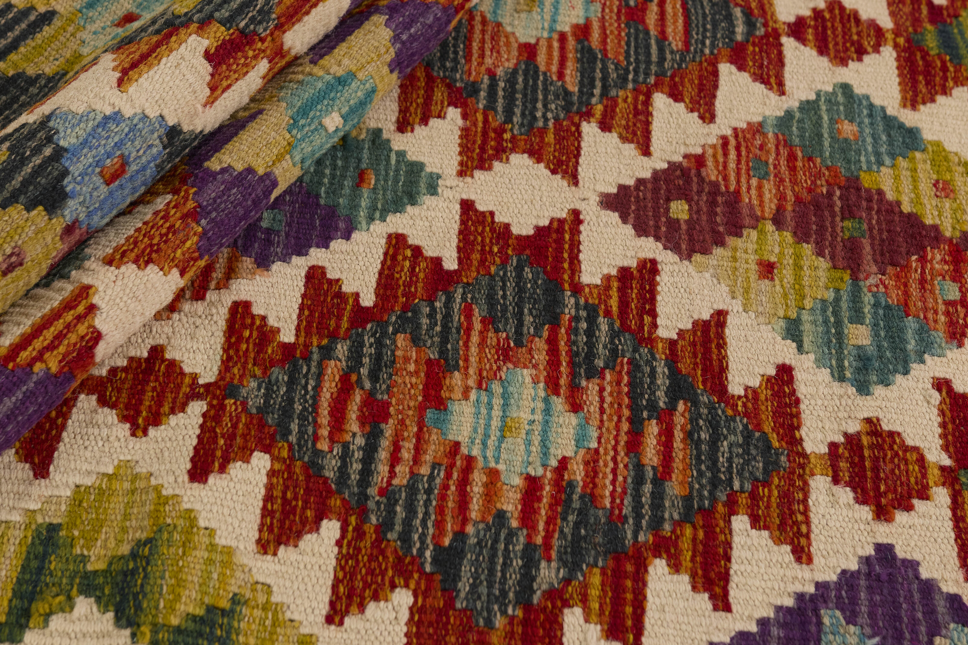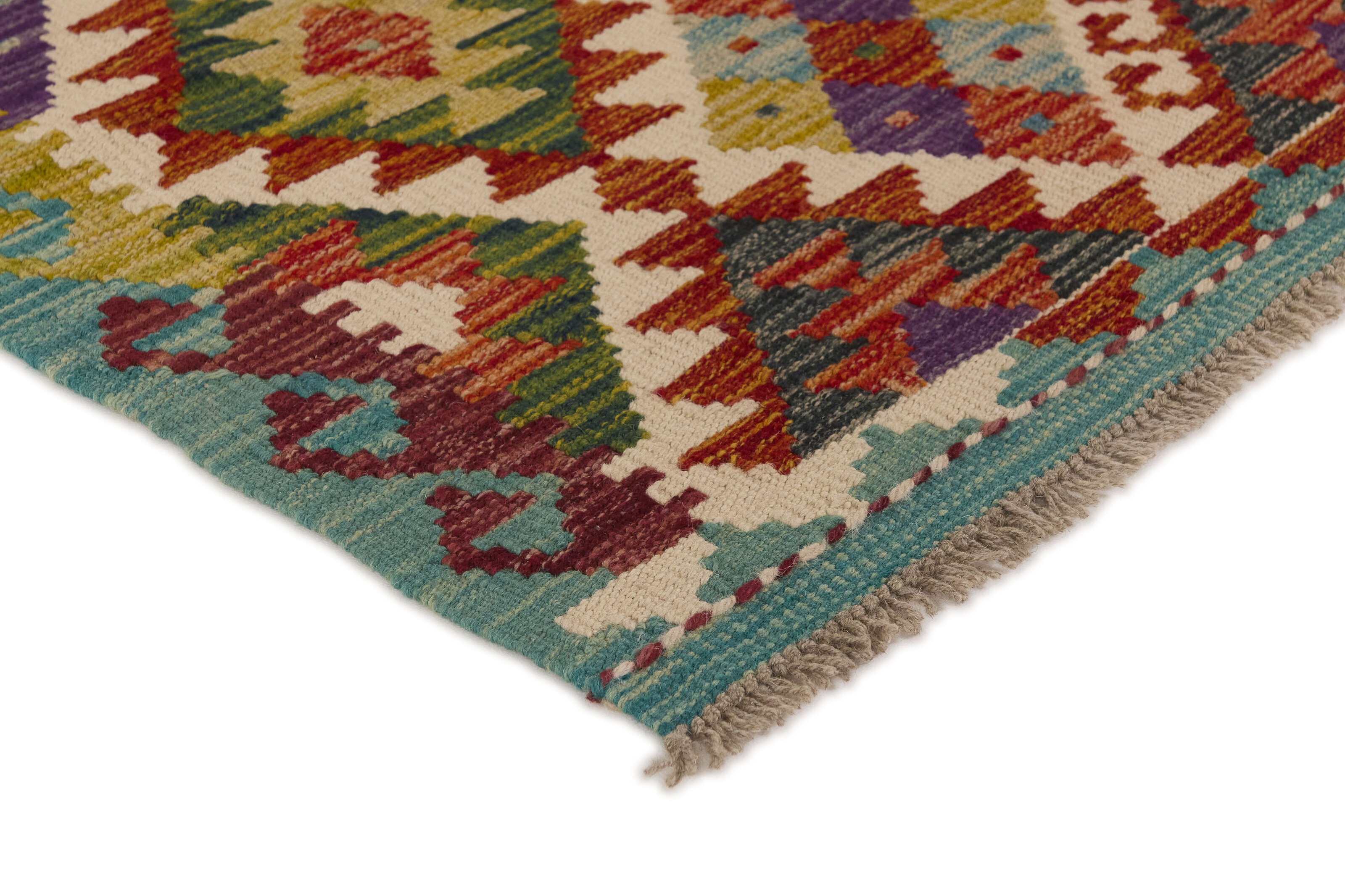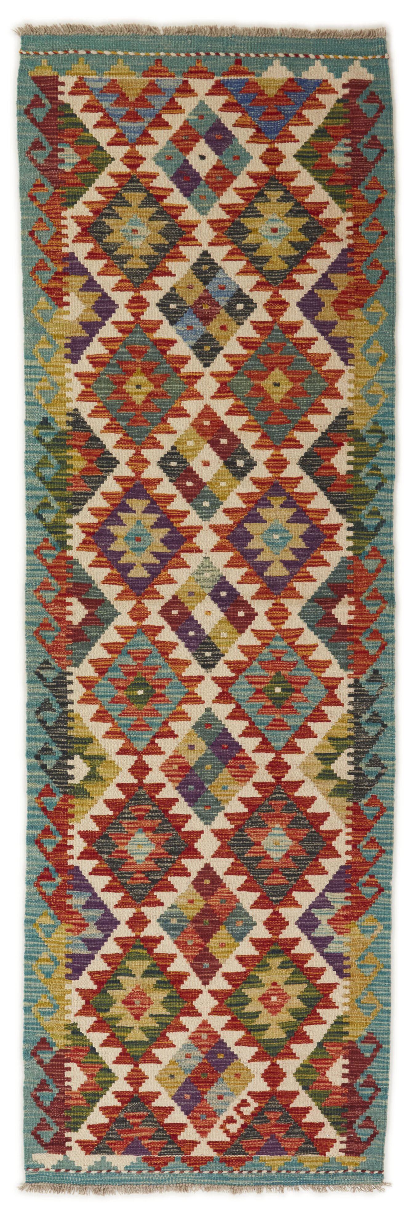 Afghan KelimItem no.: 1521431 Size: 78 cm x 243 cmAfghan Kelim rugs are hand woven by Turkmens in northern Afghanistan. Kelim is the name of a common Persian weave, but also of the technology used in the production. Kelims are primarily produced by nomads and are pile-less rugs, which are also used for bags, as wall decoration, or as curtains for tents. A natural colour scale with geometrical symbols and octagons is used.