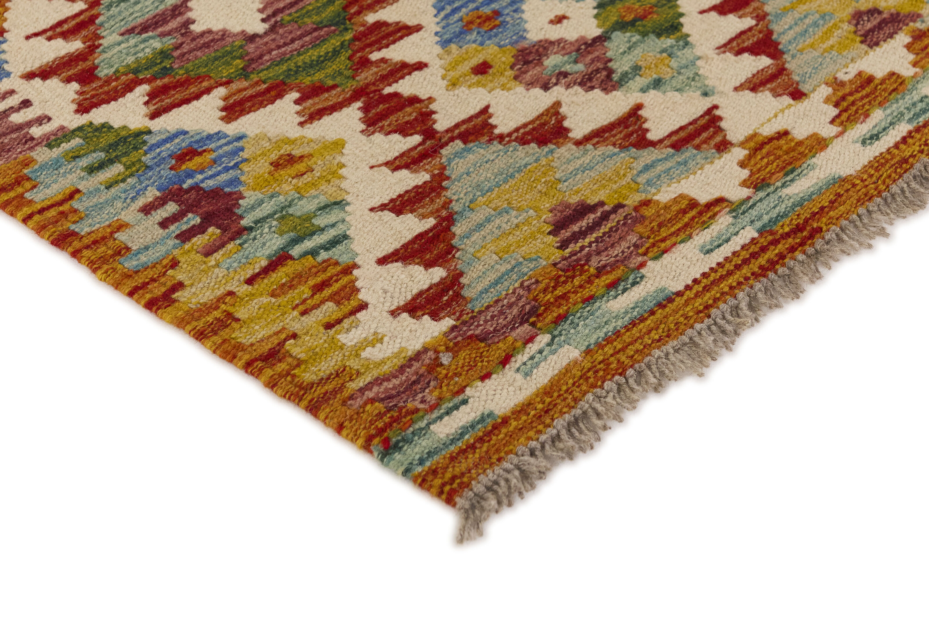 Afghan KelimItem no.: 1521444 Size: 63 cm x 248 cmAfghan Kelim rugs are hand woven by Turkmens in northern Afghanistan. Kelim is the name of a common Persian weave, but also of the technology used in the production. Kelims are primarily produced by nomads and are pile-less rugs, which are also used for bags, as wall decoration, or as curtains for tents. A natural colour scale with geometrical symbols and octagons is used.