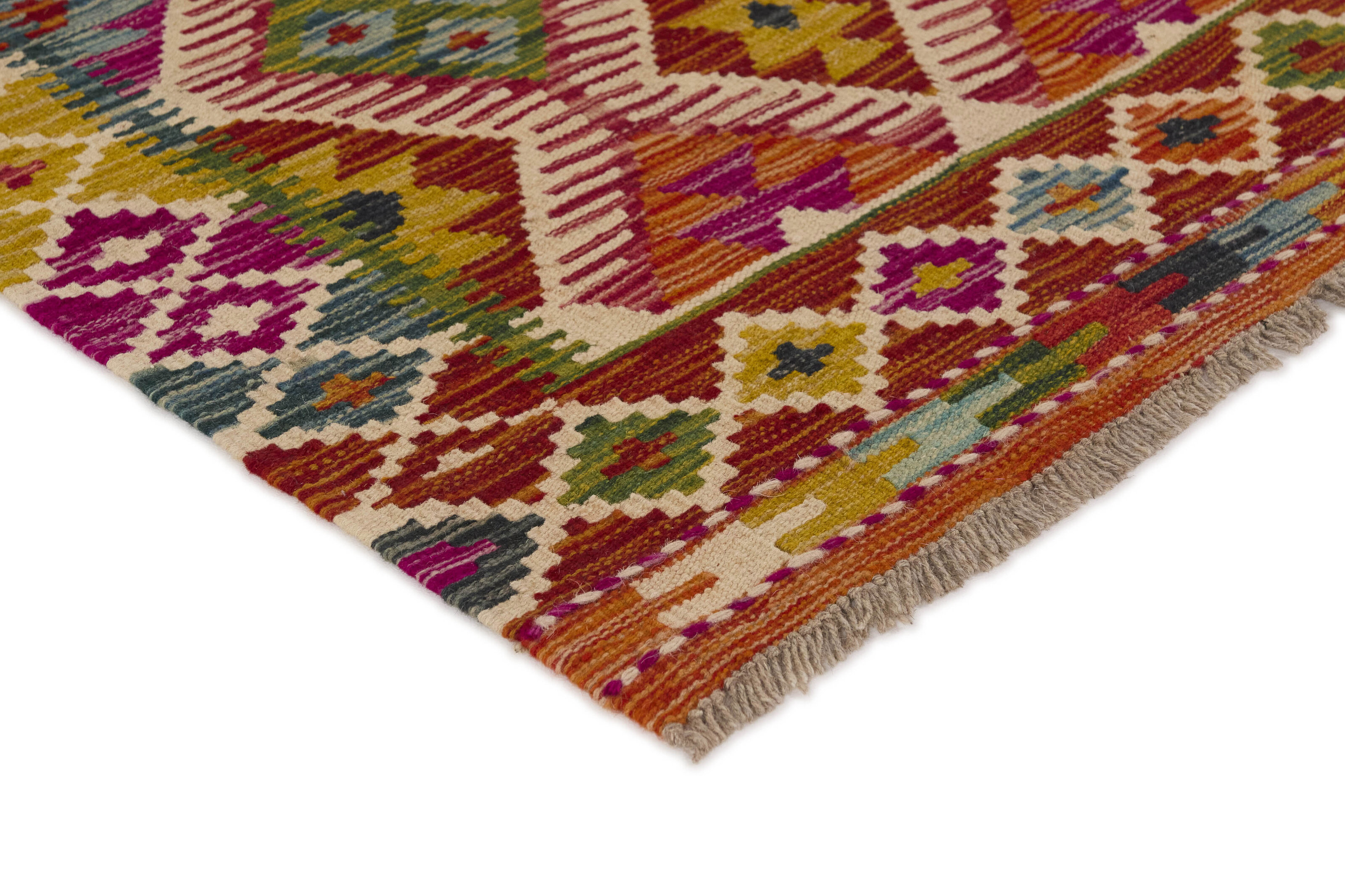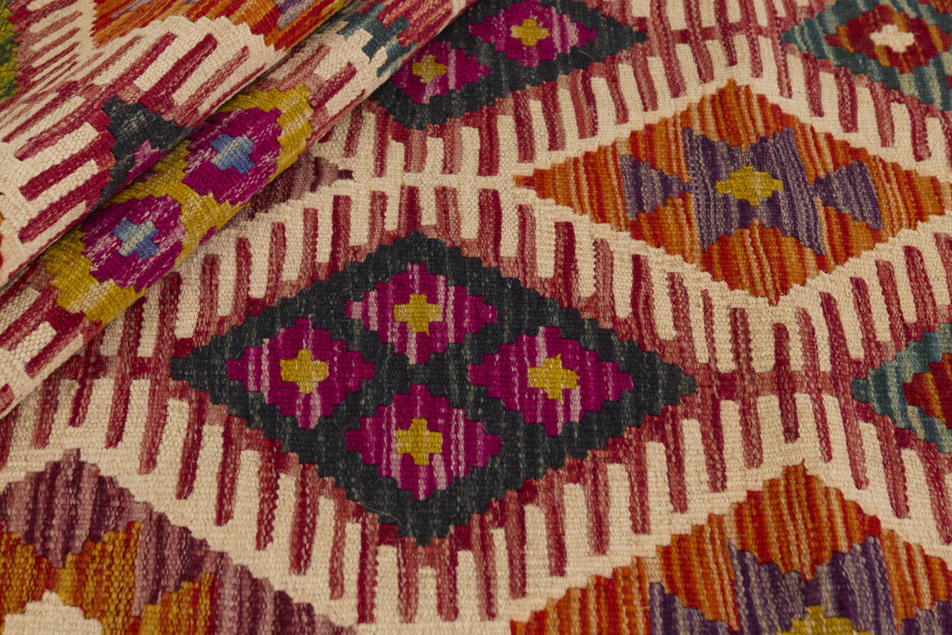 Afghan KelimItem no.: 1521459 Size: 78 cm x 292 cmAfghan Kelim rugs are hand woven by Turkmens in northern Afghanistan. Kelim is the name of a common Persian weave, but also of the technology used in the production. Kelims are primarily produced by nomads and are pile-less rugs, which are also used for bags, as wall decoration, or as curtains for tents. A natural colour scale with geometrical symbols and octagons is used.