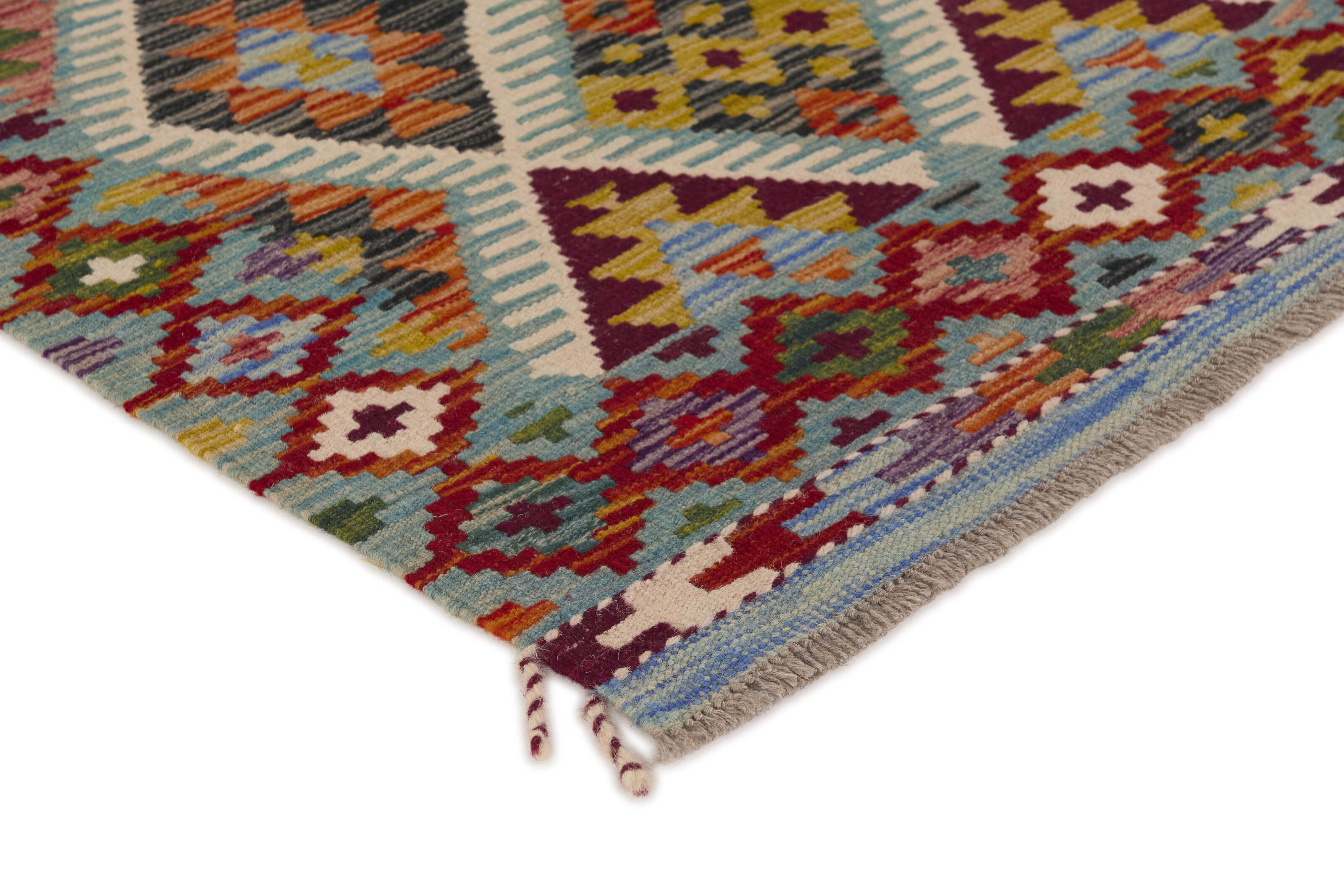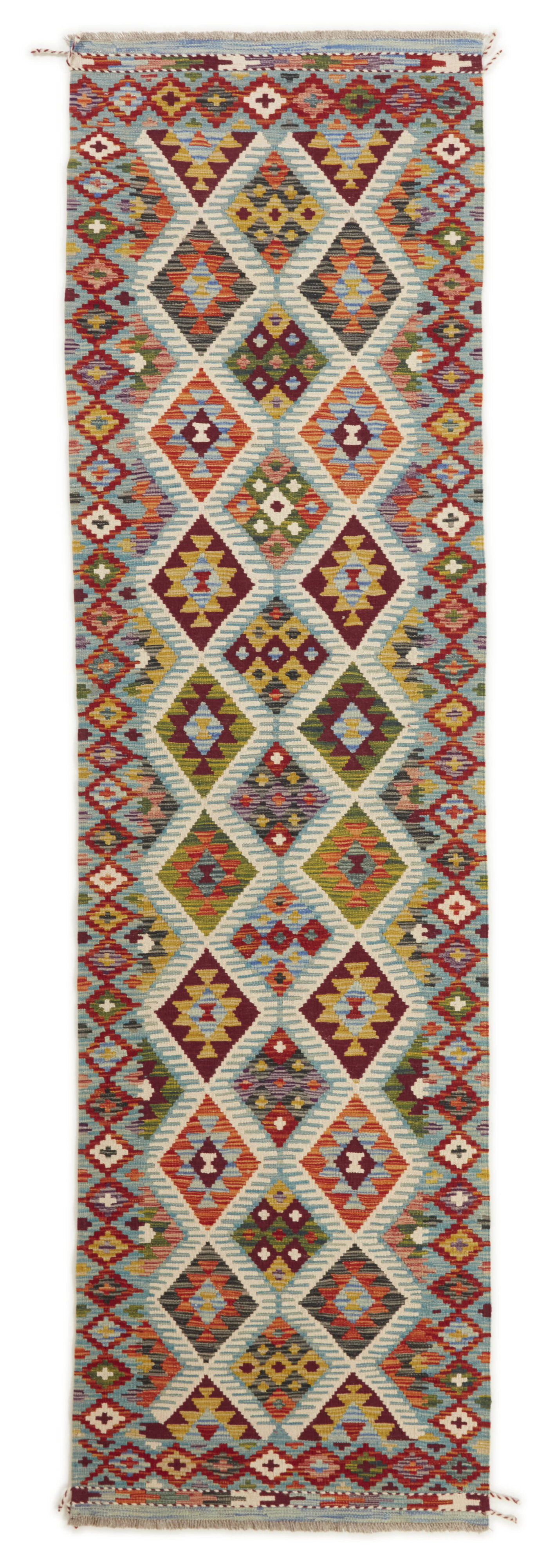 Afghan KelimItem no.: 1521469 Size: 83 cm x 295 cmAfghan Kelim rugs are hand woven by Turkmens in northern Afghanistan. Kelim is the name of a common Persian weave, but also of the technology used in the production. Kelims are primarily produced by nomads and are pile-less rugs, which are also used for bags, as wall decoration, or as curtains for tents. A natural colour scale with geometrical symbols and octagons is used.