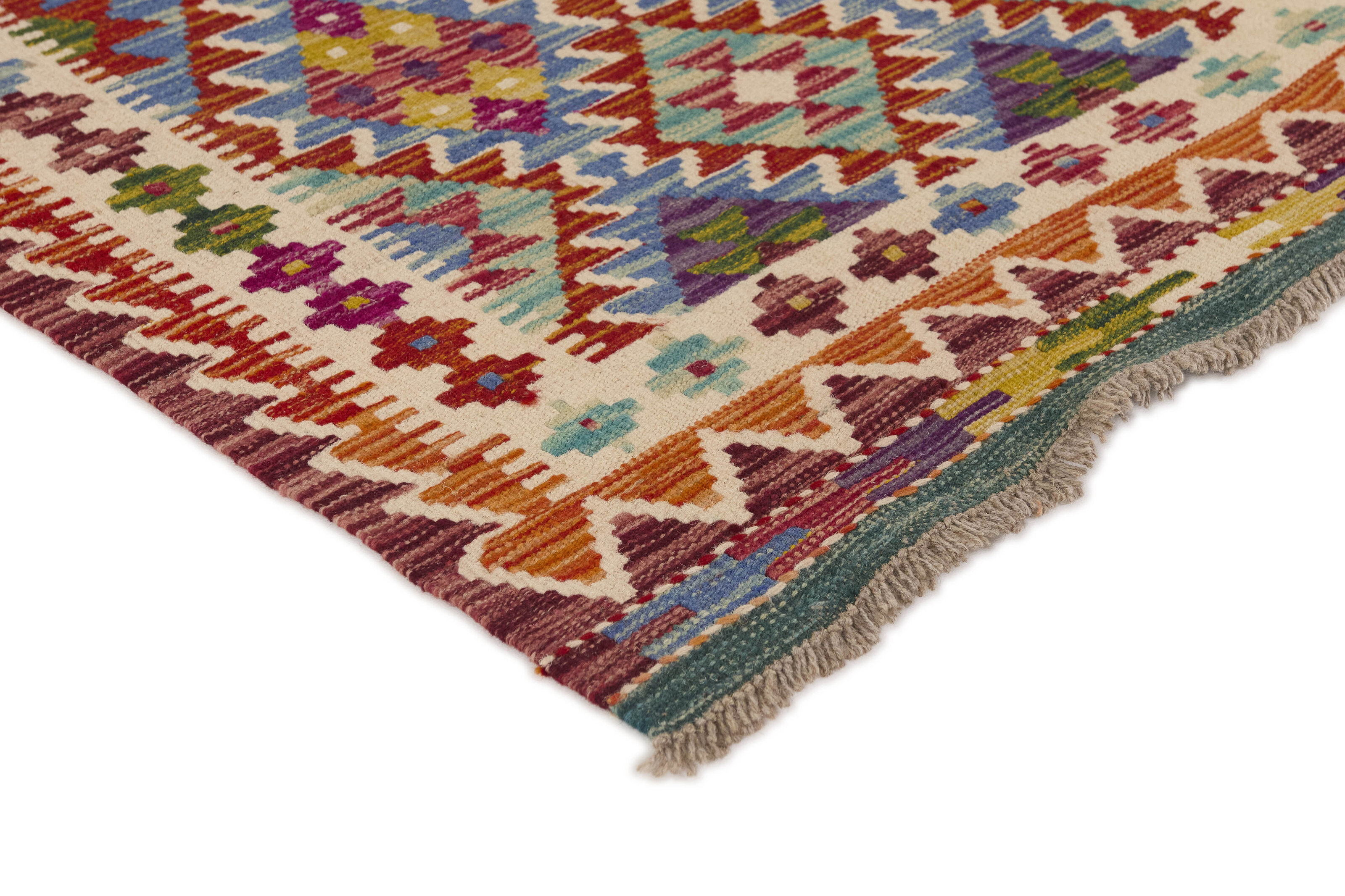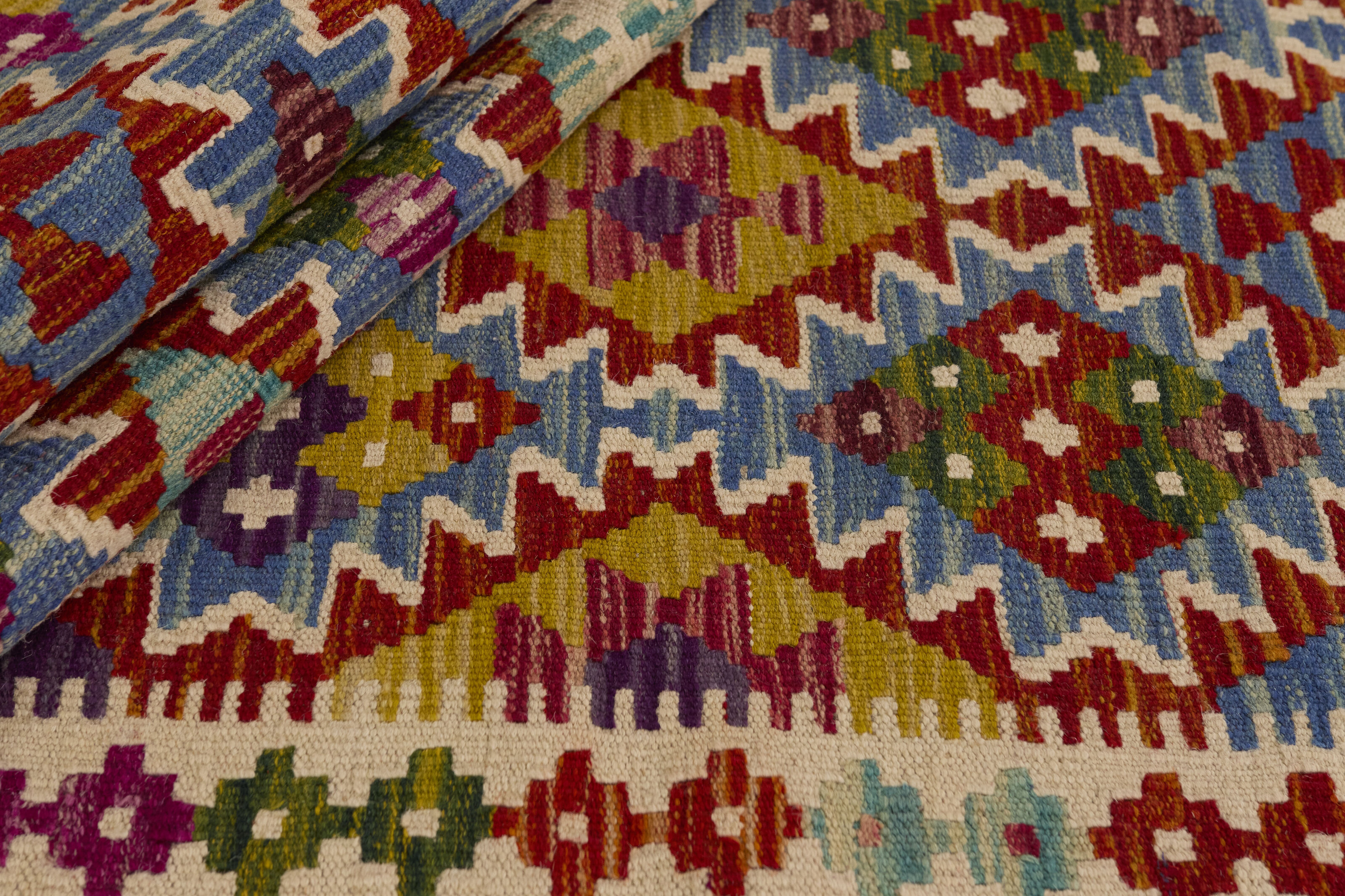 Afghan KelimItem no.: 1521475 Size: 77 cm x 296 cmAfghan Kelim rugs are hand woven by Turkmens in northern Afghanistan. Kelim is the name of a common Persian weave, but also of the technology used in the production. Kelims are primarily produced by nomads and are pile-less rugs, which are also used for bags, as wall decoration, or as curtains for tents. A natural colour scale with geometrical symbols and octagons is used.