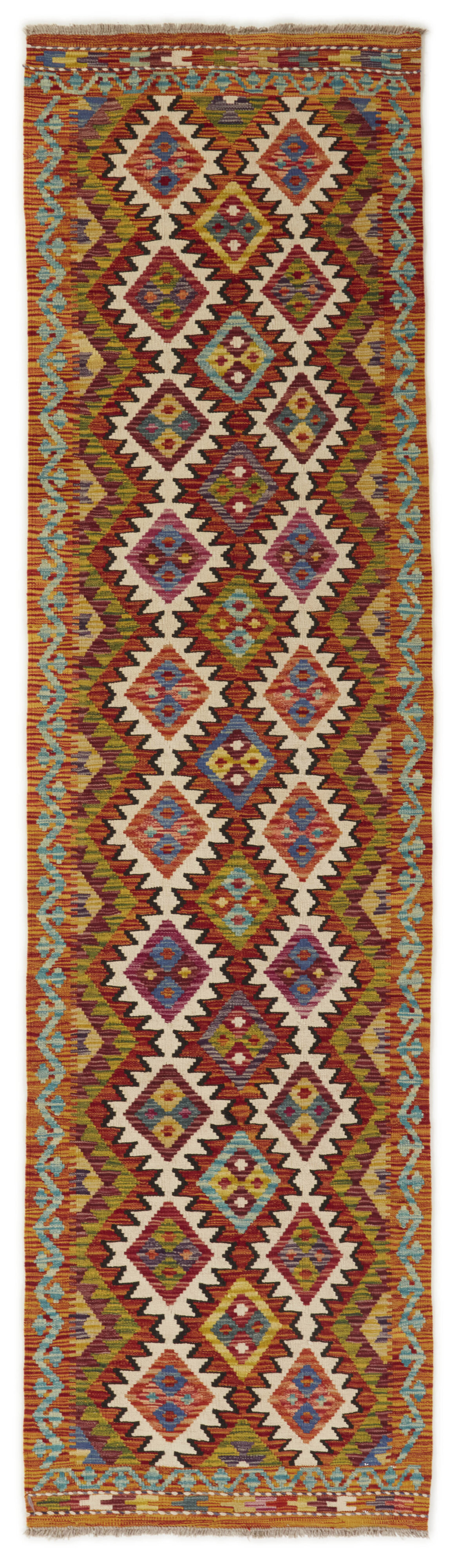 Afghan KelimItem no.: 1521476 Size: 78 cm x 296 cmAfghan Kelim rugs are hand woven by Turkmens in northern Afghanistan. Kelim is the name of a common Persian weave, but also of the technology used in the production. Kelims are primarily produced by nomads and are pile-less rugs, which are also used for bags, as wall decoration, or as curtains for tents. A natural colour scale with geometrical symbols and octagons is used.