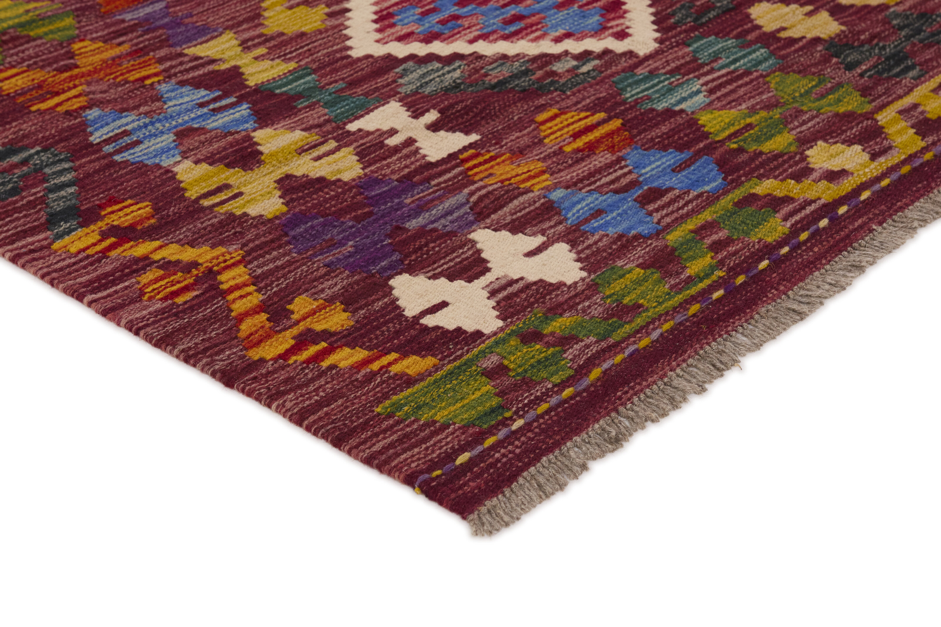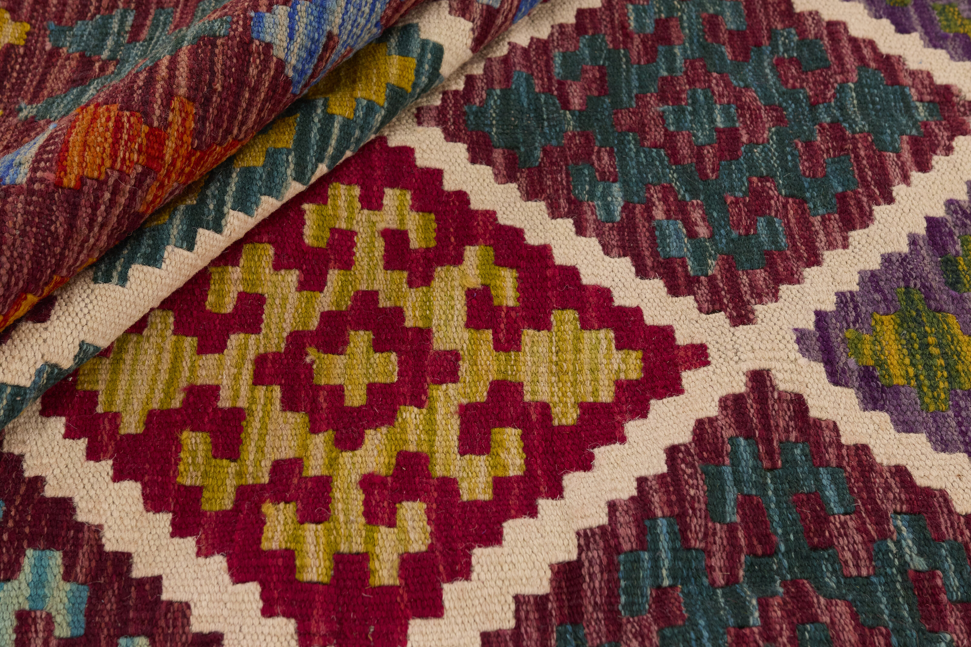 Afghan KelimItem no.: 1521485 Size: 208 cm x 300 cmAfghan Kelim rugs are hand woven by Turkmens in northern Afghanistan. Kelim is the name of a common Persian weave, but also of the technology used in the production. Kelims are primarily produced by nomads and are pile-less rugs, which are also used for bags, as wall decoration, or as curtains for tents. A natural colour scale with geometrical symbols and octagons is used.