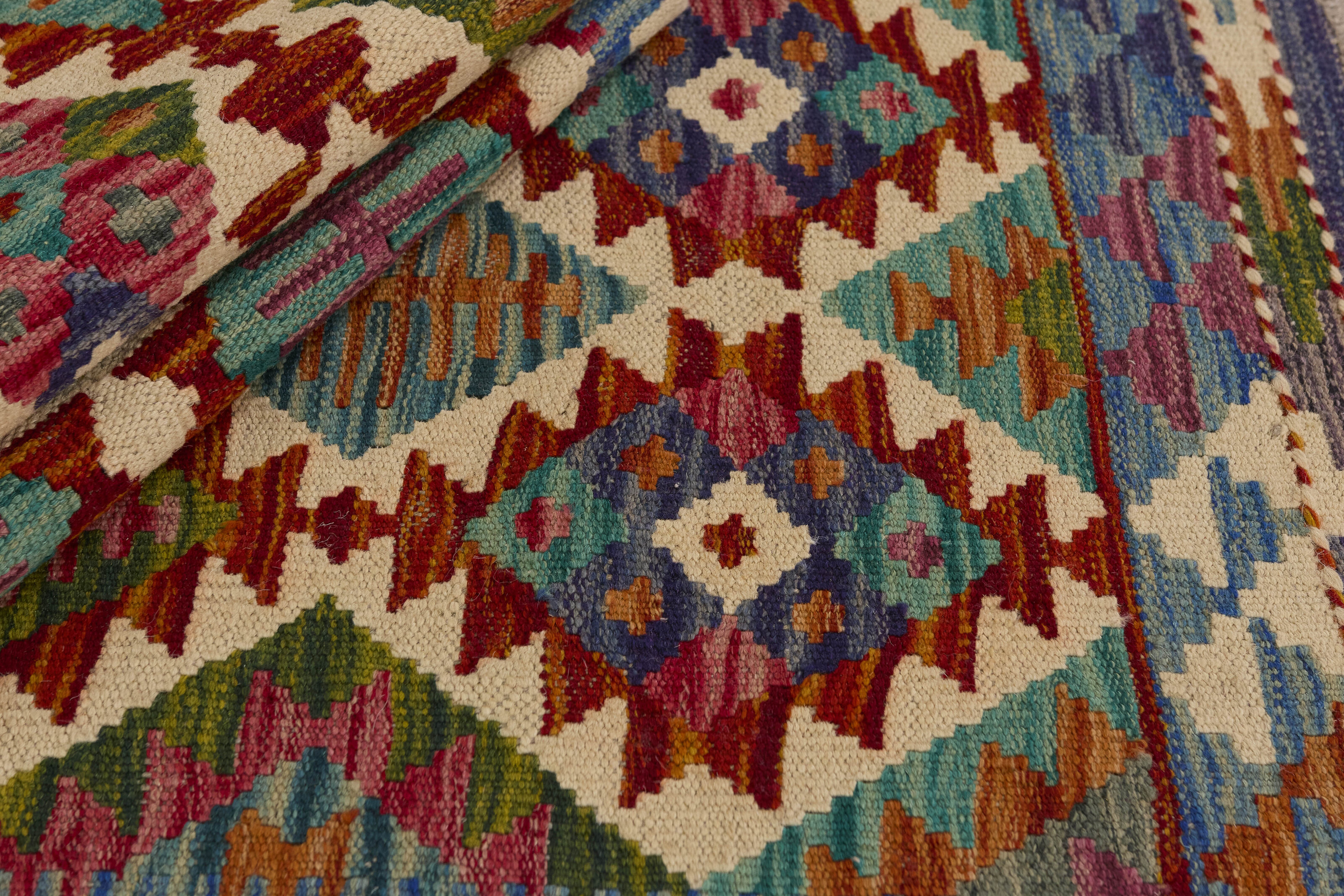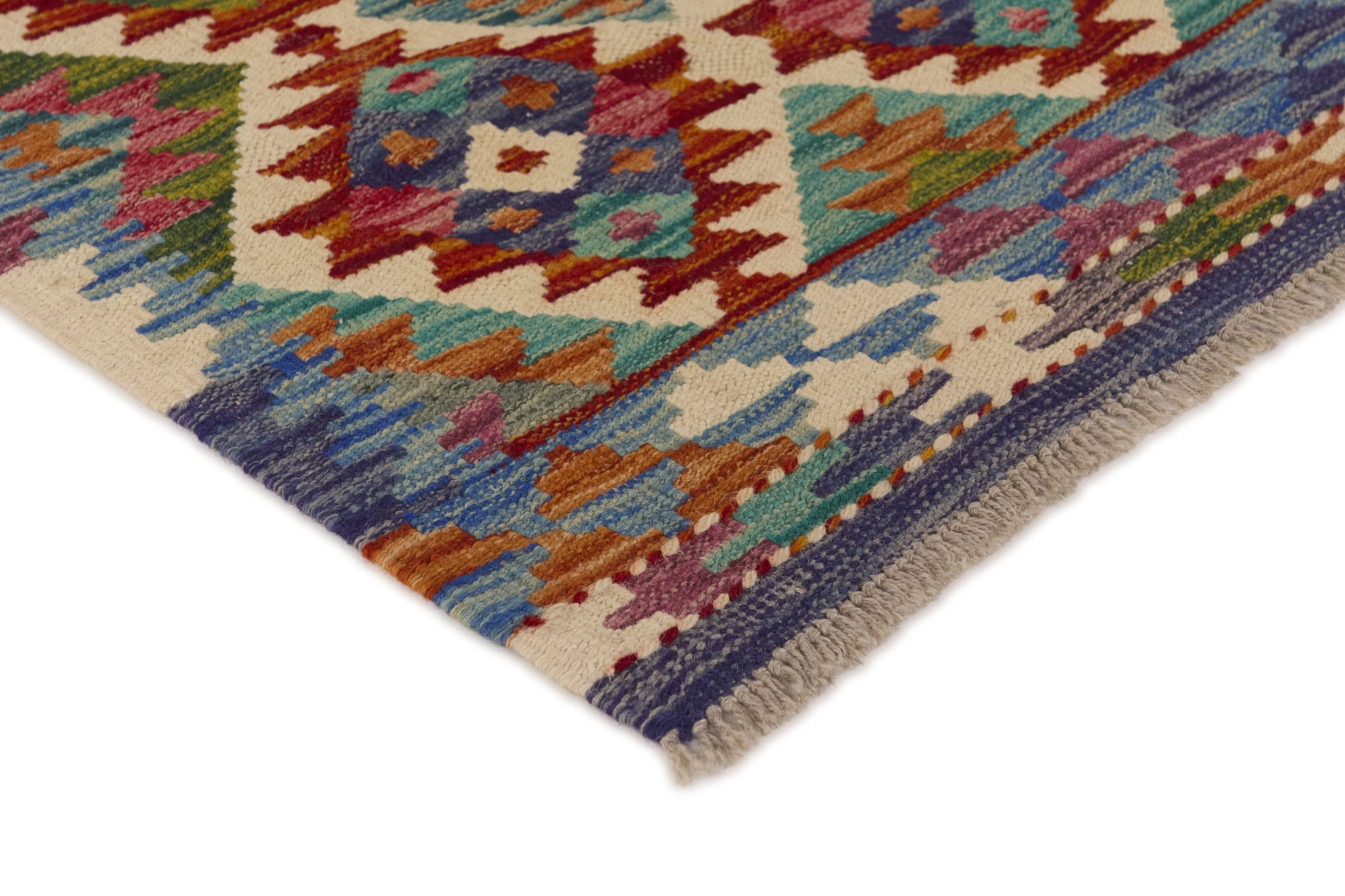Afghan KelimItem no.: 1521541 Size: 61 cm x 145 cmAfghan Kelim rugs are hand woven by Turkmens in northern Afghanistan. Kelim is the name of a common Persian weave, but also of the technology used in the production. Kelims are primarily produced by nomads and are pile-less rugs, which are also used for bags, as wall decoration, or as curtains for tents. A natural colour scale with geometrical symbols and octagons is used.