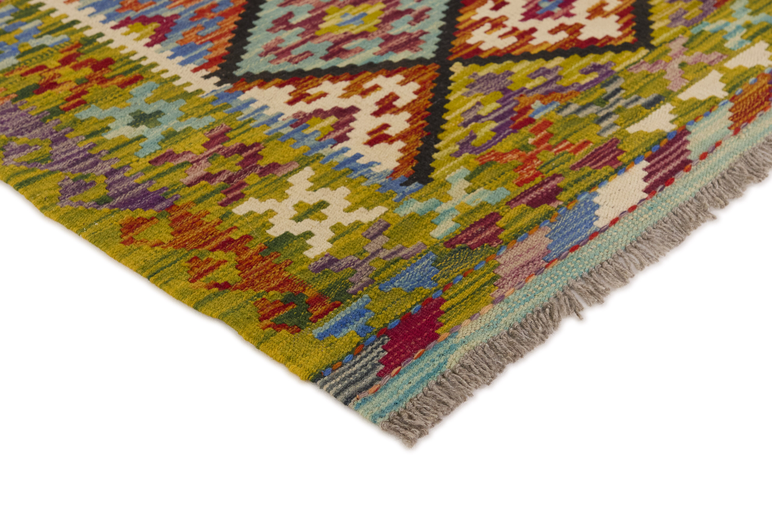 Afghan KelimItem no.: 1521547 Size: 100 cm x 146 cmAfghan Kelim rugs are hand woven by Turkmens in northern Afghanistan. Kelim is the name of a common Persian weave, but also of the technology used in the production. Kelims are primarily produced by nomads and are pile-less rugs, which are also used for bags, as wall decoration, or as curtains for tents. A natural colour scale with geometrical symbols and octagons is used.