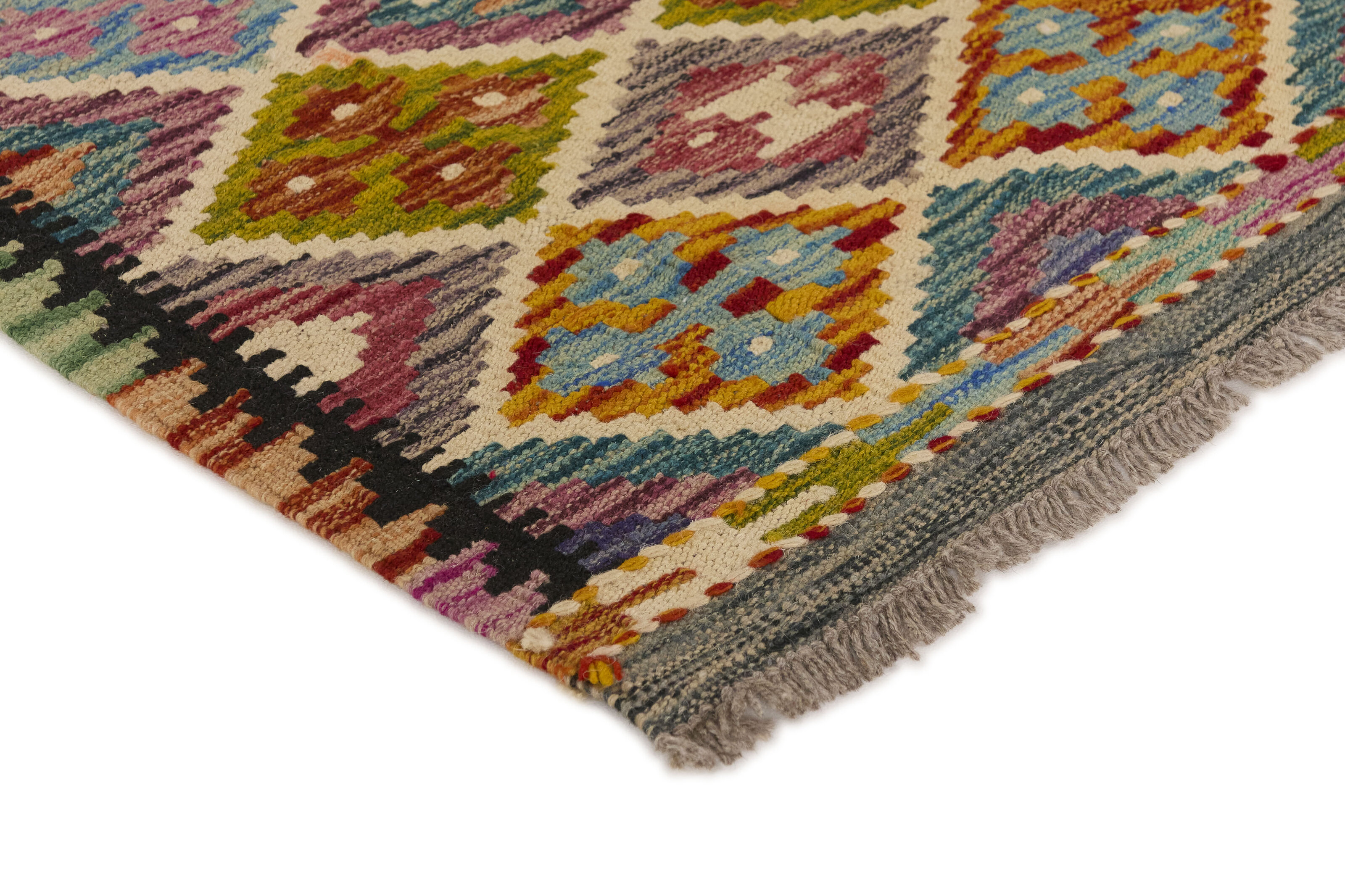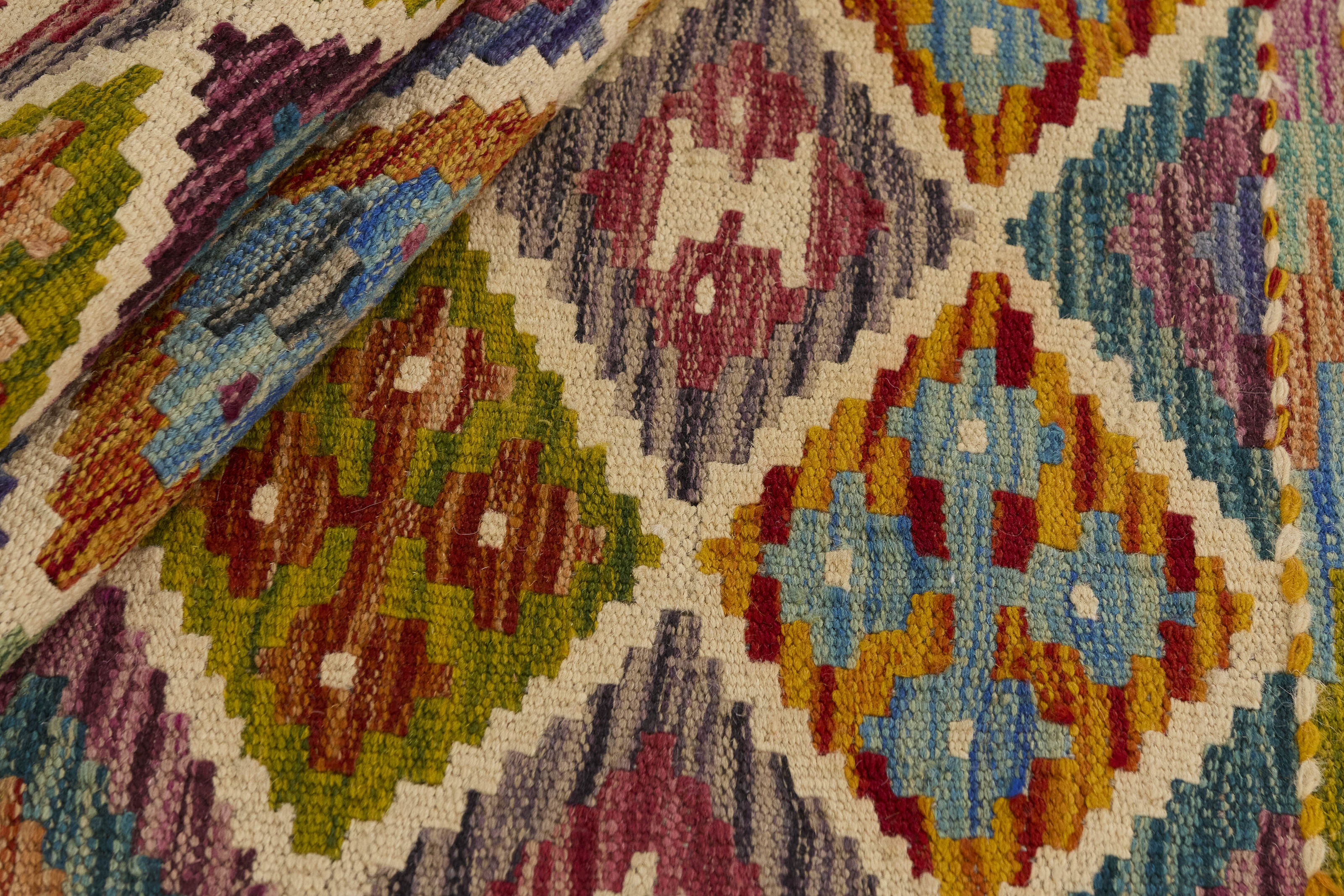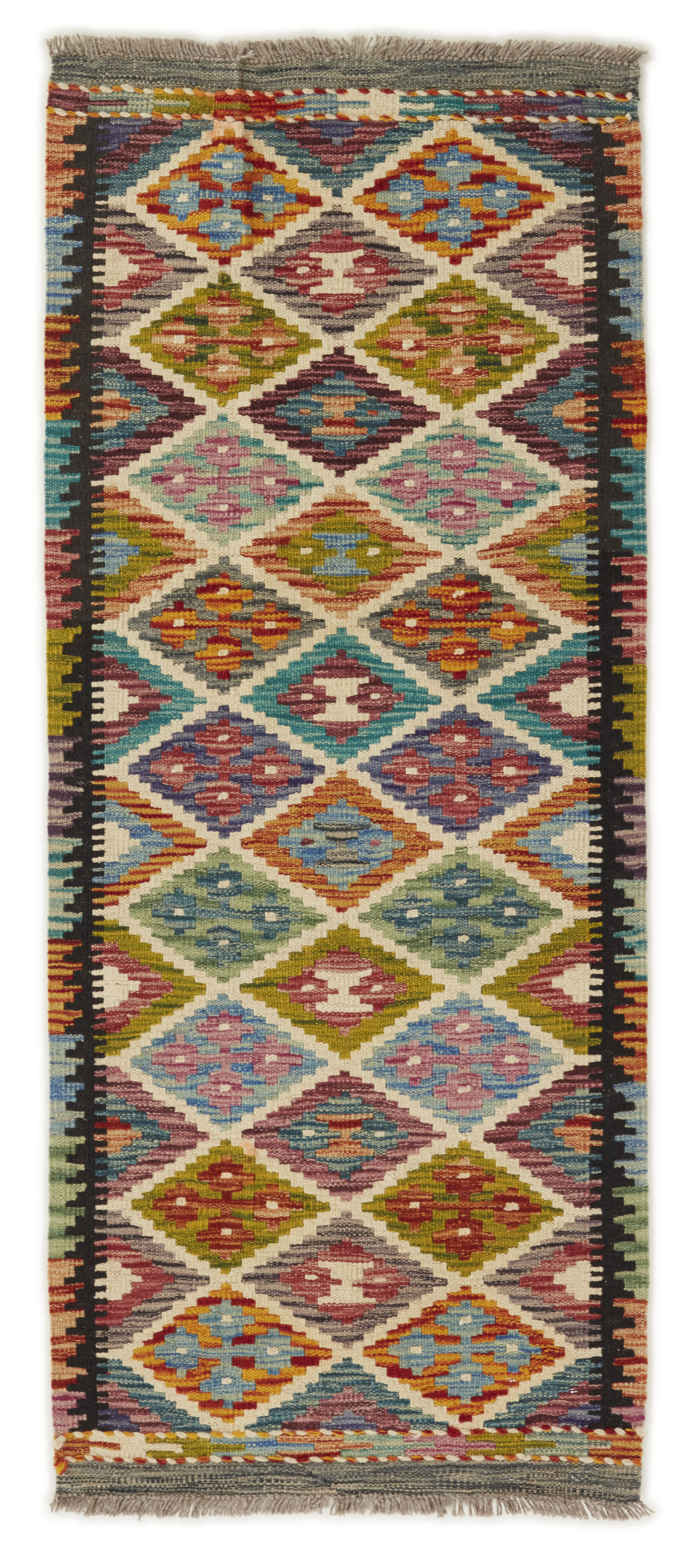 Afghan KelimItem no.: 1521555 Size: 60 cm x 147 cmAfghan Kelim rugs are hand woven by Turkmens in northern Afghanistan. Kelim is the name of a common Persian weave, but also of the technology used in the production. Kelims are primarily produced by nomads and are pile-less rugs, which are also used for bags, as wall decoration, or as curtains for tents. A natural colour scale with geometrical symbols and octagons is used.