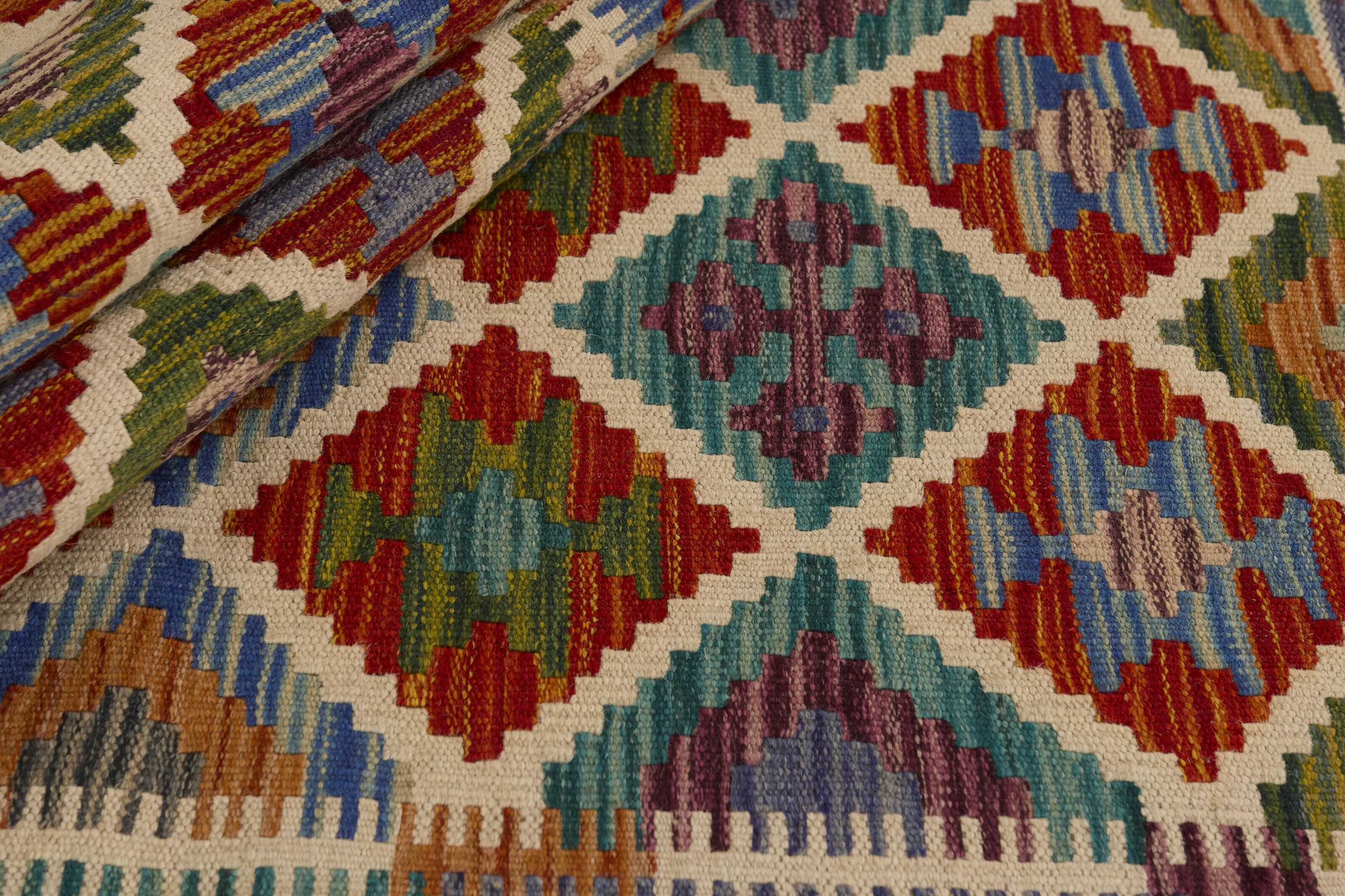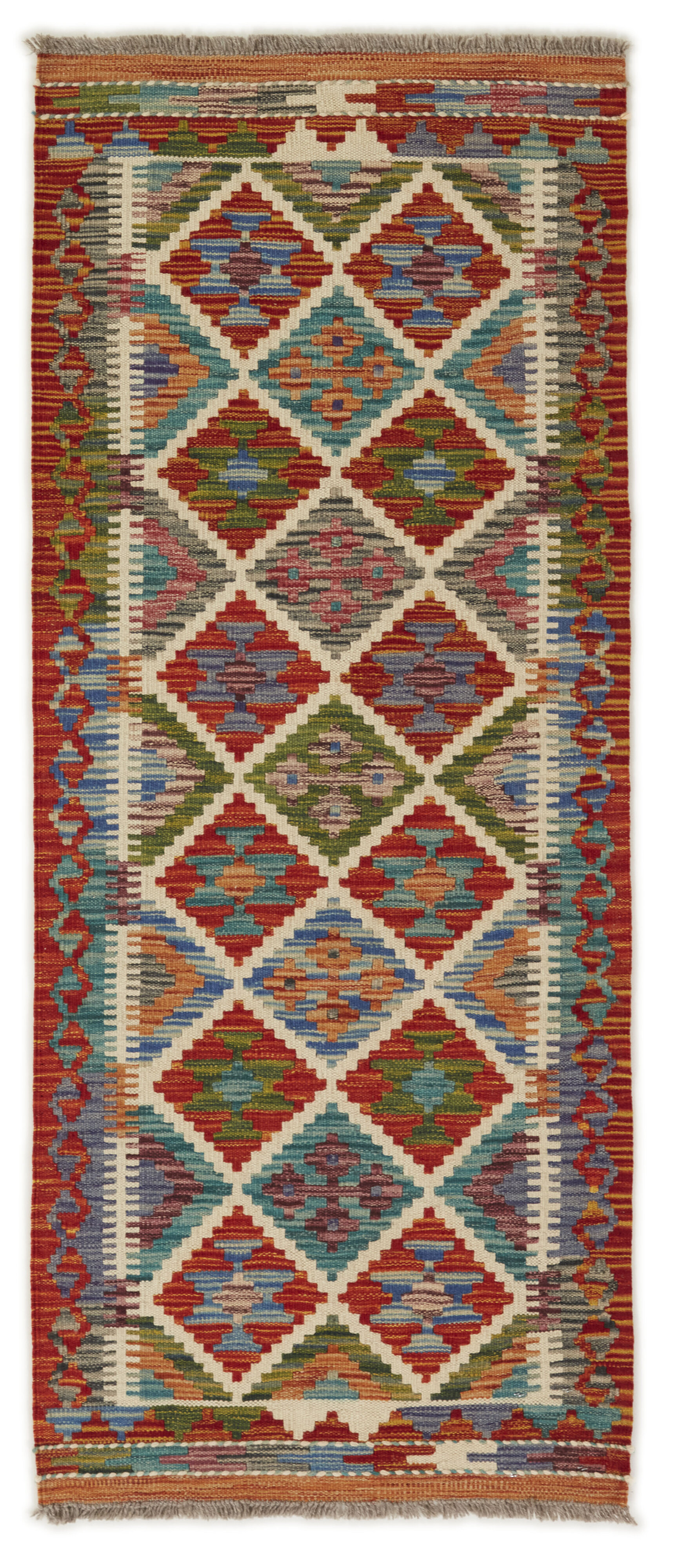 Afghan KelimItem no.: 1521563 Size: 60 cm x 148 cmAfghan Kelim rugs are hand woven by Turkmens in northern Afghanistan. Kelim is the name of a common Persian weave, but also of the technology used in the production. Kelims are primarily produced by nomads and are pile-less rugs, which are also used for bags, as wall decoration, or as curtains for tents. A natural colour scale with geometrical symbols and octagons is used.