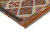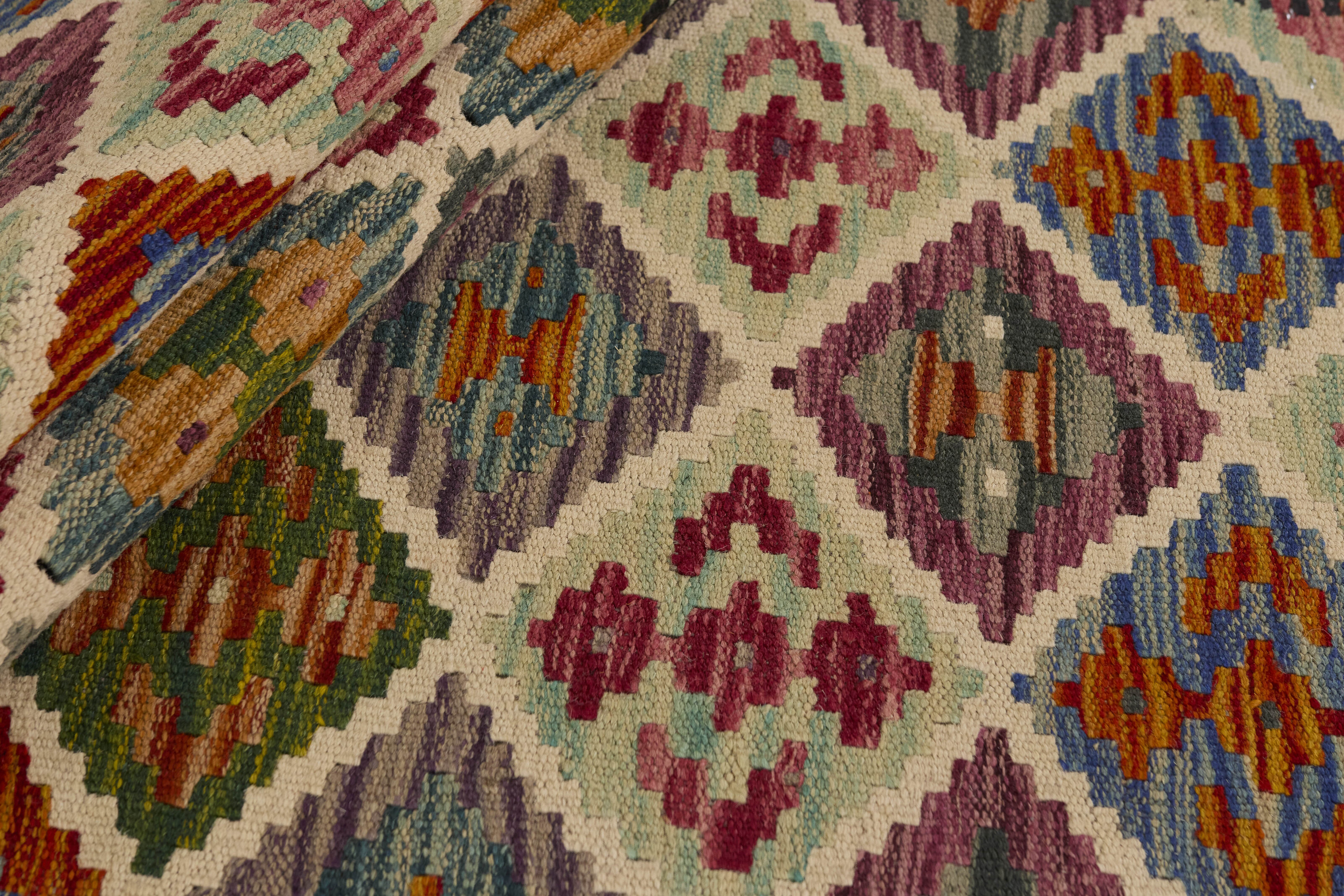 Afghan KelimItem no.: 1521566 Size: 60 cm x 149 cmAfghan Kelim rugs are hand woven by Turkmens in northern Afghanistan. Kelim is the name of a common Persian weave, but also of the technology used in the production. Kelims are primarily produced by nomads and are pile-less rugs, which are also used for bags, as wall decoration, or as curtains for tents. A natural colour scale with geometrical symbols and octagons is used.