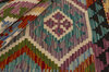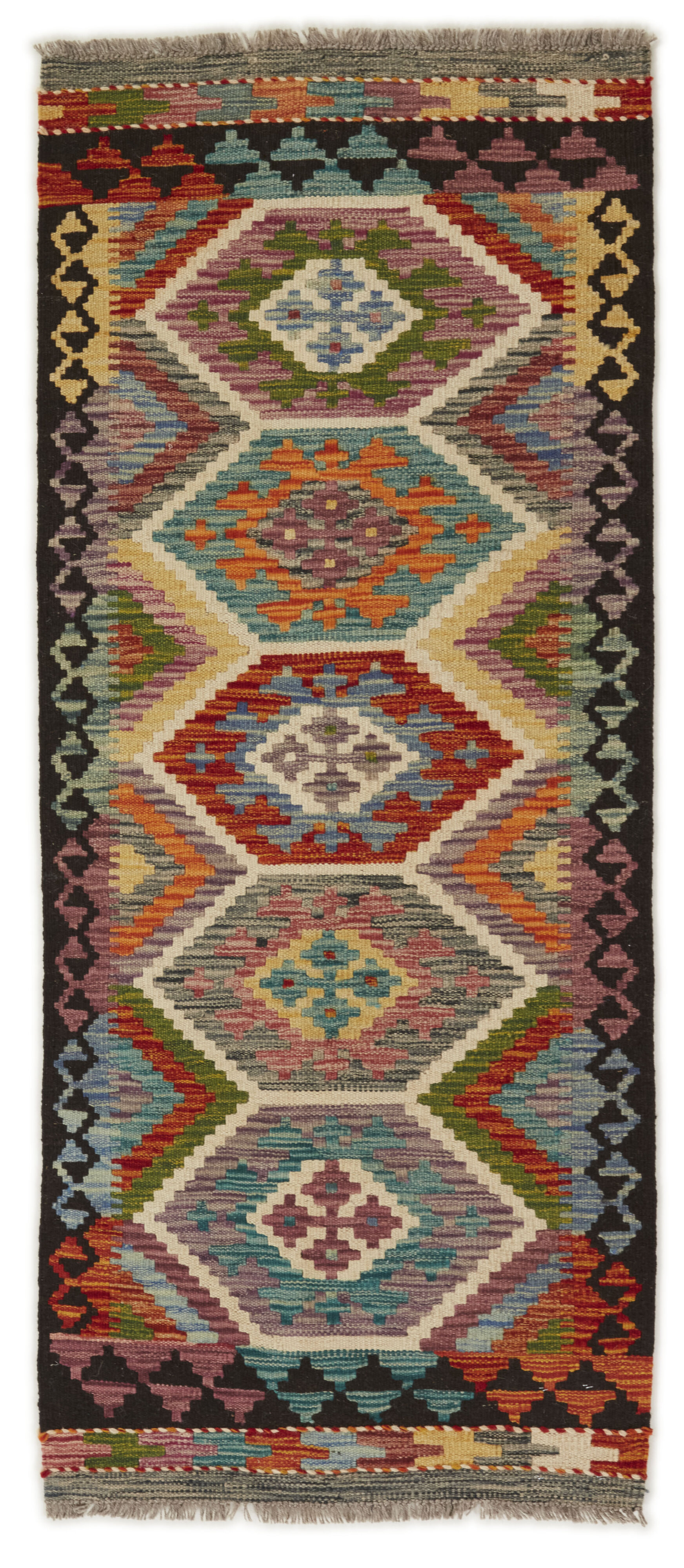 Afghan KelimItem no.: 1521569 Size: 62 cm x 150 cmAfghan Kelim rugs are hand woven by Turkmens in northern Afghanistan. Kelim is the name of a common Persian weave, but also of the technology used in the production. Kelims are primarily produced by nomads and are pile-less rugs, which are also used for bags, as wall decoration, or as curtains for tents. A natural colour scale with geometrical symbols and octagons is used.