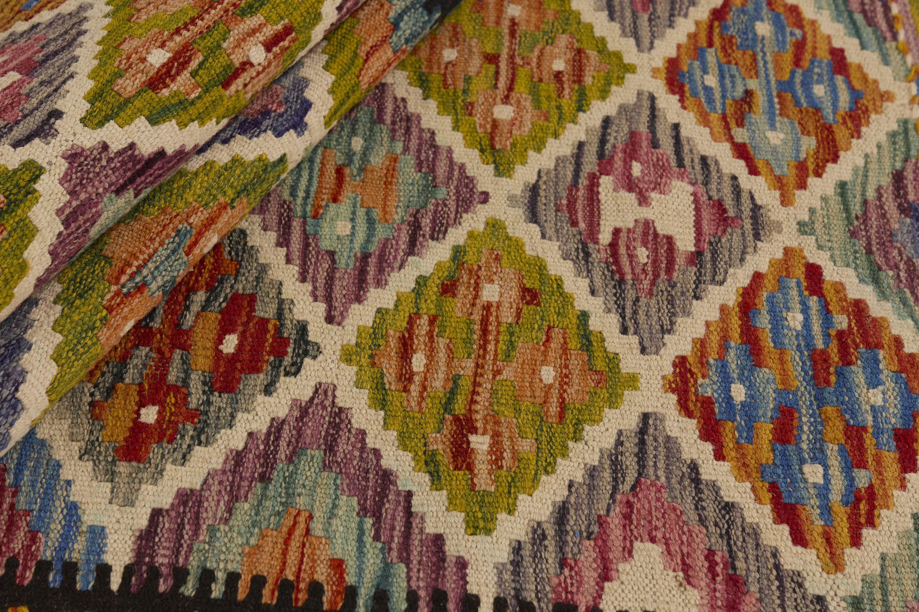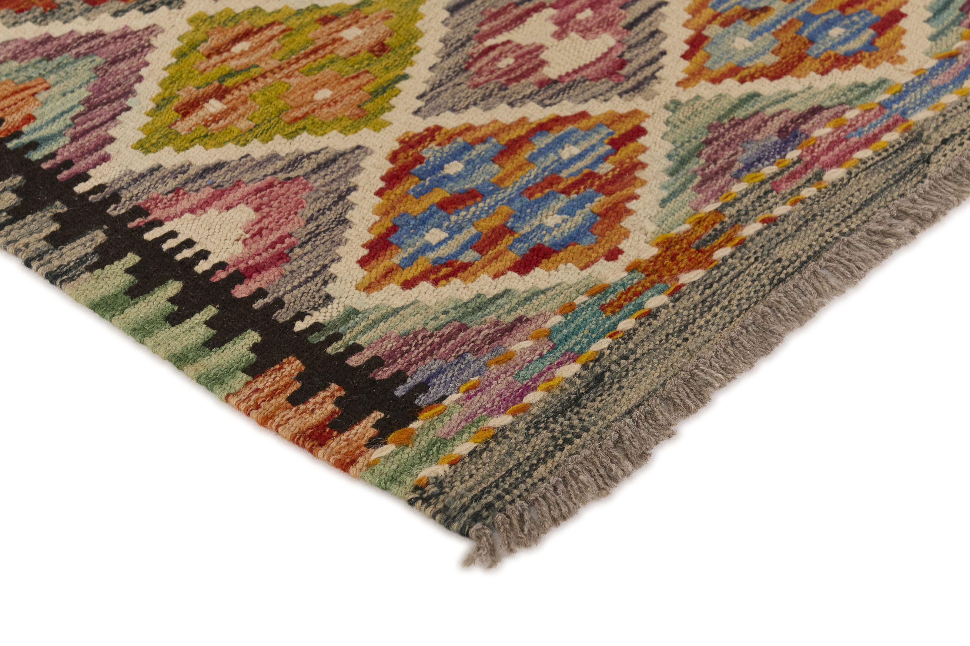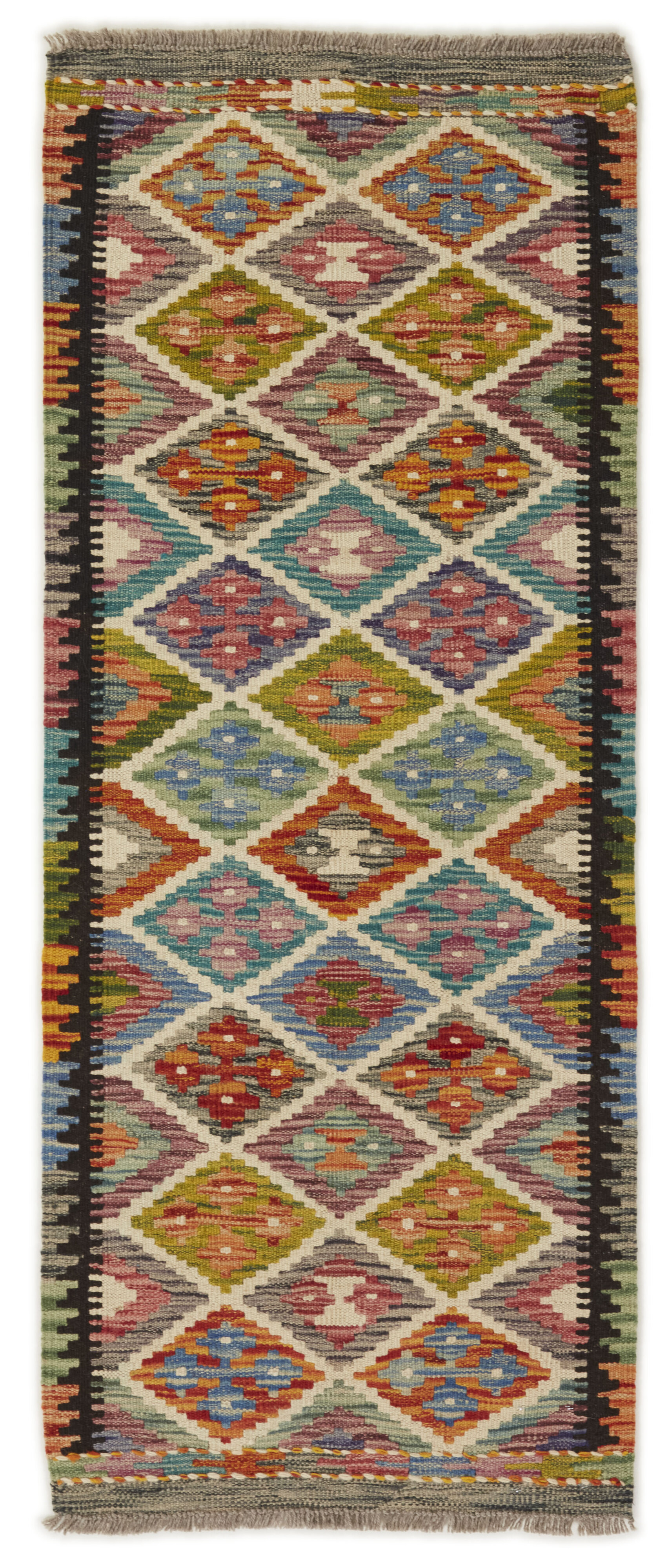 Afghan KelimItem no.: 1521570 Size: 61 cm x 150 cmAfghan Kelim rugs are hand woven by Turkmens in northern Afghanistan. Kelim is the name of a common Persian weave, but also of the technology used in the production. Kelims are primarily produced by nomads and are pile-less rugs, which are also used for bags, as wall decoration, or as curtains for tents. A natural colour scale with geometrical symbols and octagons is used.