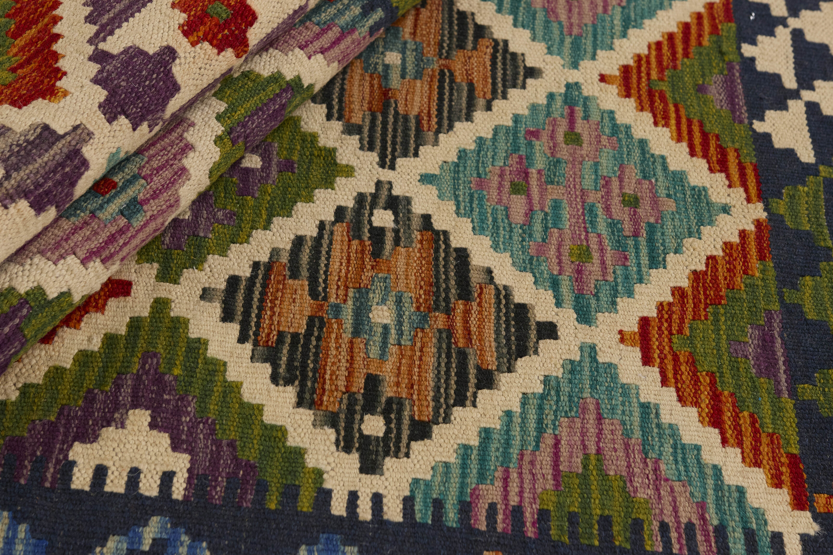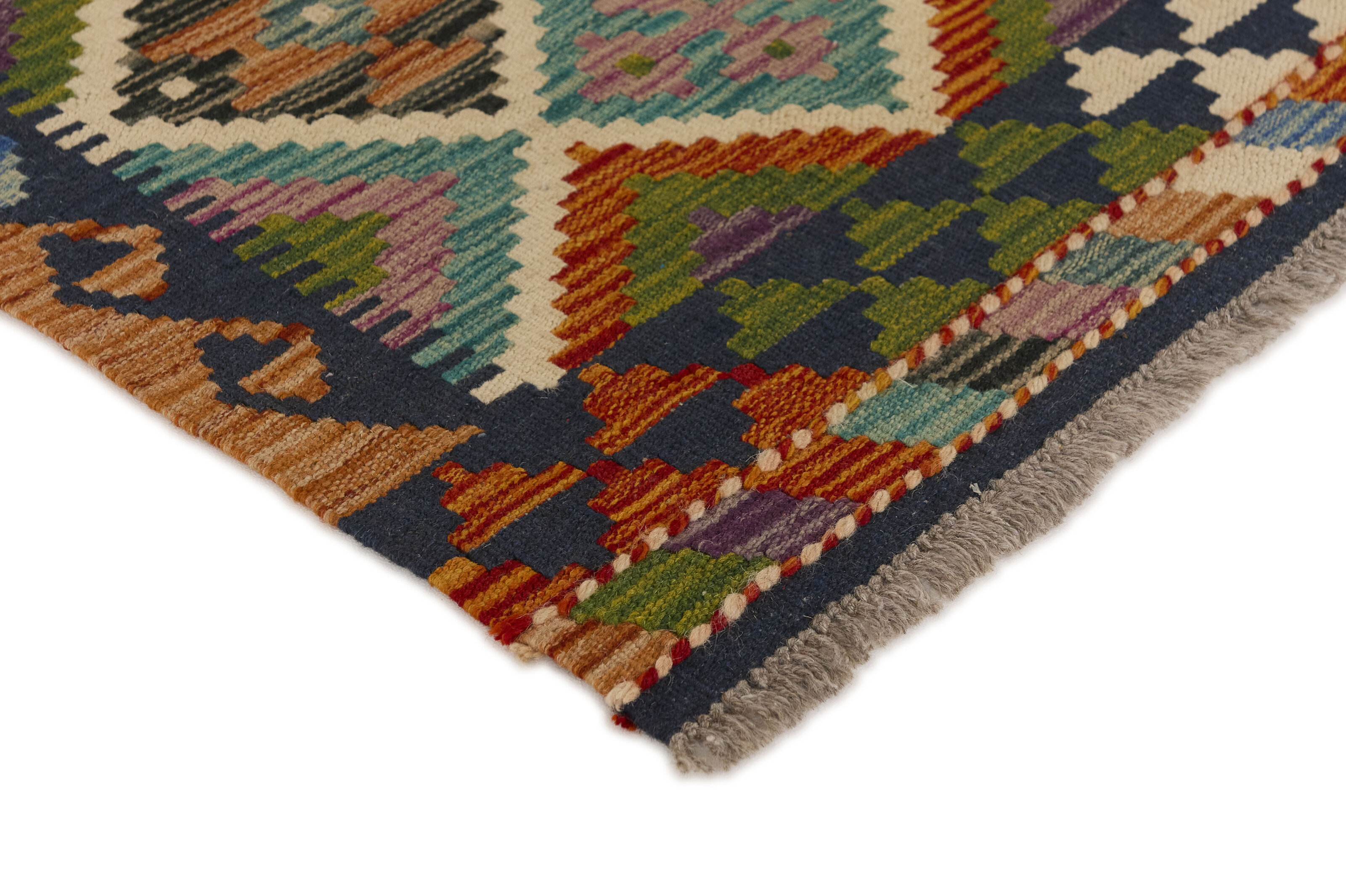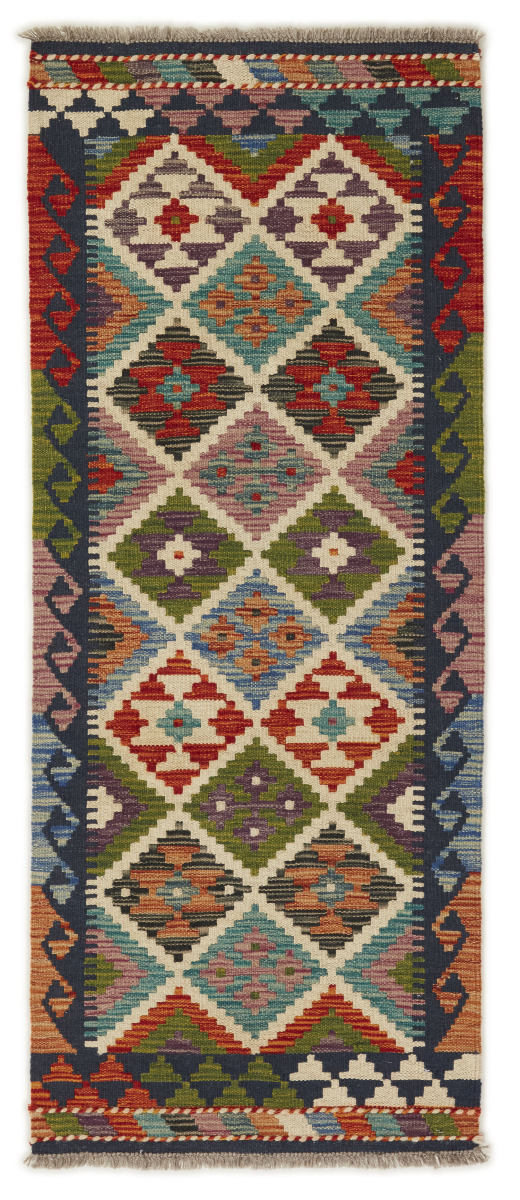 Afghan KelimItem no.: 1521576 Size: 61 cm x 151 cmAfghan Kelim rugs are hand woven by Turkmens in northern Afghanistan. Kelim is the name of a common Persian weave, but also of the technology used in the production. Kelims are primarily produced by nomads and are pile-less rugs, which are also used for bags, as wall decoration, or as curtains for tents. A natural colour scale with geometrical symbols and octagons is used.