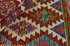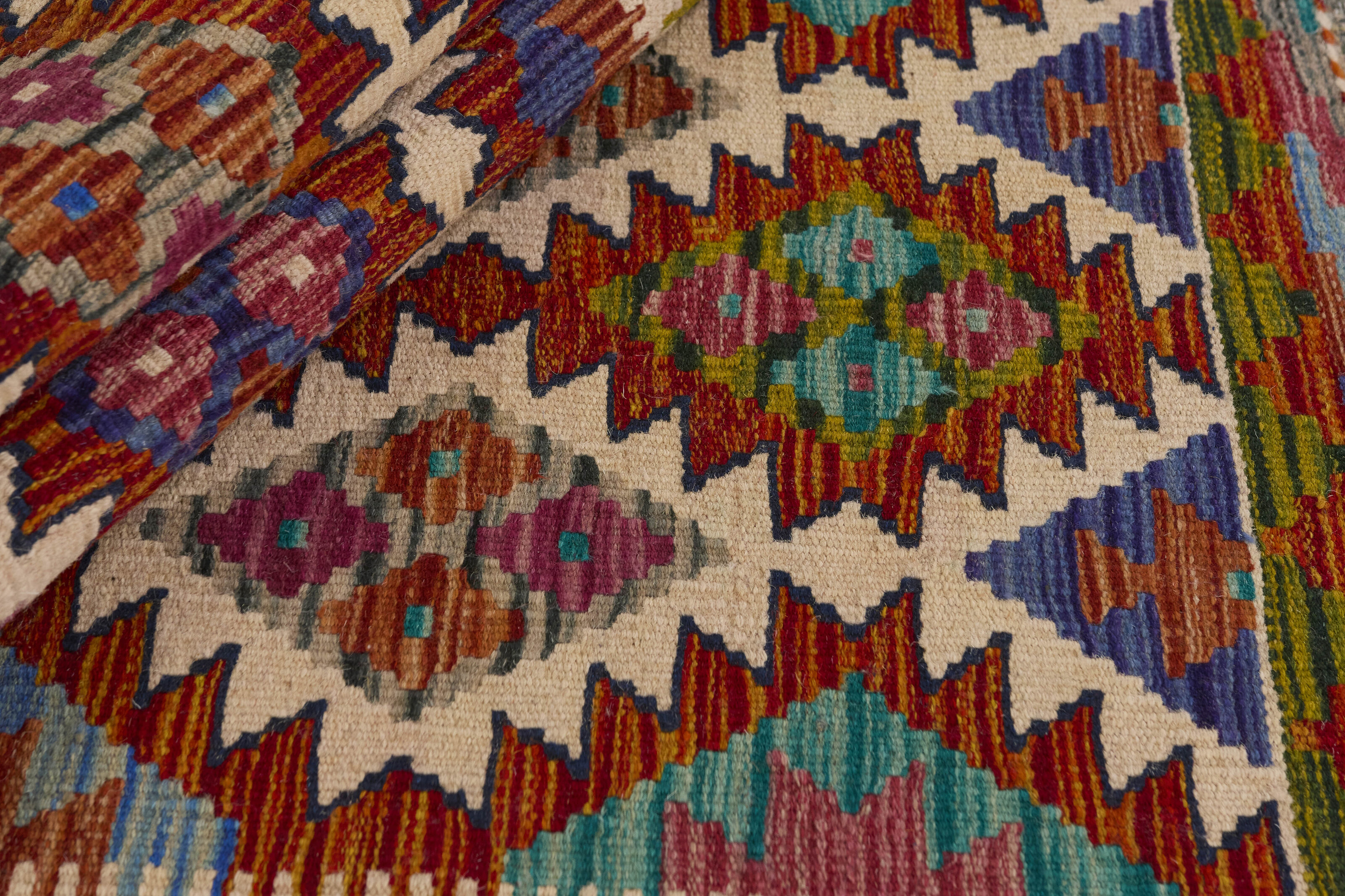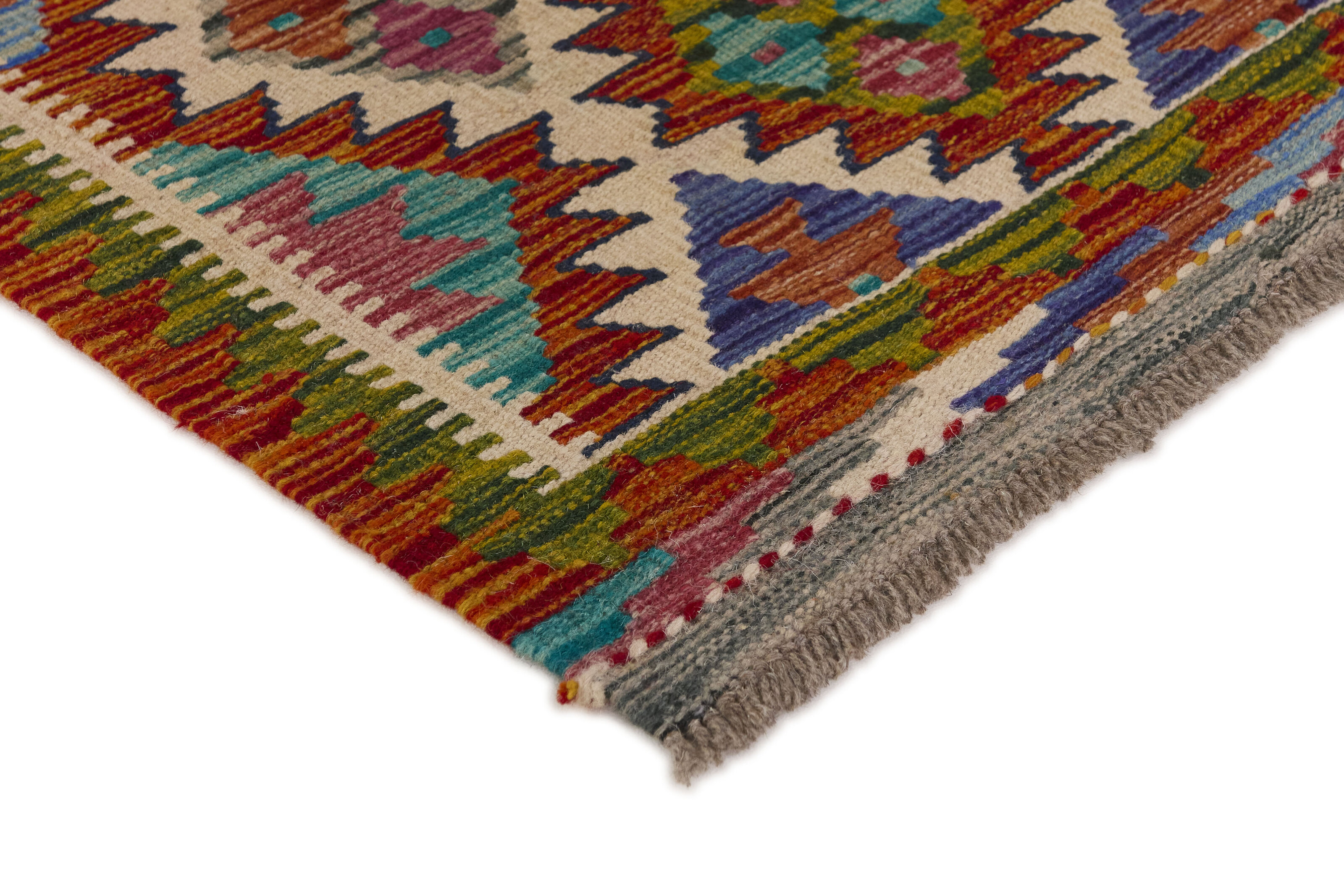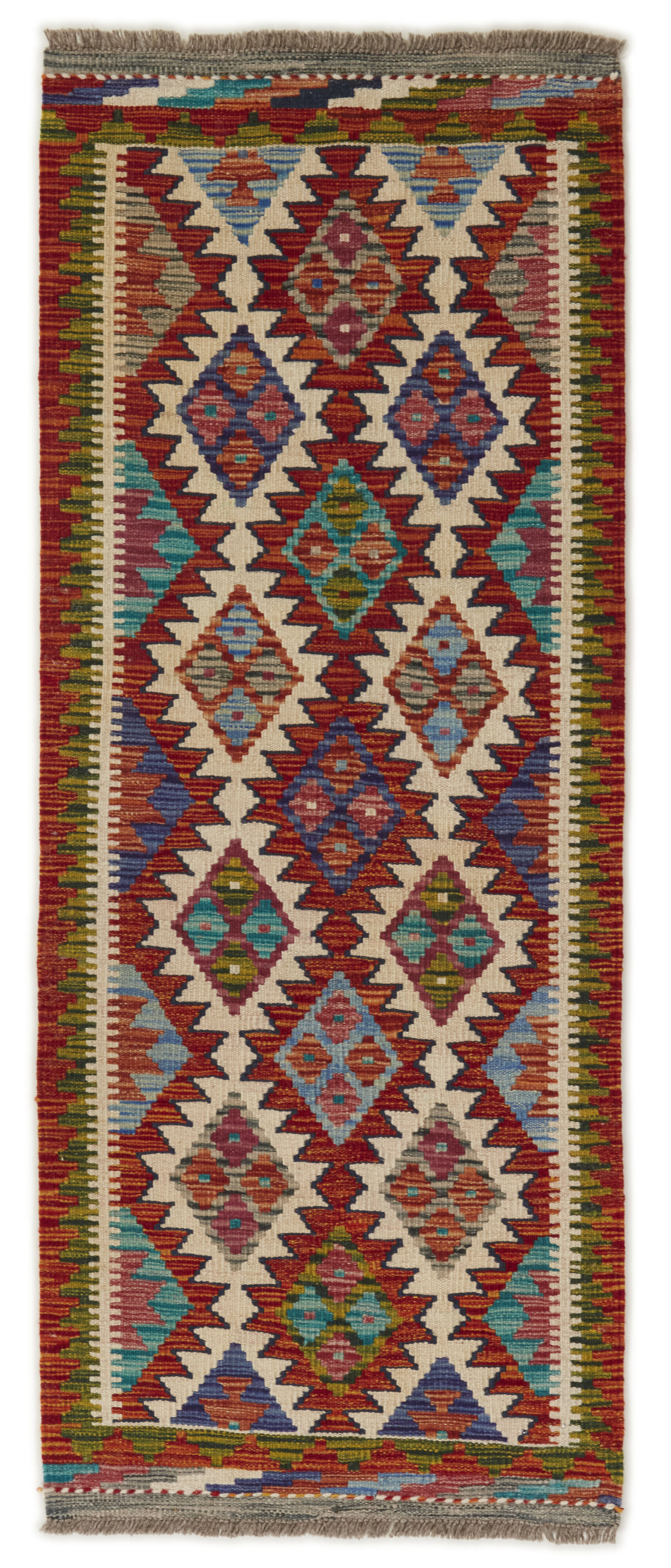 Afghan KelimItem no.: 1521582 Size: 62 cm x 155 cmAfghan Kelim rugs are hand woven by Turkmens in northern Afghanistan. Kelim is the name of a common Persian weave, but also of the technology used in the production. Kelims are primarily produced by nomads and are pile-less rugs, which are also used for bags, as wall decoration, or as curtains for tents. A natural colour scale with geometrical symbols and octagons is used.