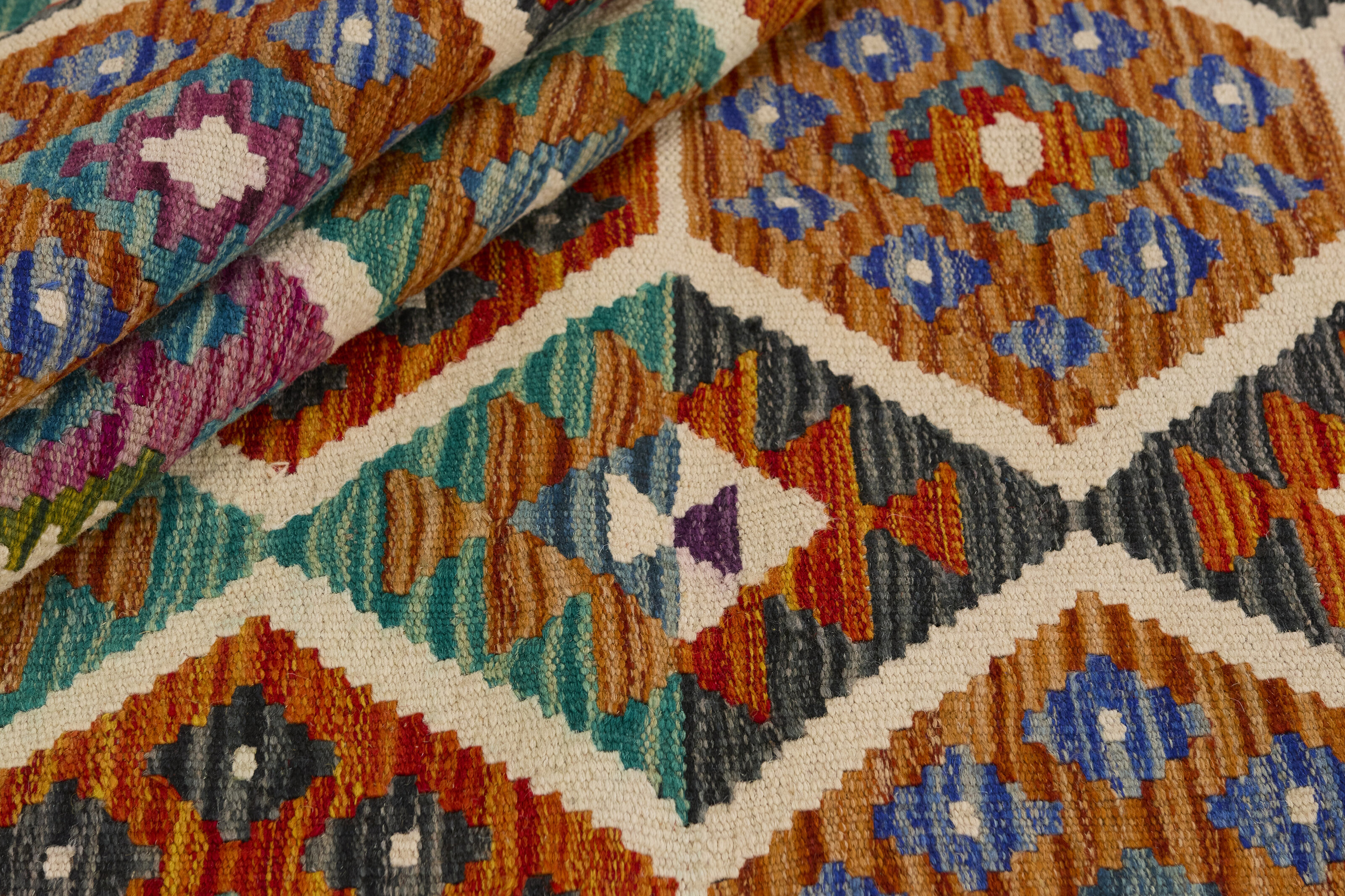 Afghan KelimItem no.: 1521584 Size: 132 cm x 176 cmAfghan Kelim rugs are hand woven by Turkmens in northern Afghanistan. Kelim is the name of a common Persian weave, but also of the technology used in the production. Kelims are primarily produced by nomads and are pile-less rugs, which are also used for bags, as wall decoration, or as curtains for tents. A natural colour scale with geometrical symbols and octagons is used.