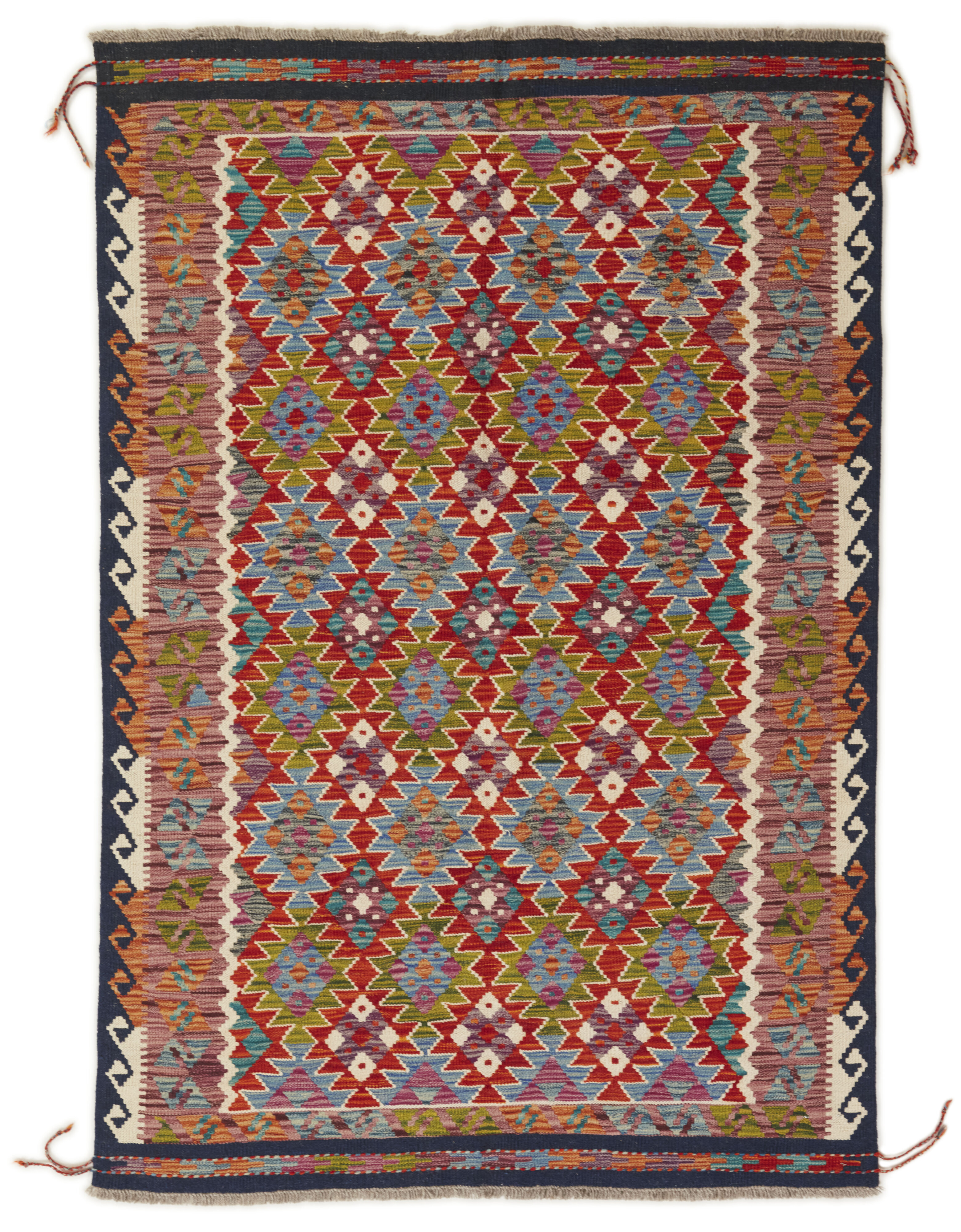 Afghan KelimItem no.: 1521591 Size: 125 cm x 184 cmAfghan Kelim rugs are hand woven by Turkmens in northern Afghanistan. Kelim is the name of a common Persian weave, but also of the technology used in the production. Kelims are primarily produced by nomads and are pile-less rugs, which are also used for bags, as wall decoration, or as curtains for tents. A natural colour scale with geometrical symbols and octagons is used.