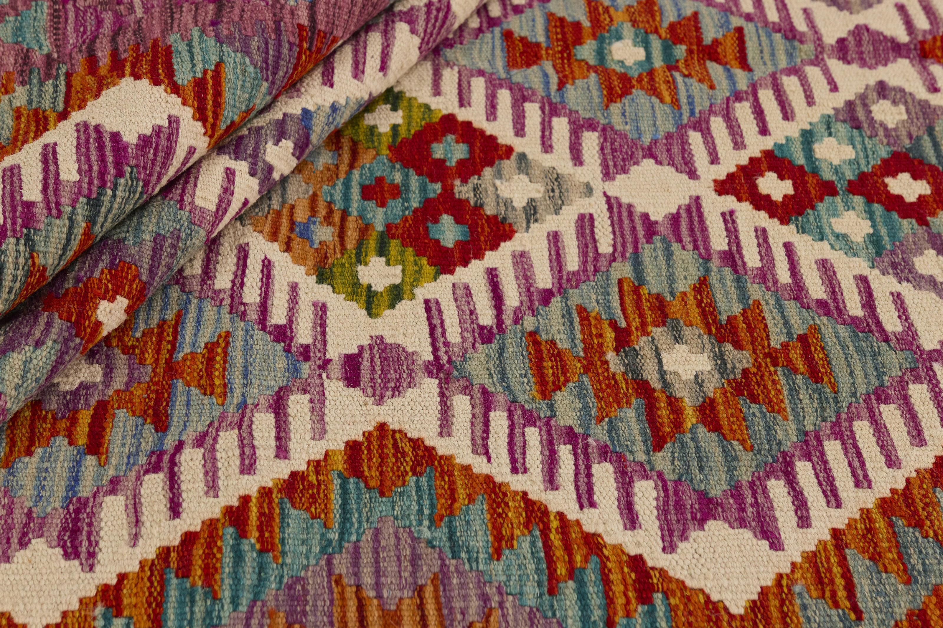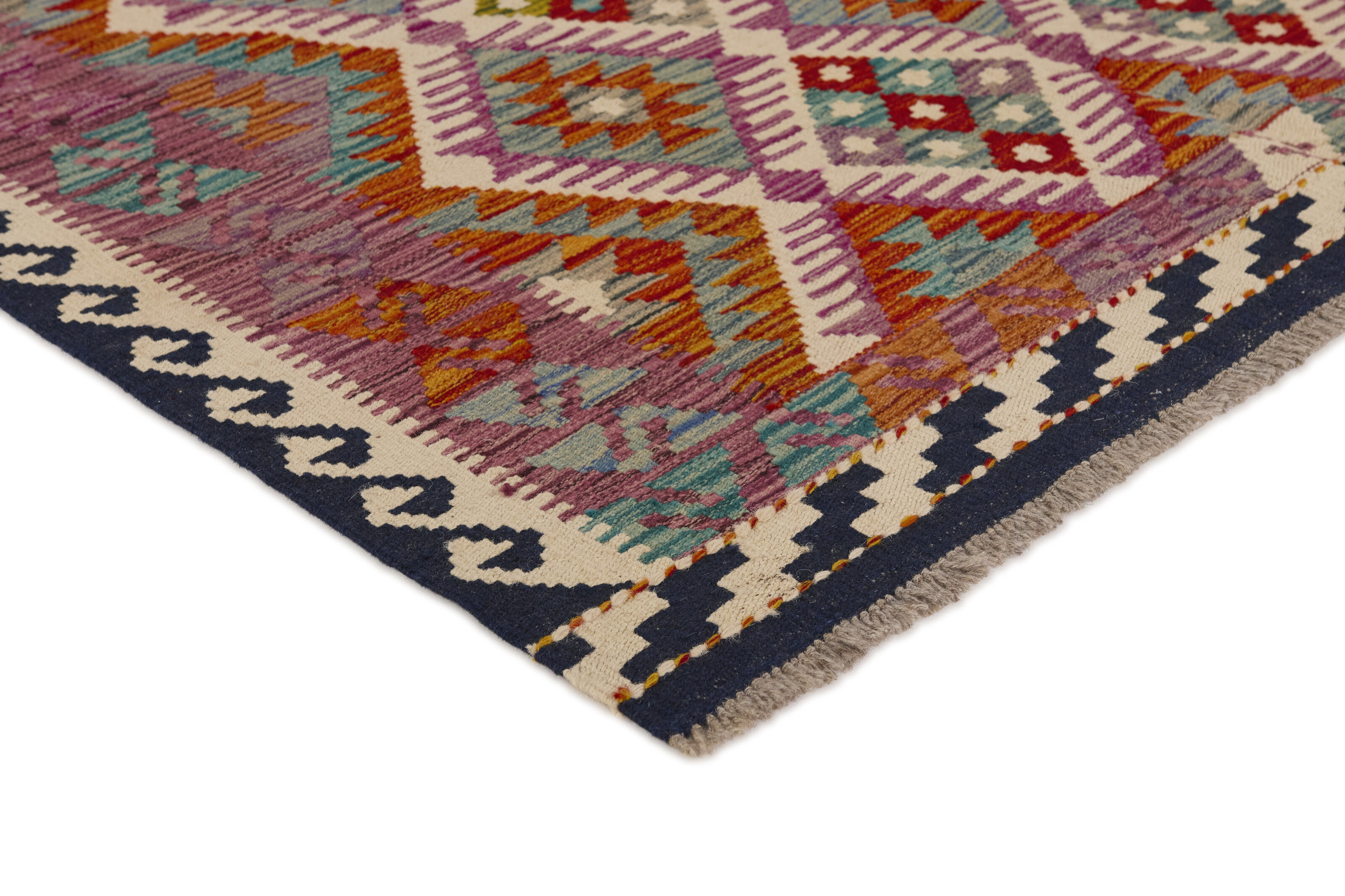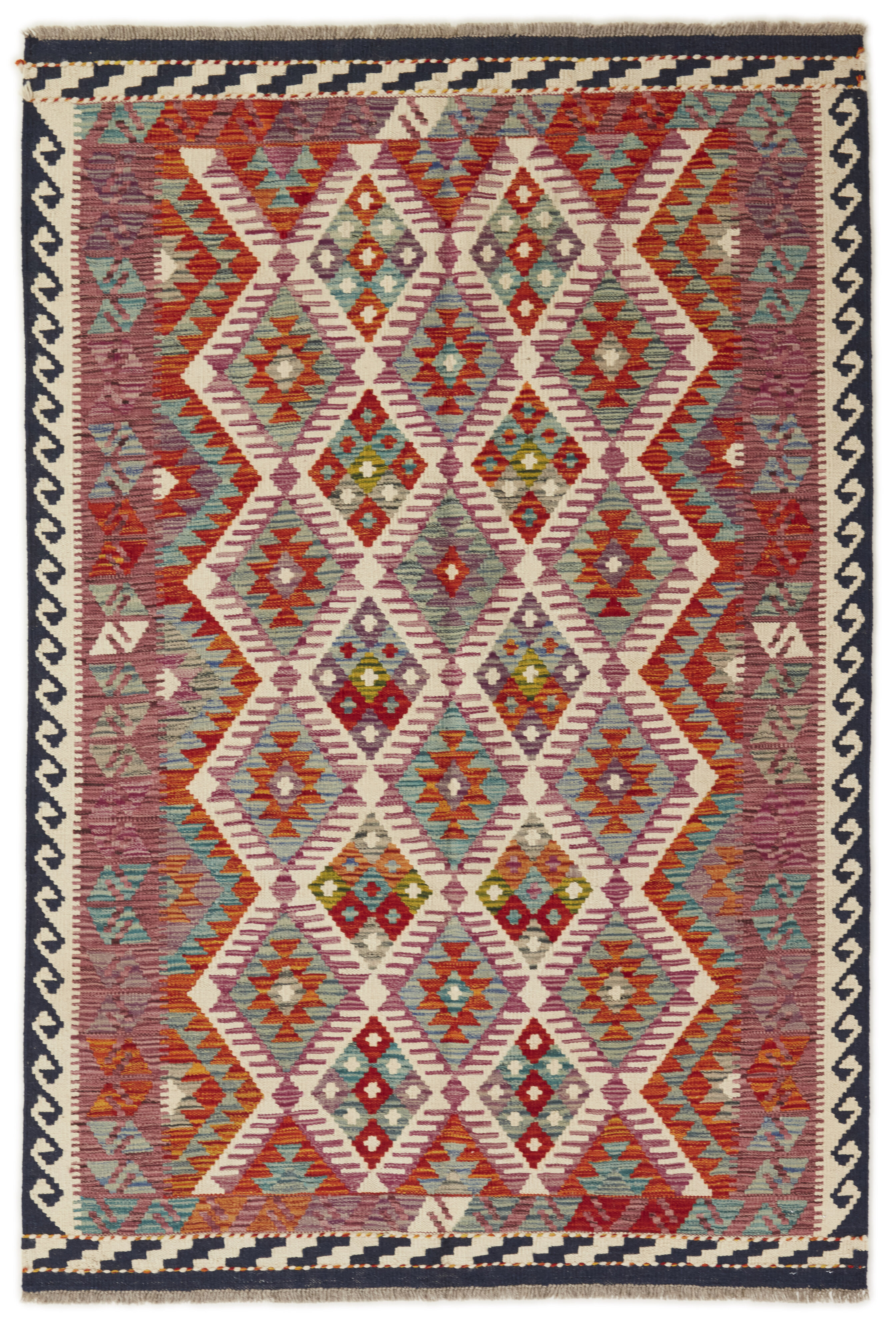 Afghan KelimItem no.: 1521592 Size: 124 cm x 184 cmAfghan Kelim rugs are hand woven by Turkmens in northern Afghanistan. Kelim is the name of a common Persian weave, but also of the technology used in the production. Kelims are primarily produced by nomads and are pile-less rugs, which are also used for bags, as wall decoration, or as curtains for tents. A natural colour scale with geometrical symbols and octagons is used.