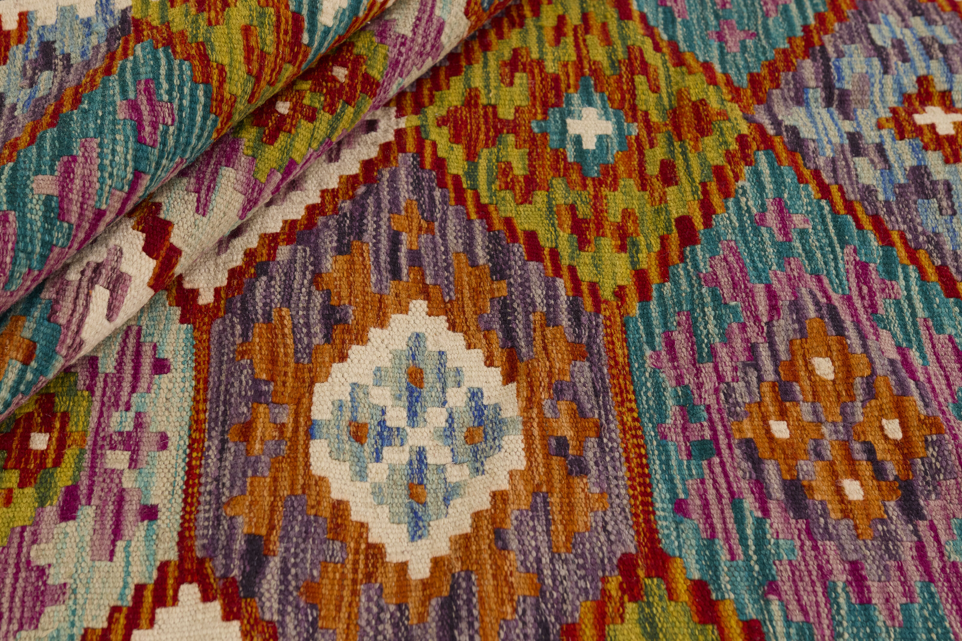 Afghan KelimItem no.: 1521595 Size: 120 cm x 185 cmAfghan Kelim rugs are hand woven by Turkmens in northern Afghanistan. Kelim is the name of a common Persian weave, but also of the technology used in the production. Kelims are primarily produced by nomads and are pile-less rugs, which are also used for bags, as wall decoration, or as curtains for tents. A natural colour scale with geometrical symbols and octagons is used.