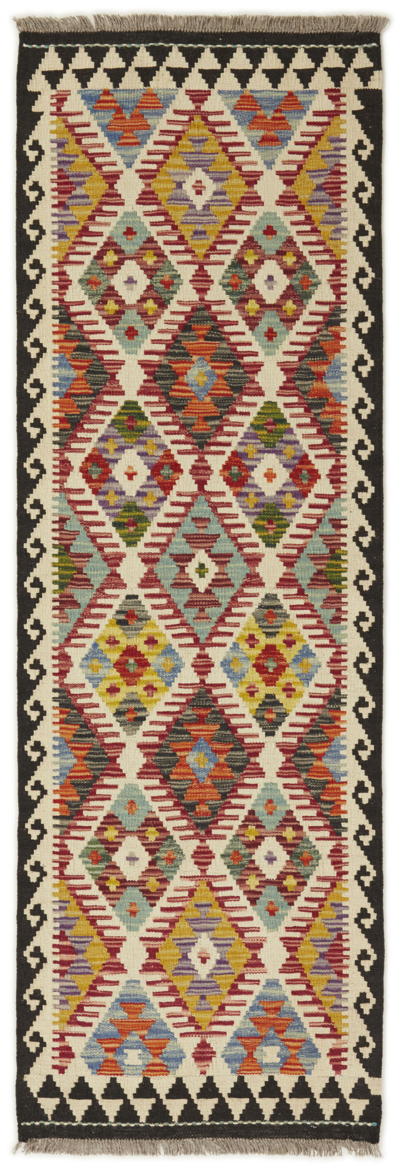 Afghan KelimItem no.: 1521606 Size: 63 cm x 191 cmAfghan Kelim rugs are hand woven by Turkmens in northern Afghanistan. Kelim is the name of a common Persian weave, but also of the technology used in the production. Kelims are primarily produced by nomads and are pile-less rugs, which are also used for bags, as wall decoration, or as curtains for tents. A natural colour scale with geometrical symbols and octagons is used.