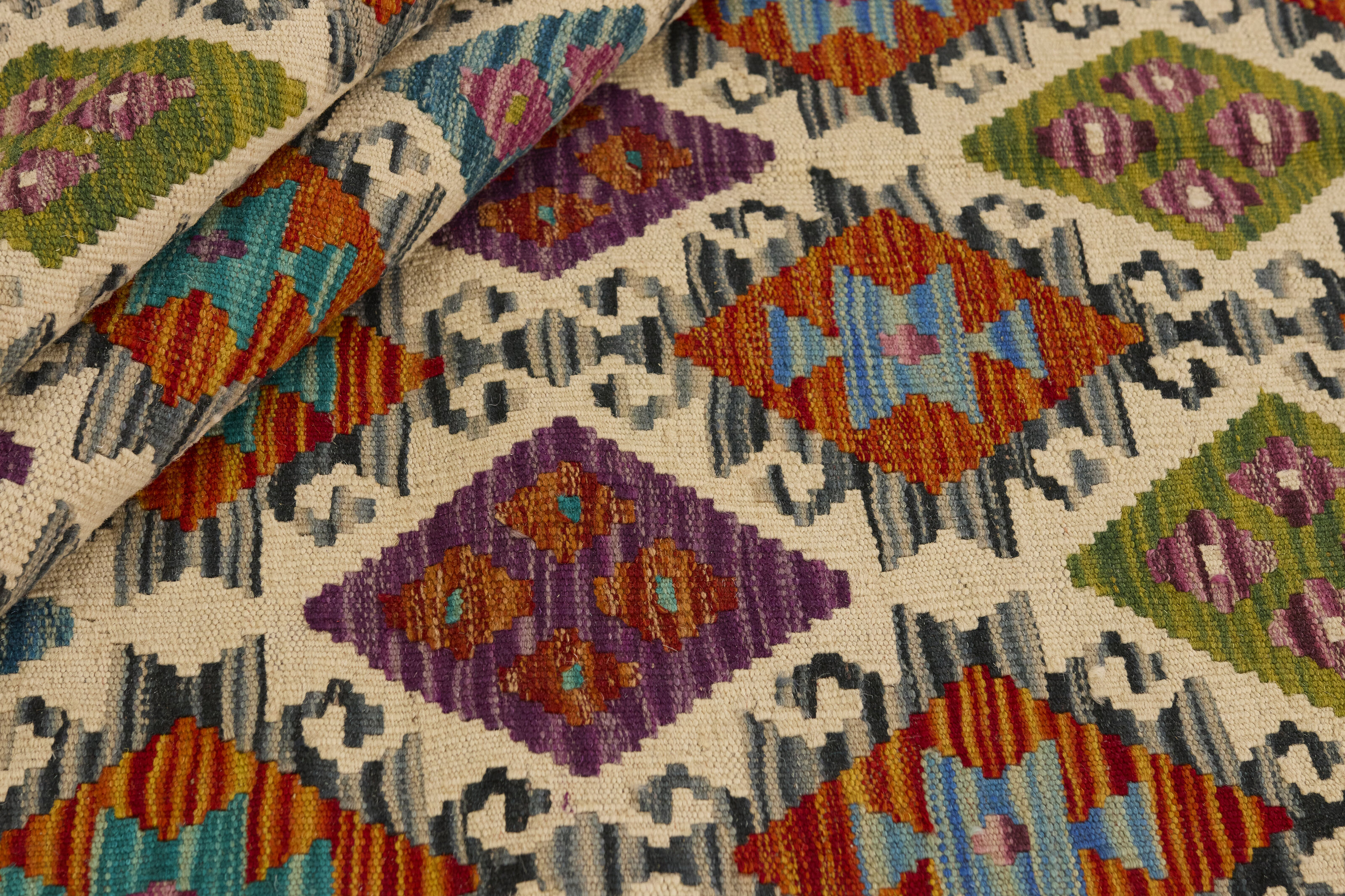 Afghan KelimItem no.: 1521612 Size: 122 cm x 192 cmAfghan Kelim rugs are hand woven by Turkmens in northern Afghanistan. Kelim is the name of a common Persian weave, but also of the technology used in the production. Kelims are primarily produced by nomads and are pile-less rugs, which are also used for bags, as wall decoration, or as curtains for tents. A natural colour scale with geometrical symbols and octagons is used.