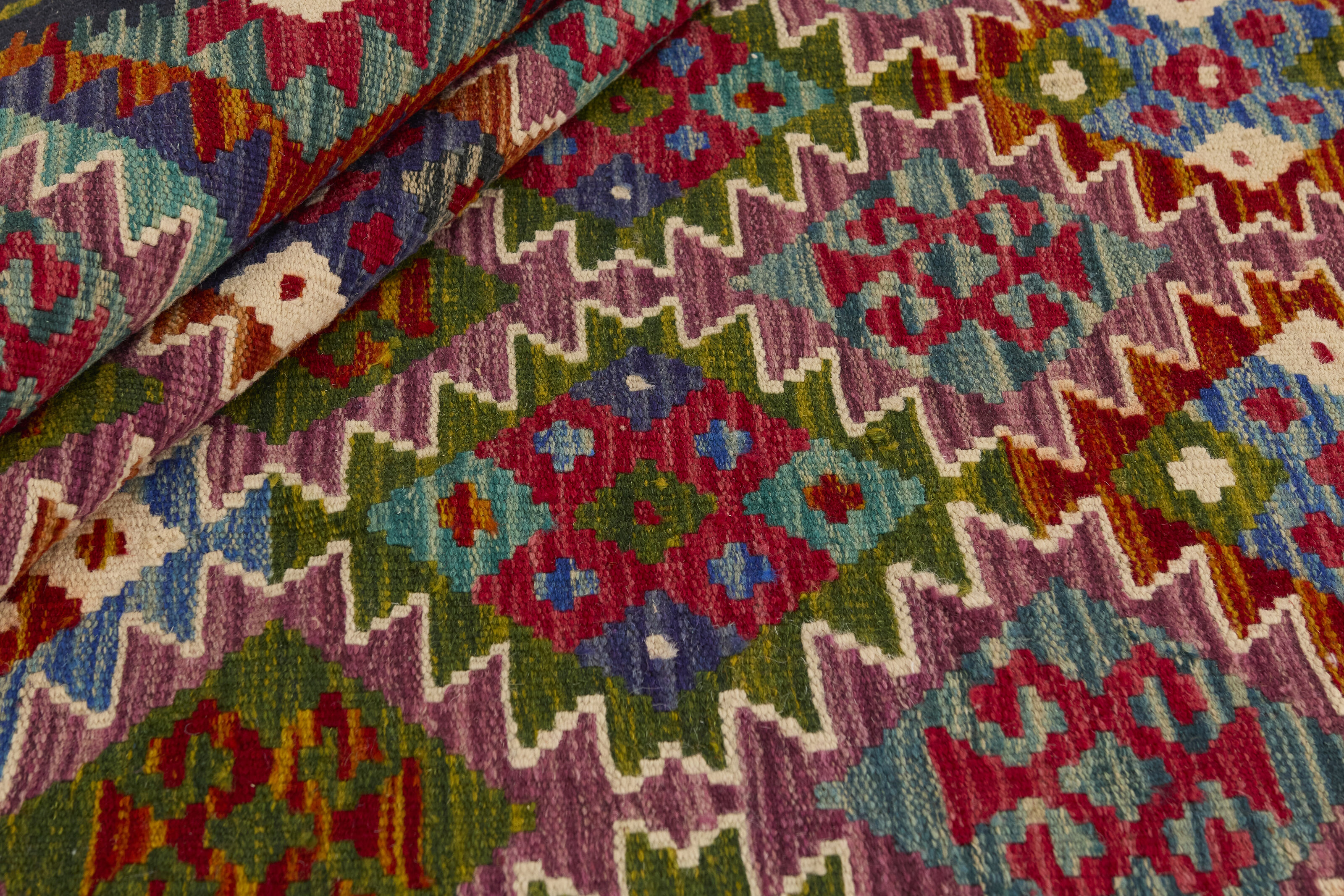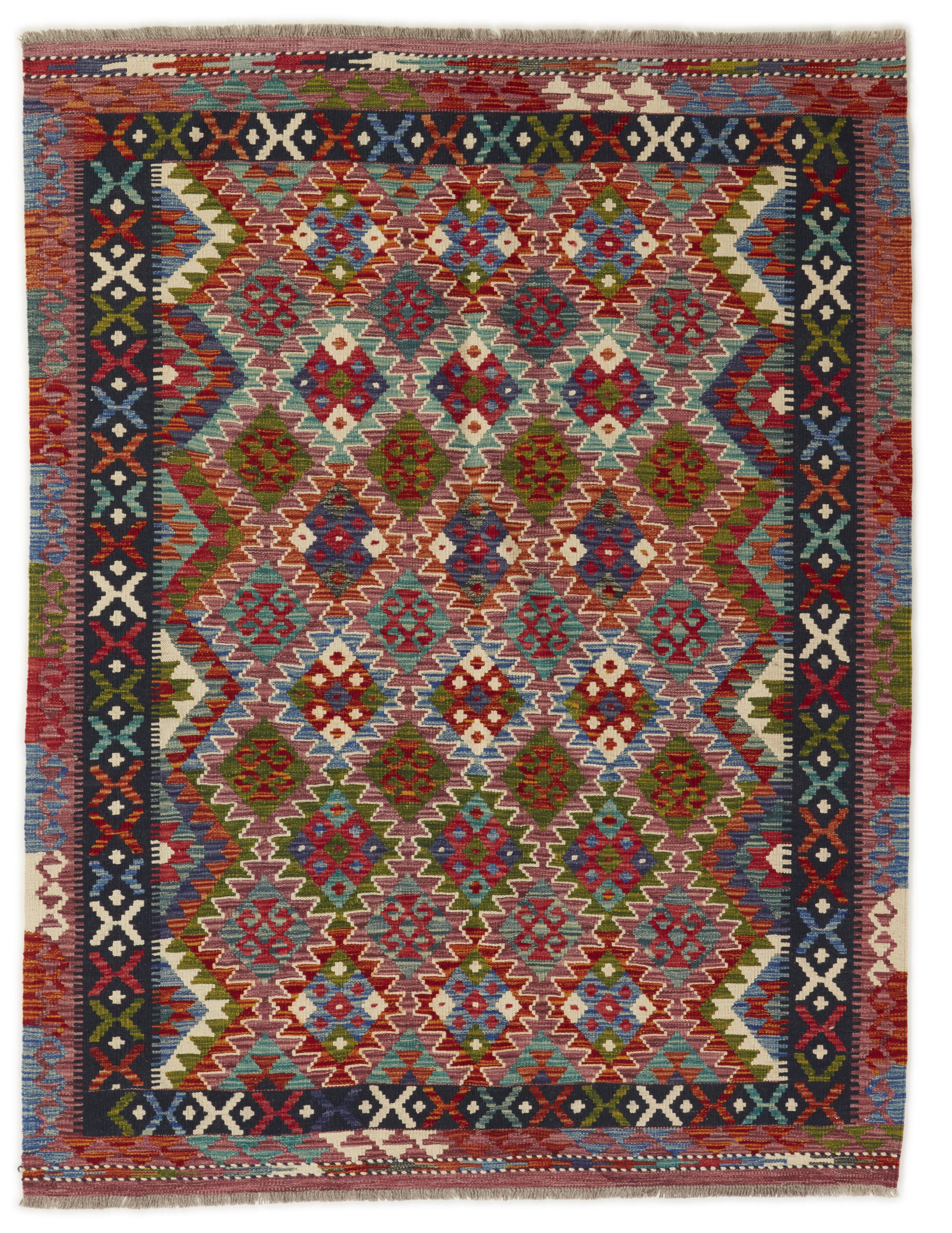 Afghan KelimItem no.: 1521616 Size: 150 cm x 195 cmAfghan Kelim rugs are hand woven by Turkmens in northern Afghanistan. Kelim is the name of a common Persian weave, but also of the technology used in the production. Kelims are primarily produced by nomads and are pile-less rugs, which are also used for bags, as wall decoration, or as curtains for tents. A natural colour scale with geometrical symbols and octagons is used.