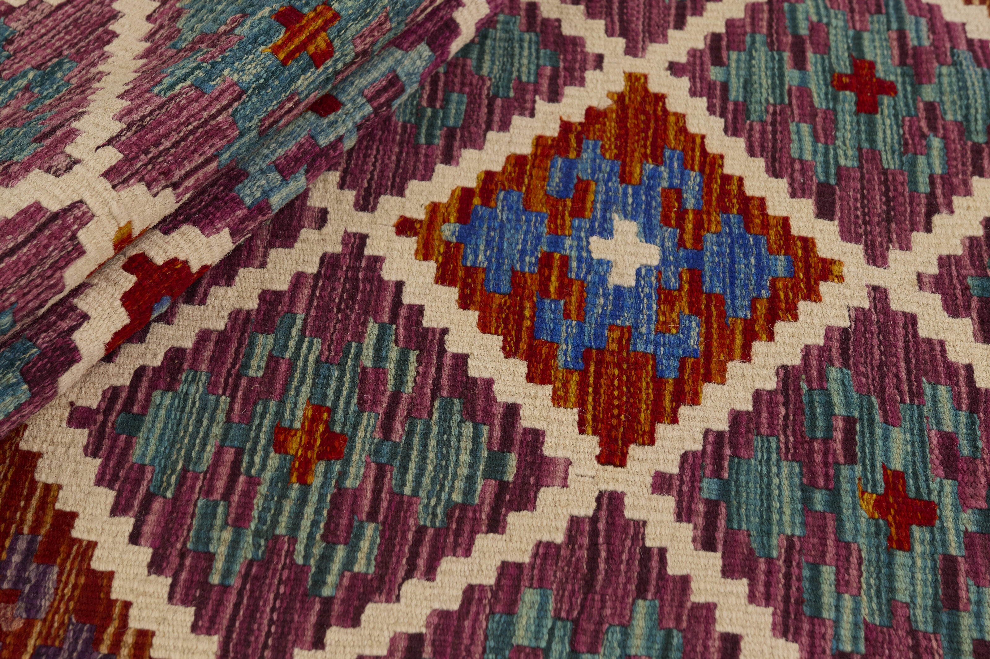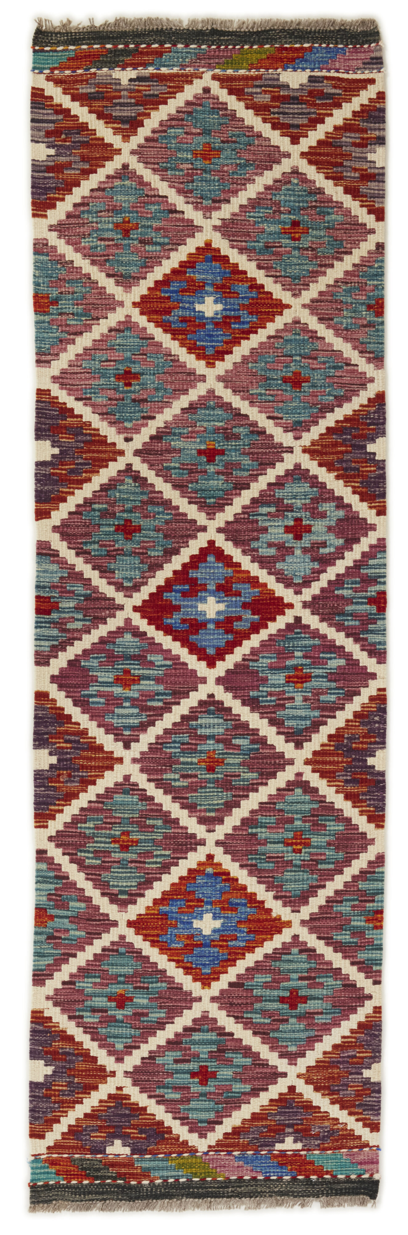 Afghan KelimItem no.: 1521622 Size: 58 cm x 197 cmAfghan Kelim rugs are hand woven by Turkmens in northern Afghanistan. Kelim is the name of a common Persian weave, but also of the technology used in the production. Kelims are primarily produced by nomads and are pile-less rugs, which are also used for bags, as wall decoration, or as curtains for tents. A natural colour scale with geometrical symbols and octagons is used.