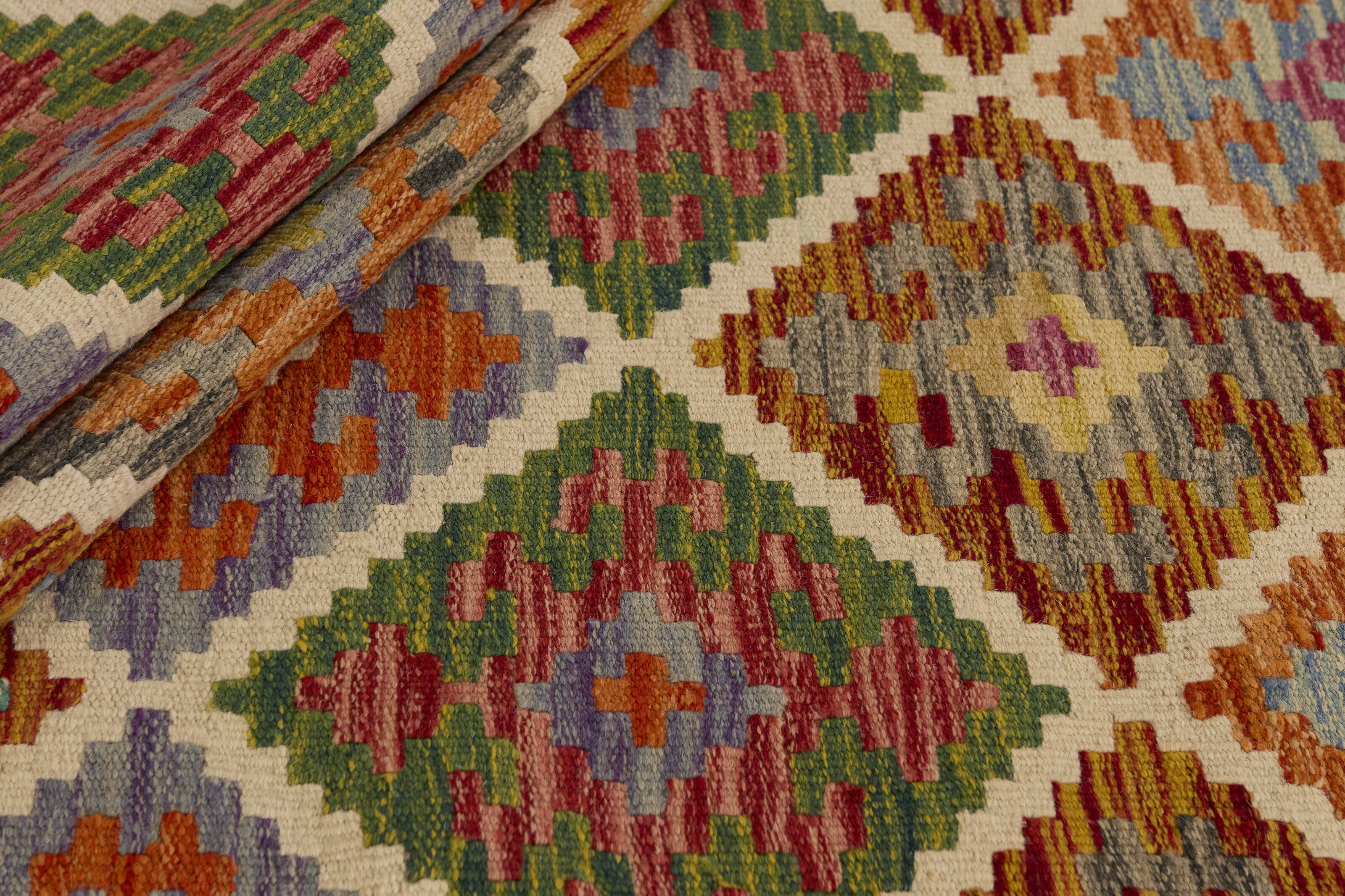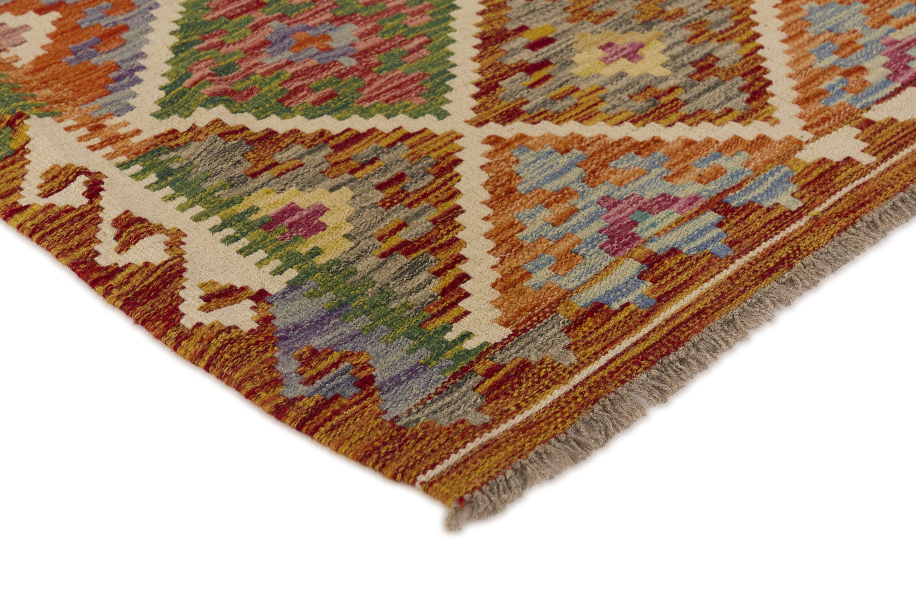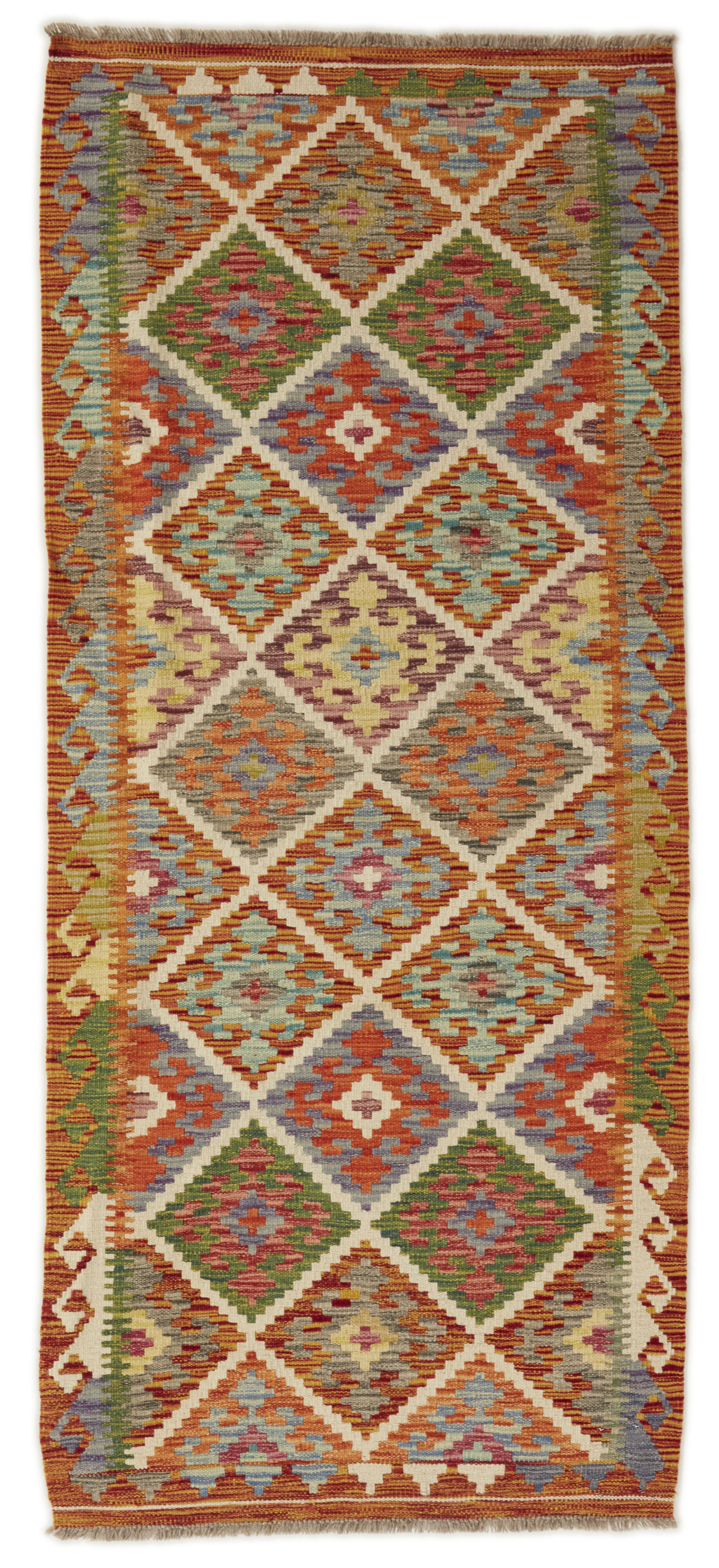 Afghan KelimItem no.: 1521624 Size: 85 cm x 197 cmAfghan Kelim rugs are hand woven by Turkmens in northern Afghanistan. Kelim is the name of a common Persian weave, but also of the technology used in the production. Kelims are primarily produced by nomads and are pile-less rugs, which are also used for bags, as wall decoration, or as curtains for tents. A natural colour scale with geometrical symbols and octagons is used.