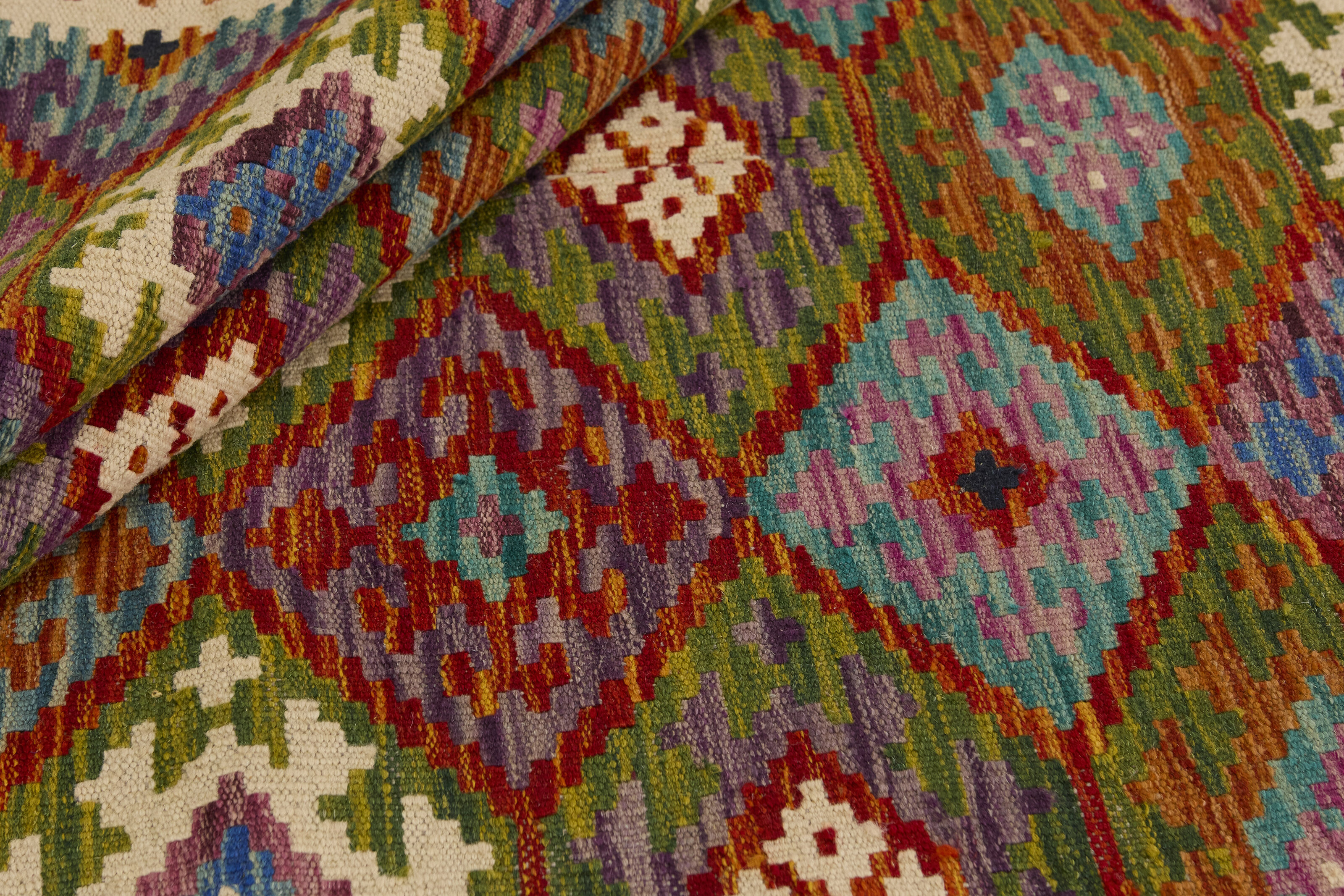 Afghan KelimItem no.: 1521626 Size: 147 cm x 197 cmAfghan Kelim rugs are hand woven by Turkmens in northern Afghanistan. Kelim is the name of a common Persian weave, but also of the technology used in the production. Kelims are primarily produced by nomads and are pile-less rugs, which are also used for bags, as wall decoration, or as curtains for tents. A natural colour scale with geometrical symbols and octagons is used.