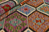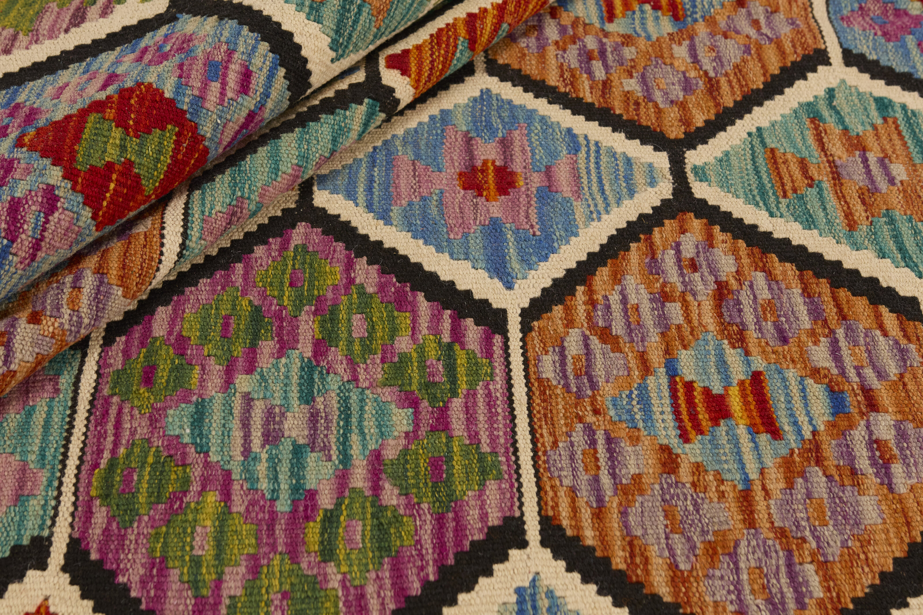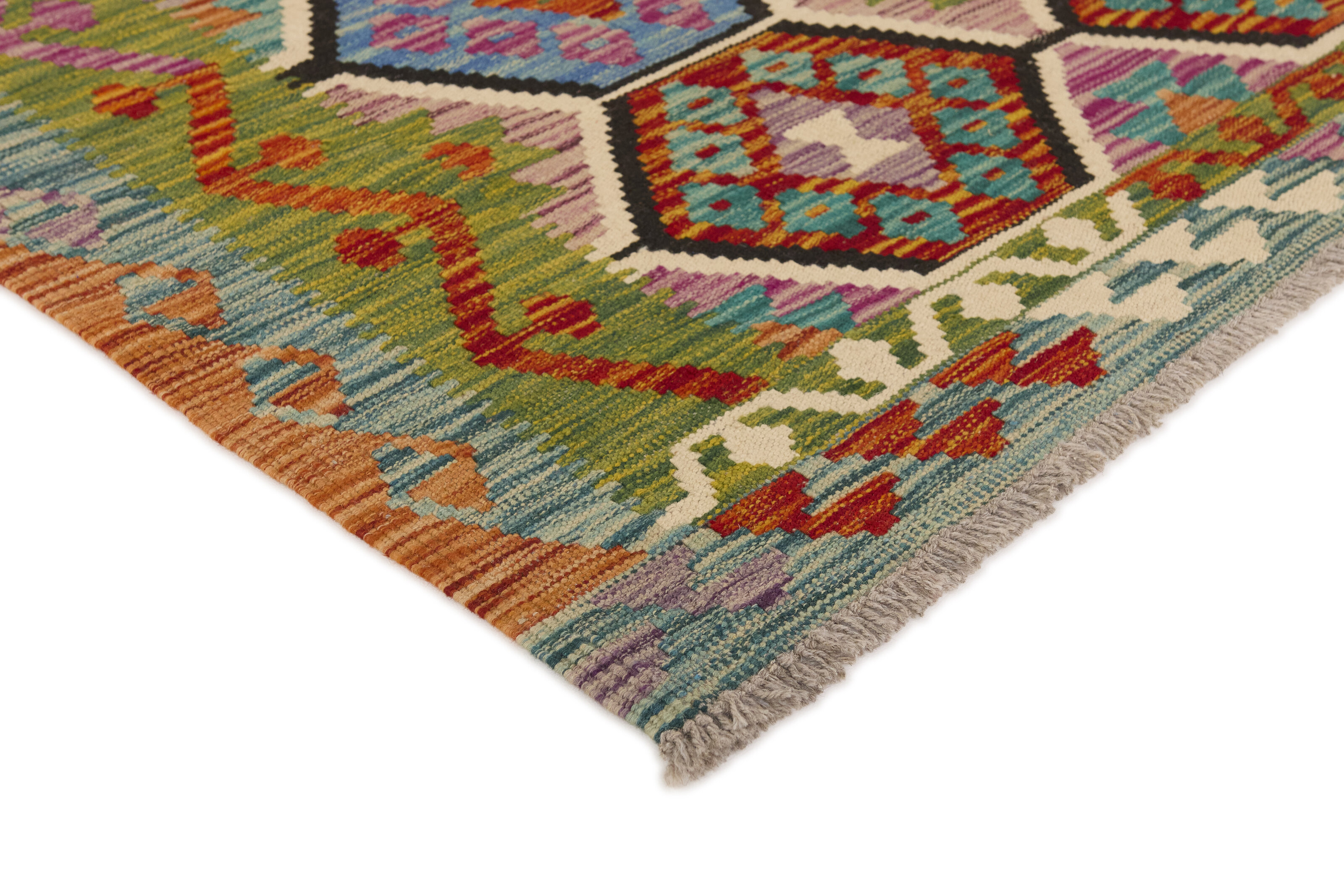 Afghan KelimItem no.: 1521633 Size: 141 cm x 198 cmAfghan Kelim rugs are hand woven by Turkmens in northern Afghanistan. Kelim is the name of a common Persian weave, but also of the technology used in the production. Kelims are primarily produced by nomads and are pile-less rugs, which are also used for bags, as wall decoration, or as curtains for tents. A natural colour scale with geometrical symbols and octagons is used.
