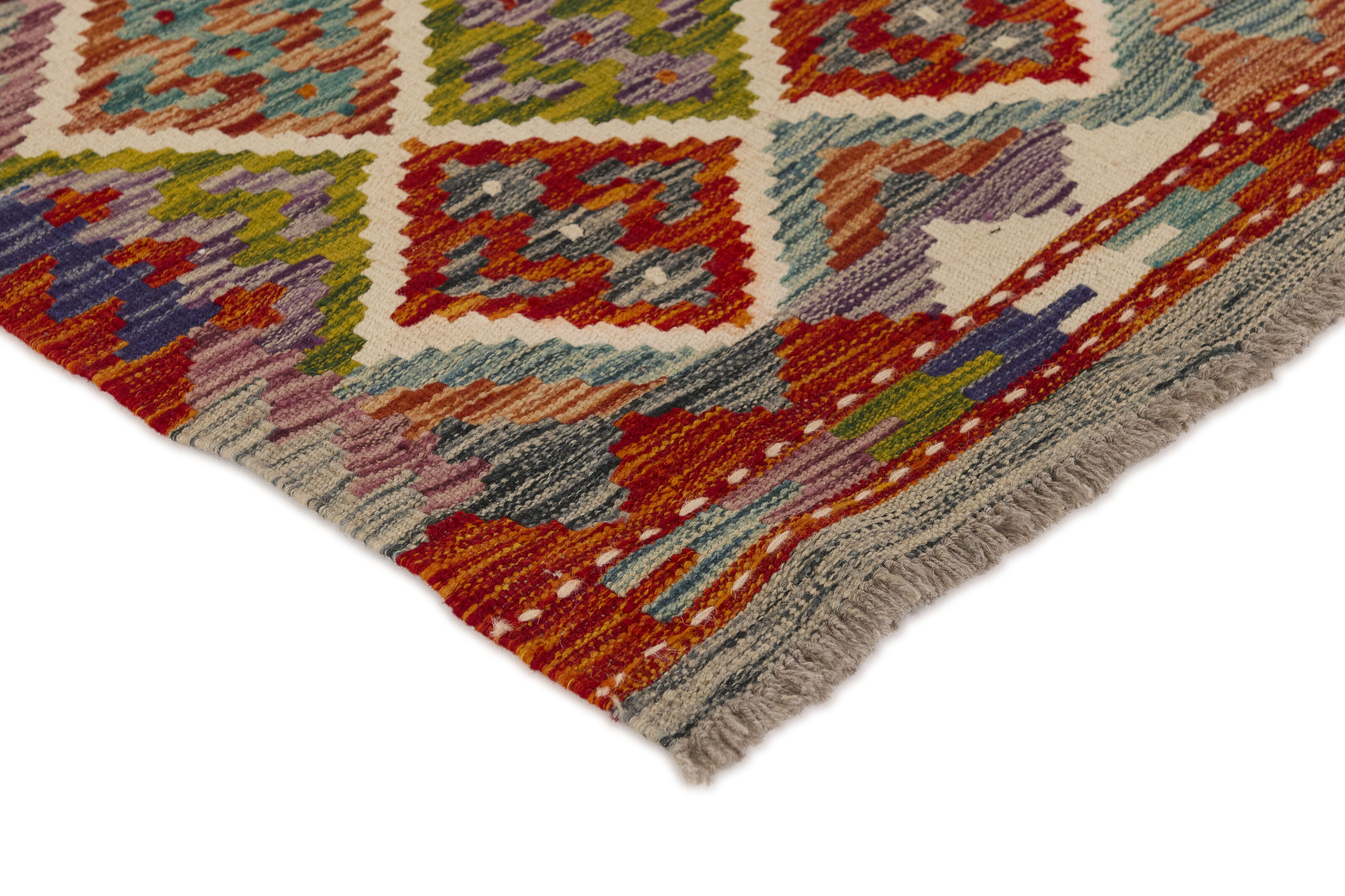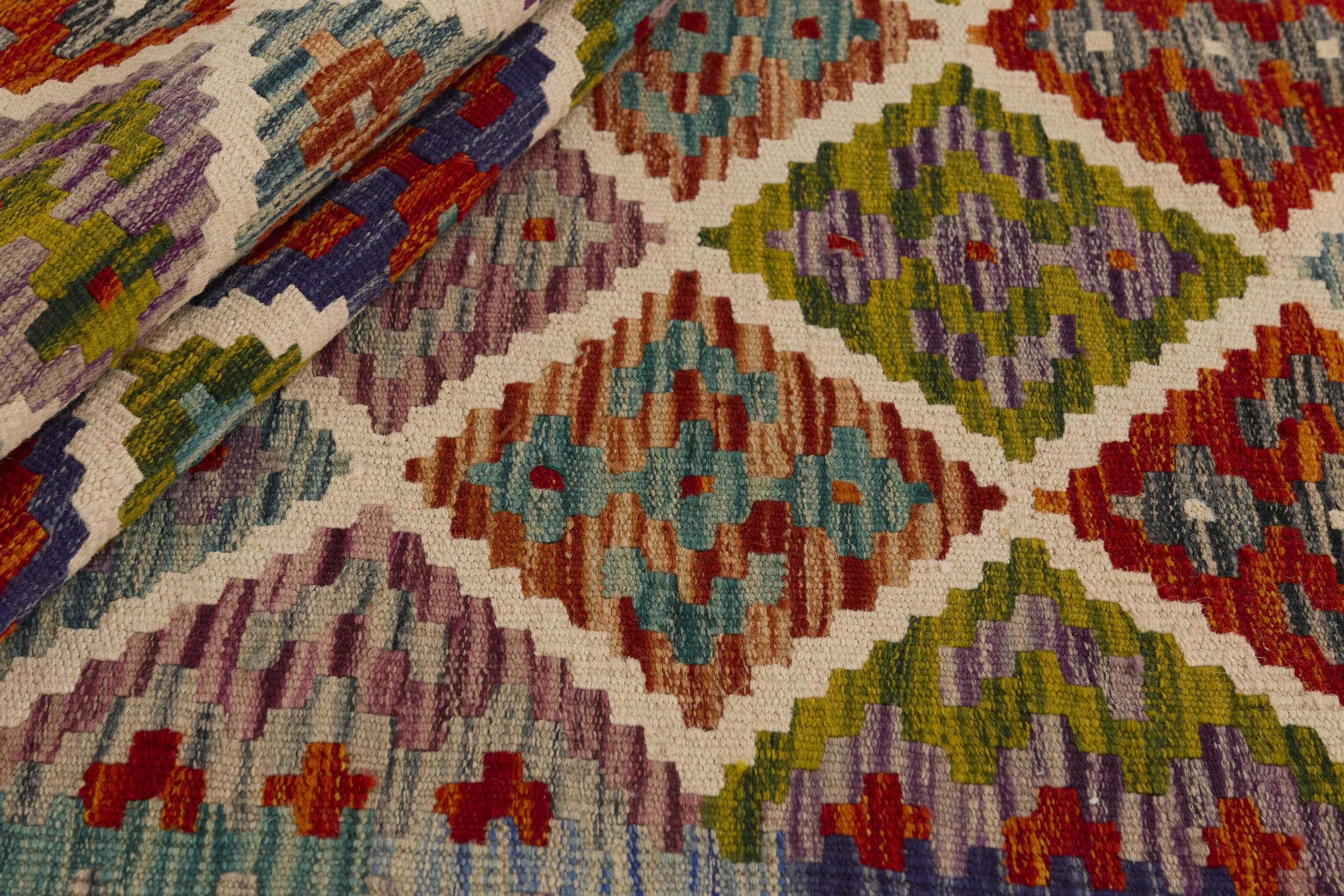 Afghan KelimItem no.: 1521638 Size: 62 cm x 200 cmAfghan Kelim rugs are hand woven by Turkmens in northern Afghanistan. Kelim is the name of a common Persian weave, but also of the technology used in the production. Kelims are primarily produced by nomads and are pile-less rugs, which are also used for bags, as wall decoration, or as curtains for tents. A natural colour scale with geometrical symbols and octagons is used.