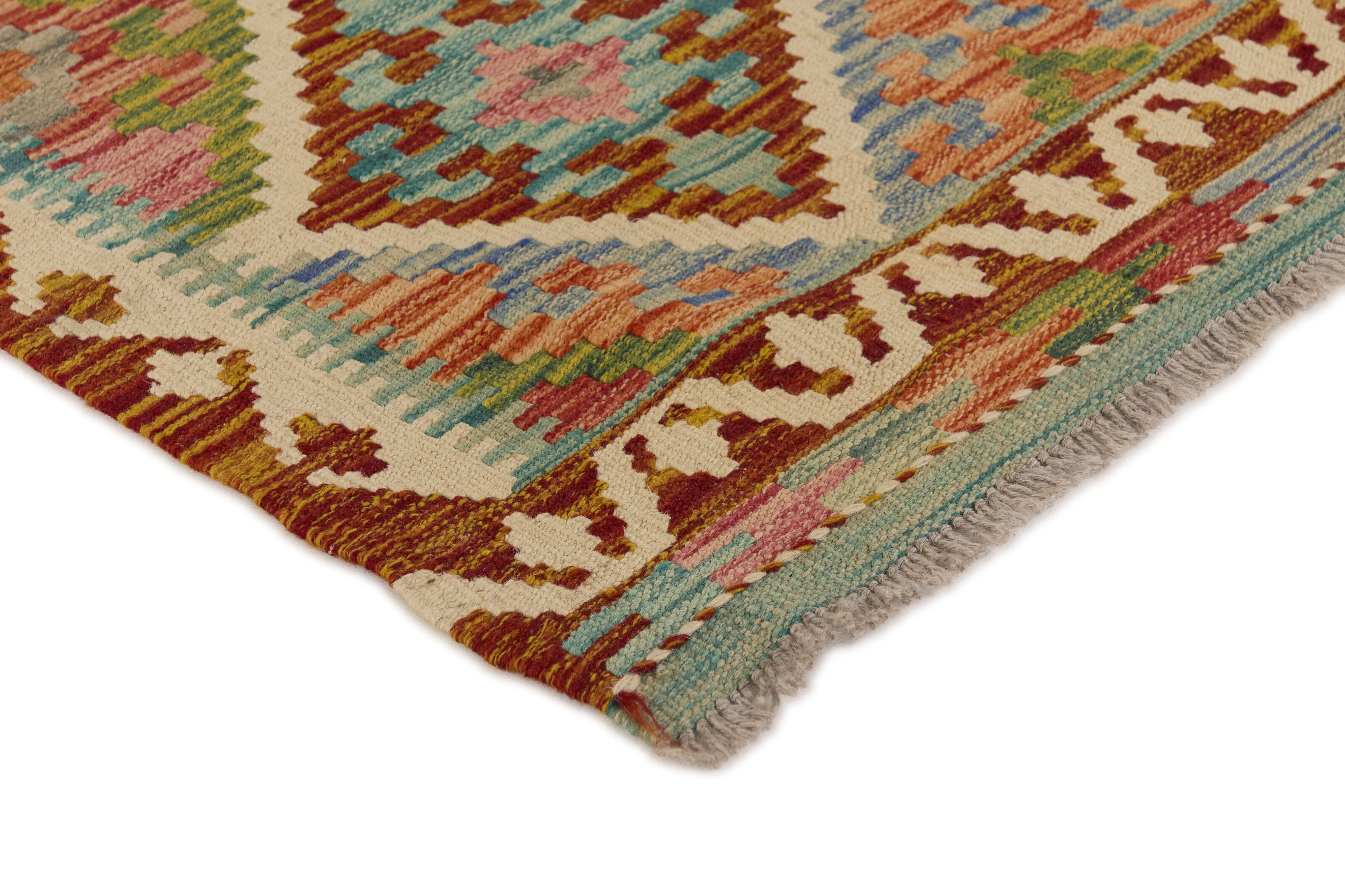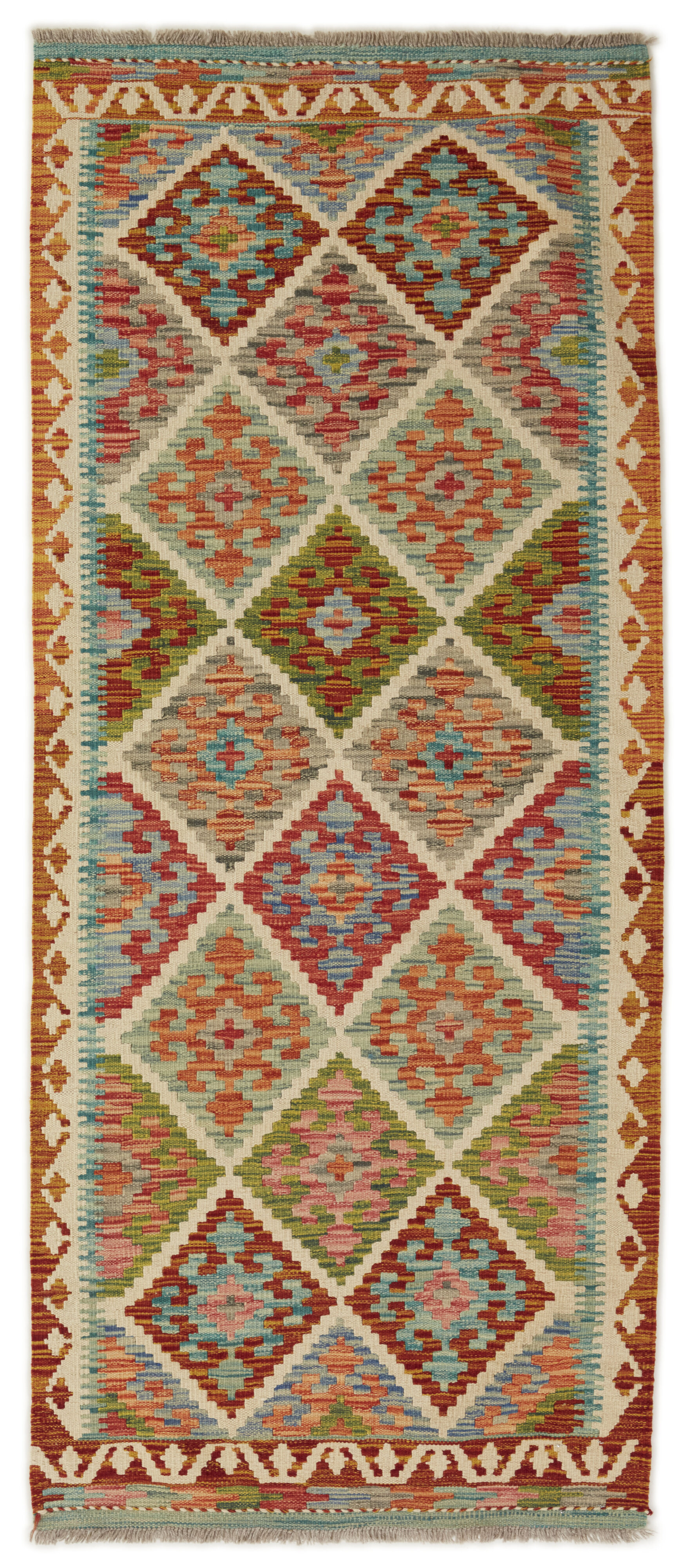 Afghan KelimItem no.: 1521639 Size: 85 cm x 200 cmAfghan Kelim rugs are hand woven by Turkmens in northern Afghanistan. Kelim is the name of a common Persian weave, but also of the technology used in the production. Kelims are primarily produced by nomads and are pile-less rugs, which are also used for bags, as wall decoration, or as curtains for tents. A natural colour scale with geometrical symbols and octagons is used.