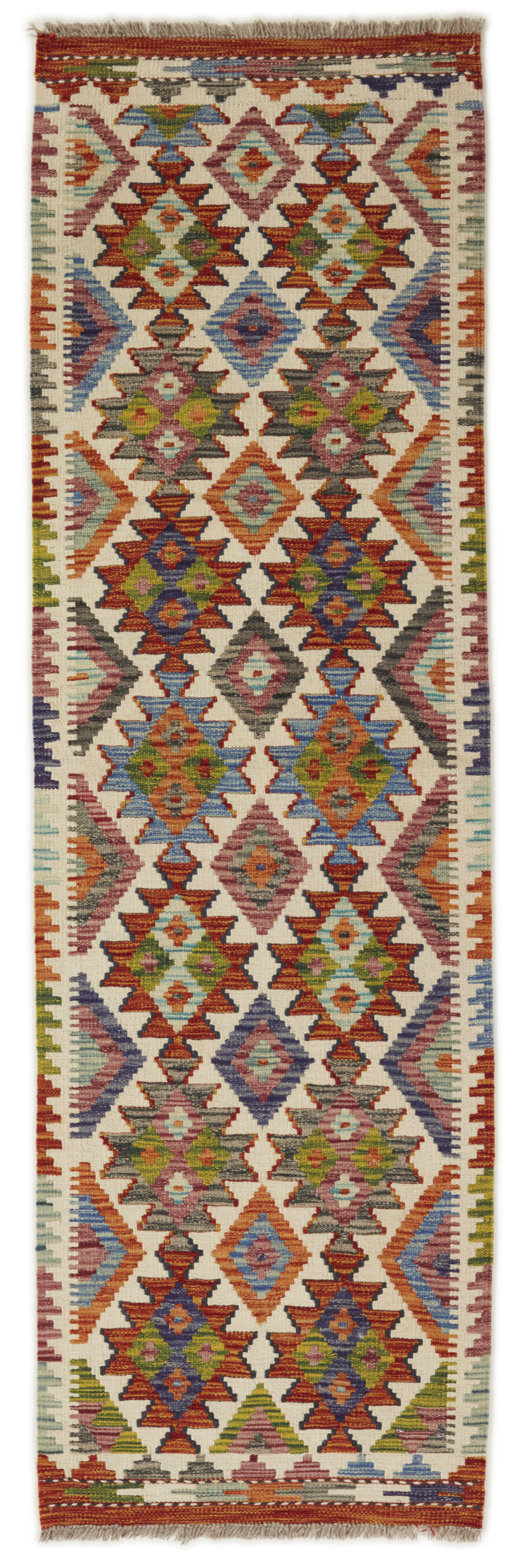 Afghan KelimItem no.: 1521642 Size: 60 cm x 200 cmAfghan Kelim rugs are hand woven by Turkmens in northern Afghanistan. Kelim is the name of a common Persian weave, but also of the technology used in the production. Kelims are primarily produced by nomads and are pile-less rugs, which are also used for bags, as wall decoration, or as curtains for tents. A natural colour scale with geometrical symbols and octagons is used.