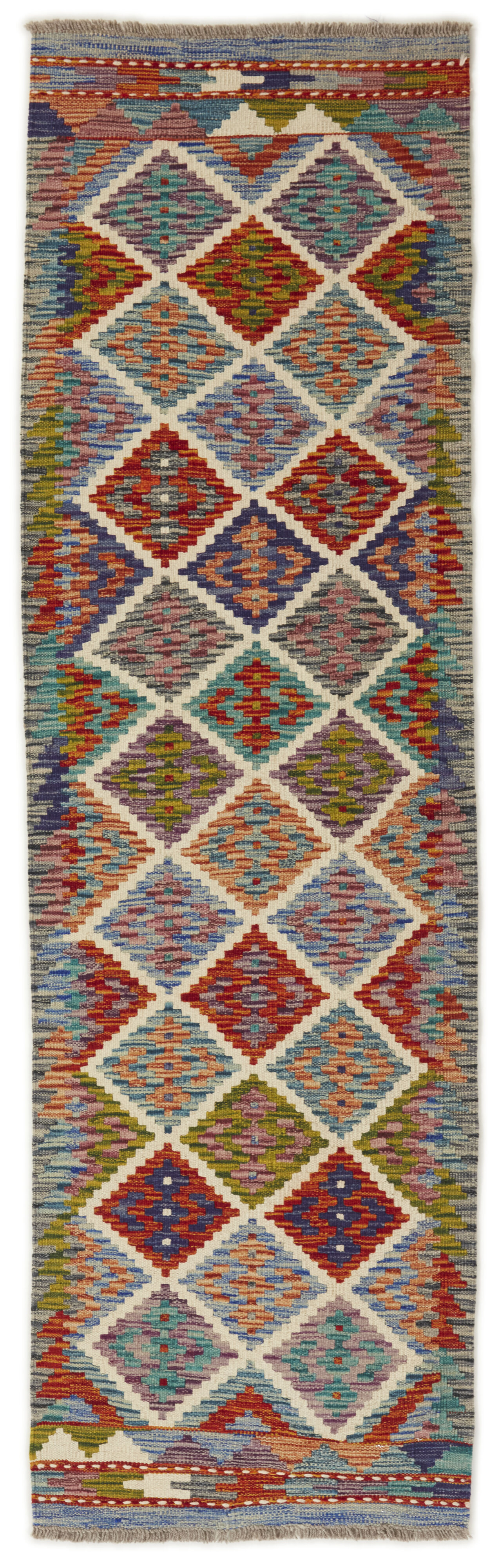 Afghan KelimItem no.: 1521648 Size: 61 cm x 204 cmAfghan Kelim rugs are hand woven by Turkmens in northern Afghanistan. Kelim is the name of a common Persian weave, but also of the technology used in the production. Kelims are primarily produced by nomads and are pile-less rugs, which are also used for bags, as wall decoration, or as curtains for tents. A natural colour scale with geometrical symbols and octagons is used.