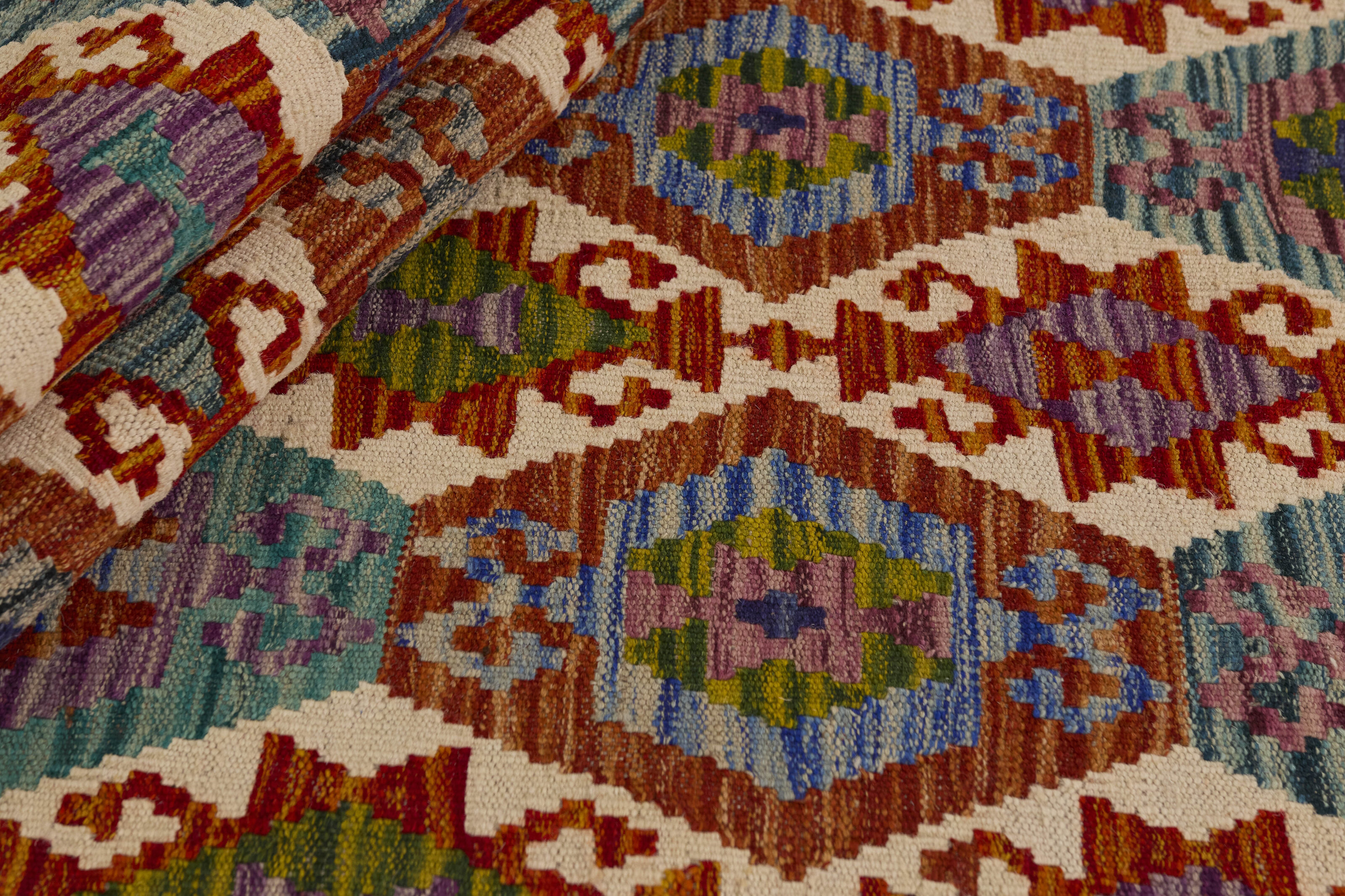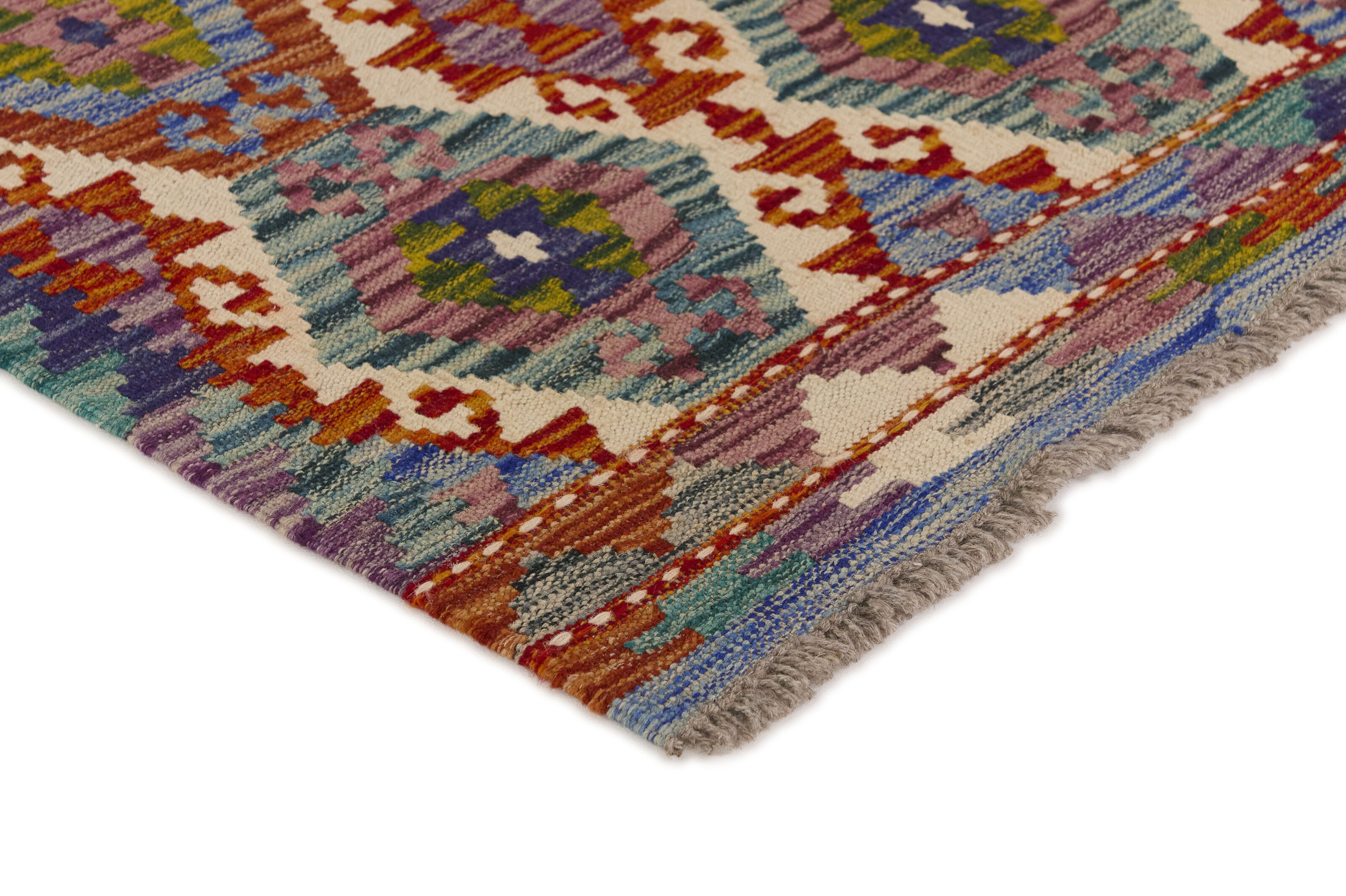 Afghan KelimItem no.: 1521650 Size: 63 cm x 207 cmAfghan Kelim rugs are hand woven by Turkmens in northern Afghanistan. Kelim is the name of a common Persian weave, but also of the technology used in the production. Kelims are primarily produced by nomads and are pile-less rugs, which are also used for bags, as wall decoration, or as curtains for tents. A natural colour scale with geometrical symbols and octagons is used.