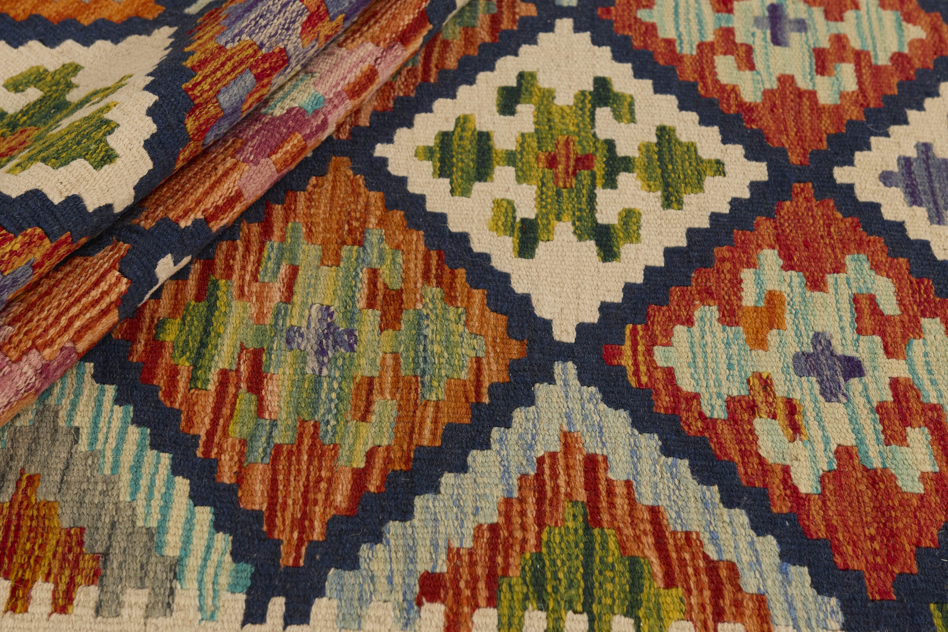 Afghan KelimItem no.: 1521652 Size: 78 cm x 208 cmAfghan Kelim rugs are hand woven by Turkmens in northern Afghanistan. Kelim is the name of a common Persian weave, but also of the technology used in the production. Kelims are primarily produced by nomads and are pile-less rugs, which are also used for bags, as wall decoration, or as curtains for tents. A natural colour scale with geometrical symbols and octagons is used.